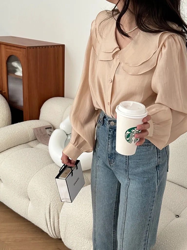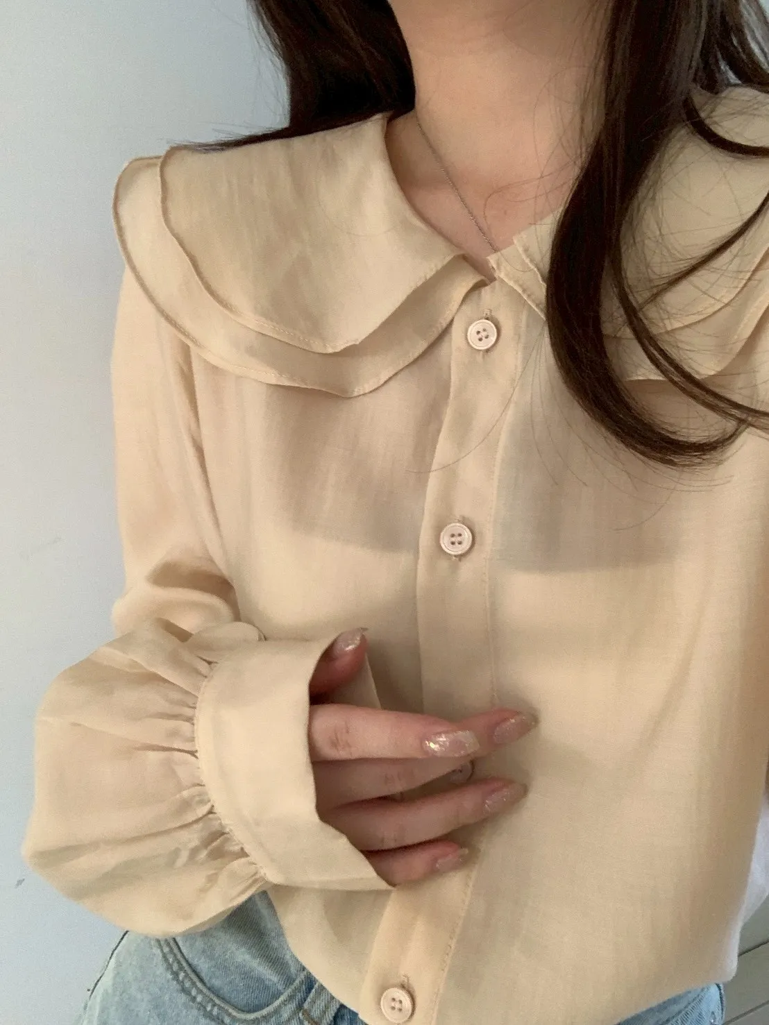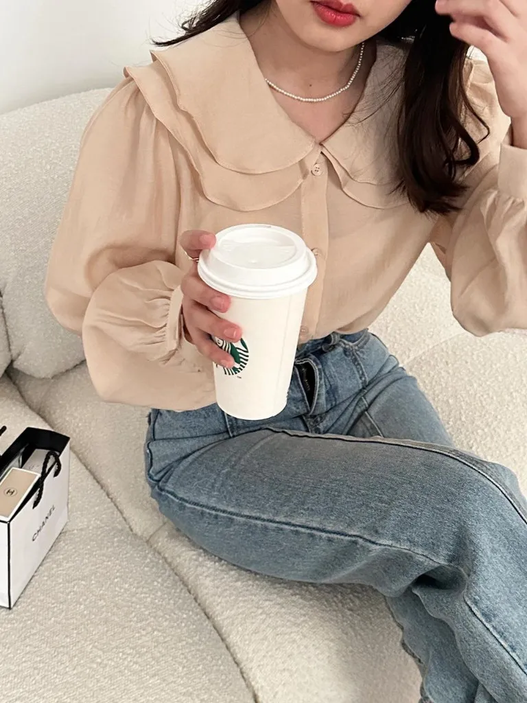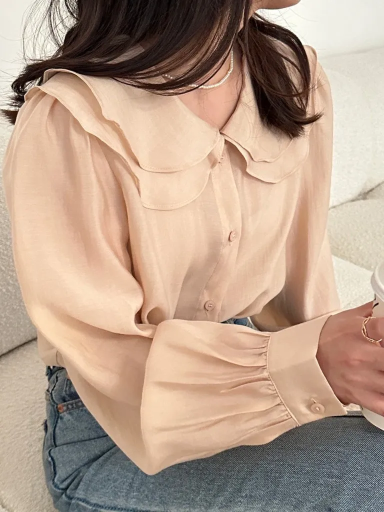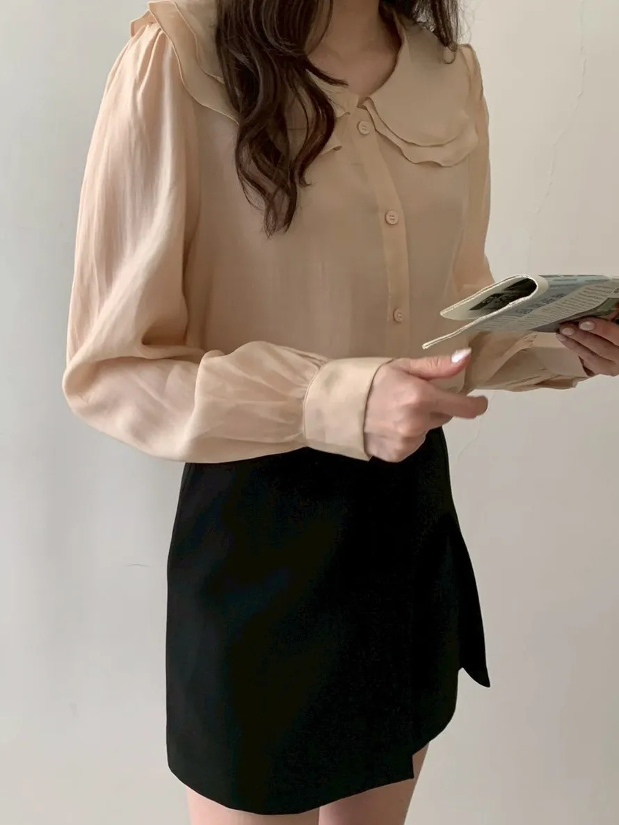 雙層荷葉圓領排釦雪紡上衣