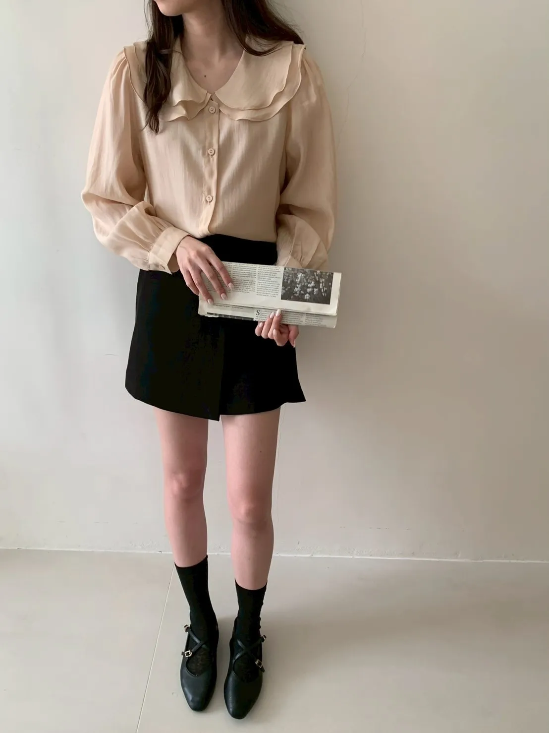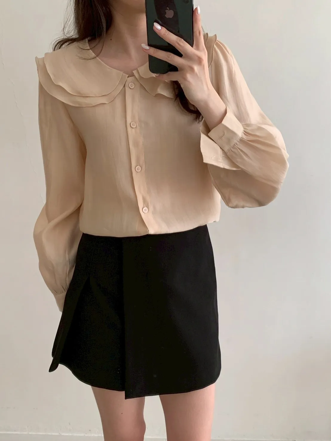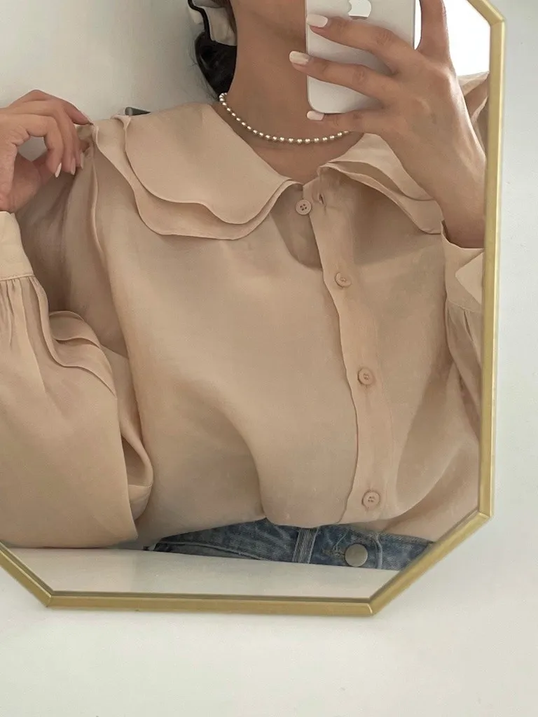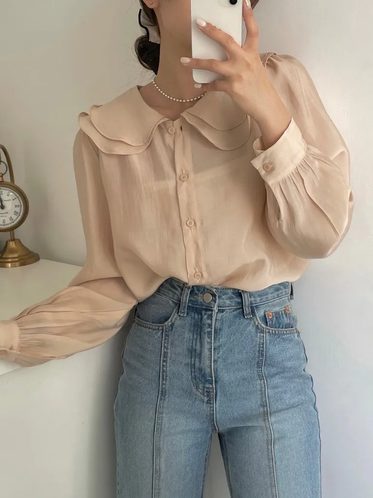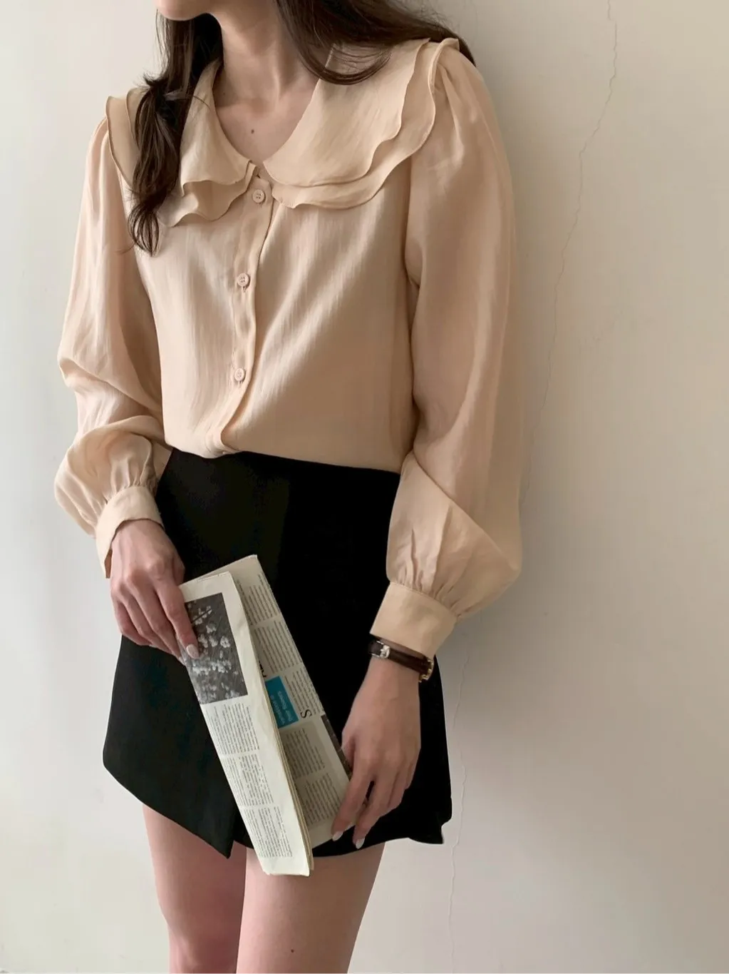 雙層荷葉圓領排釦雪紡上衣