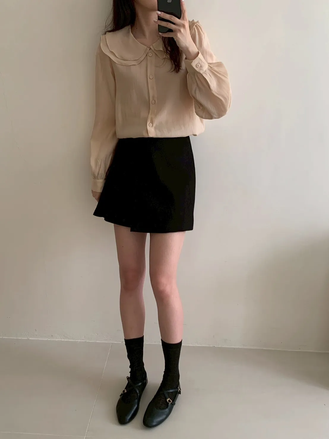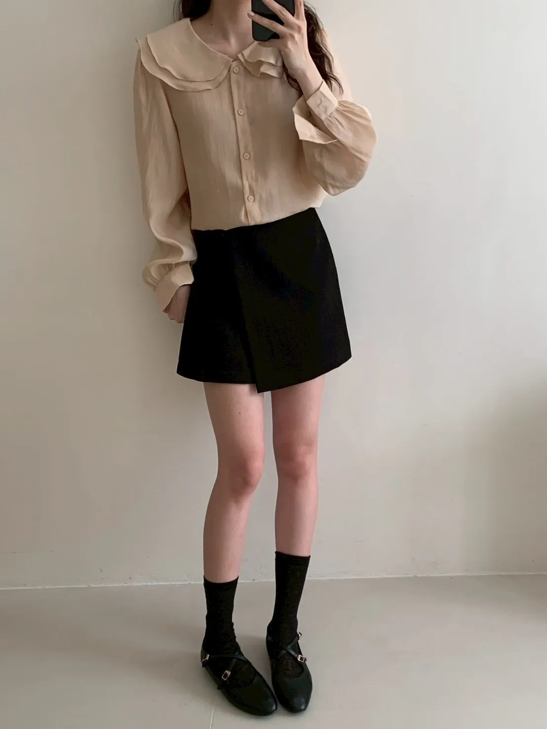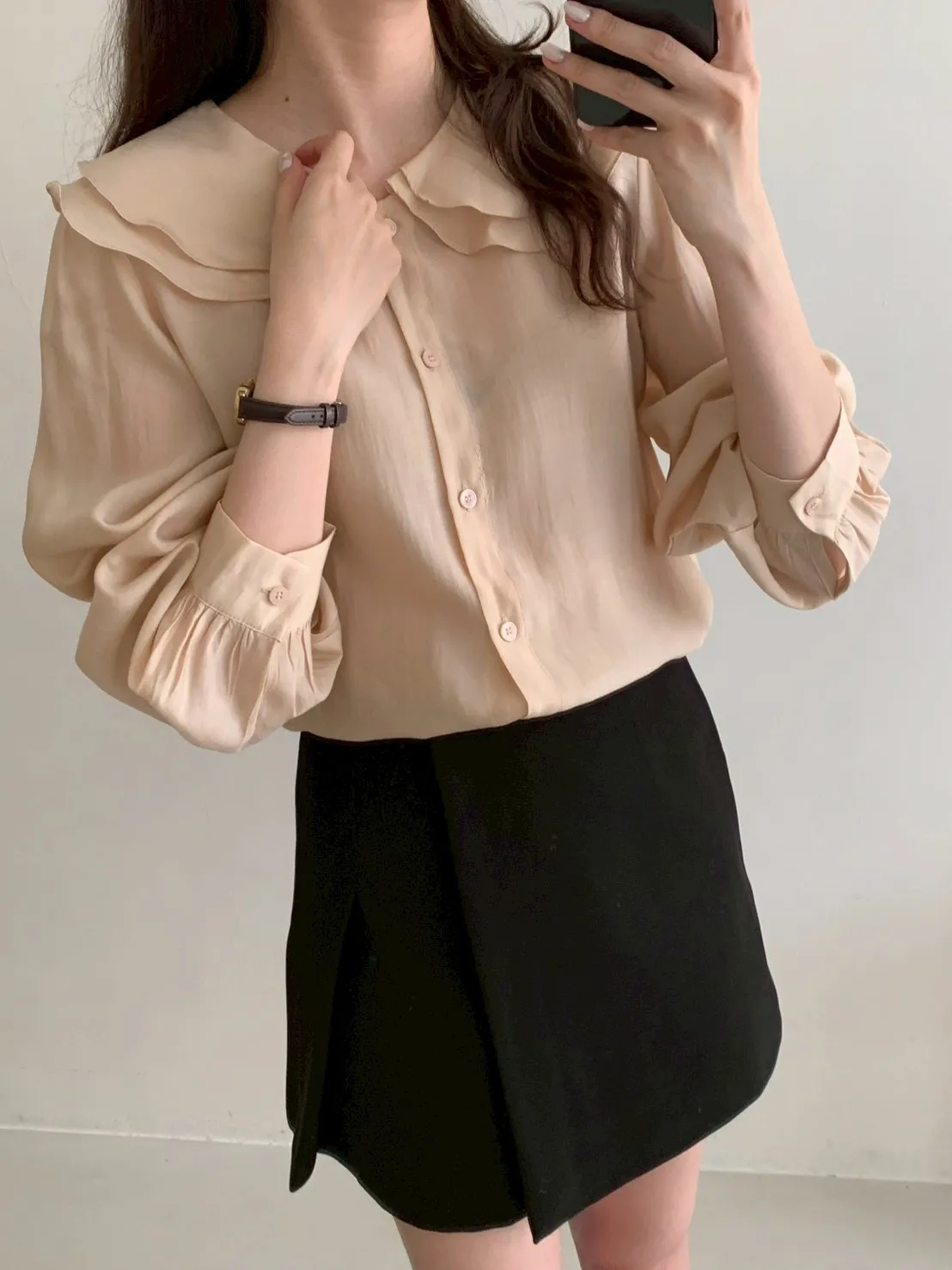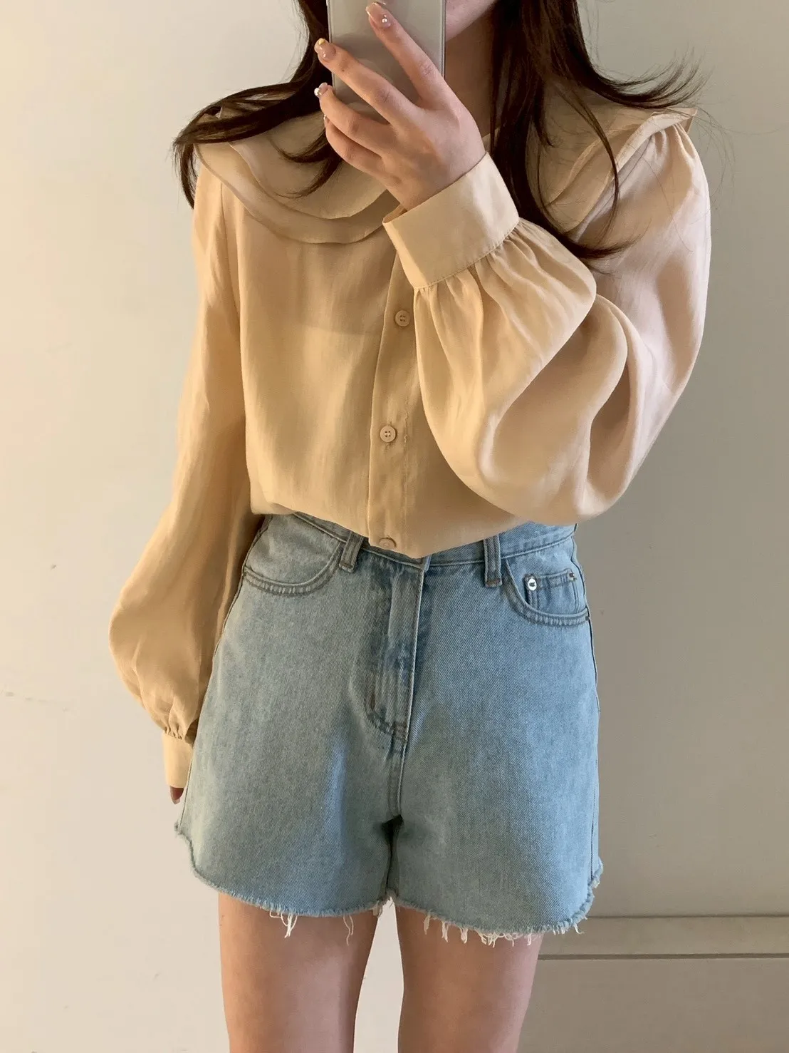 雙層荷葉圓領排釦雪紡上衣