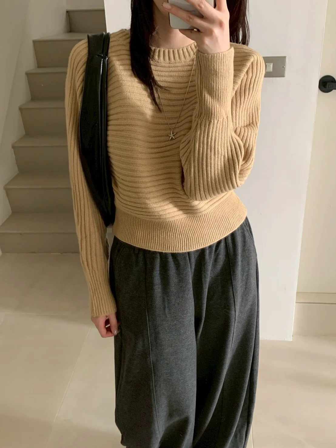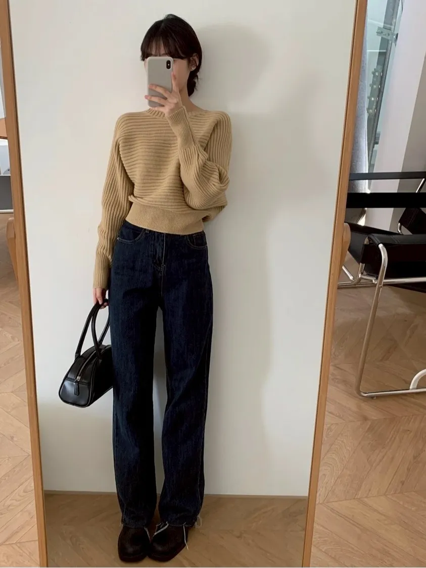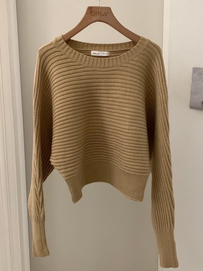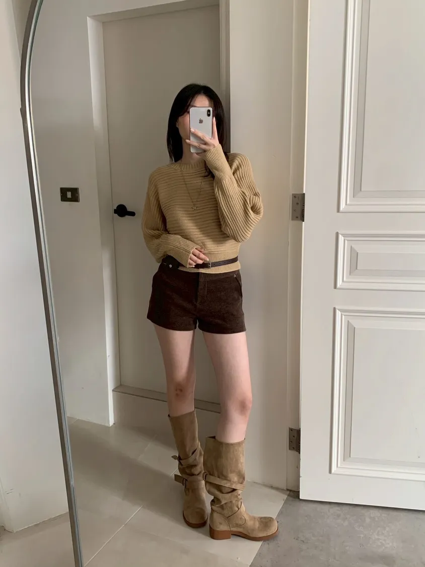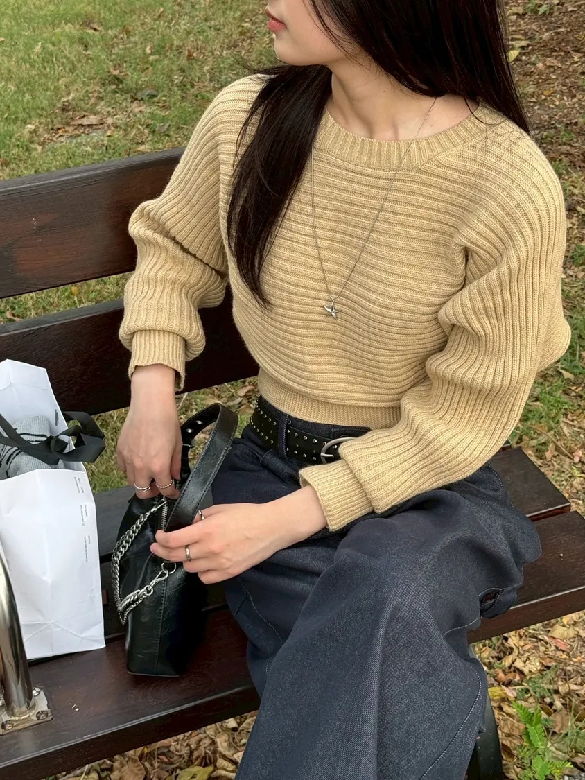 圓領橫條坑紋下縮短版針織毛衣