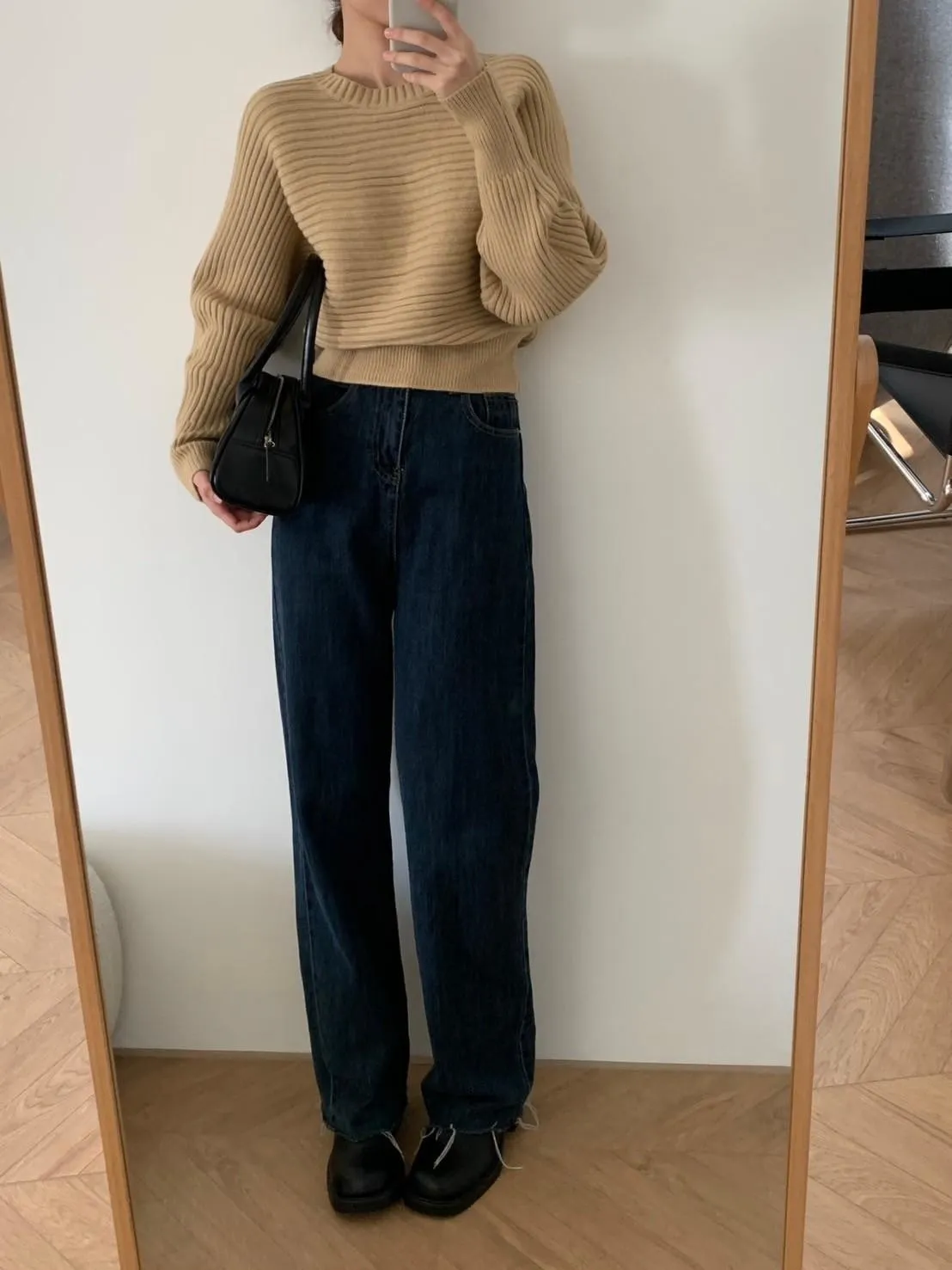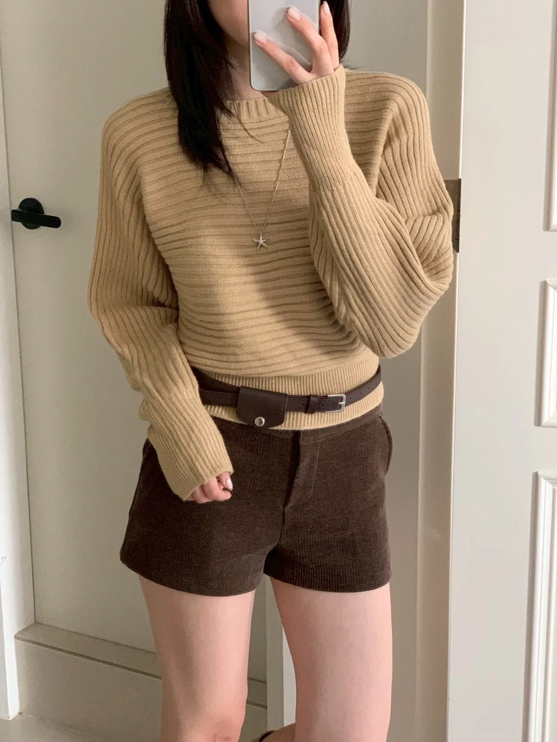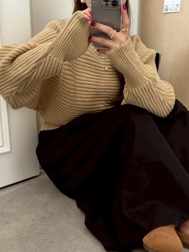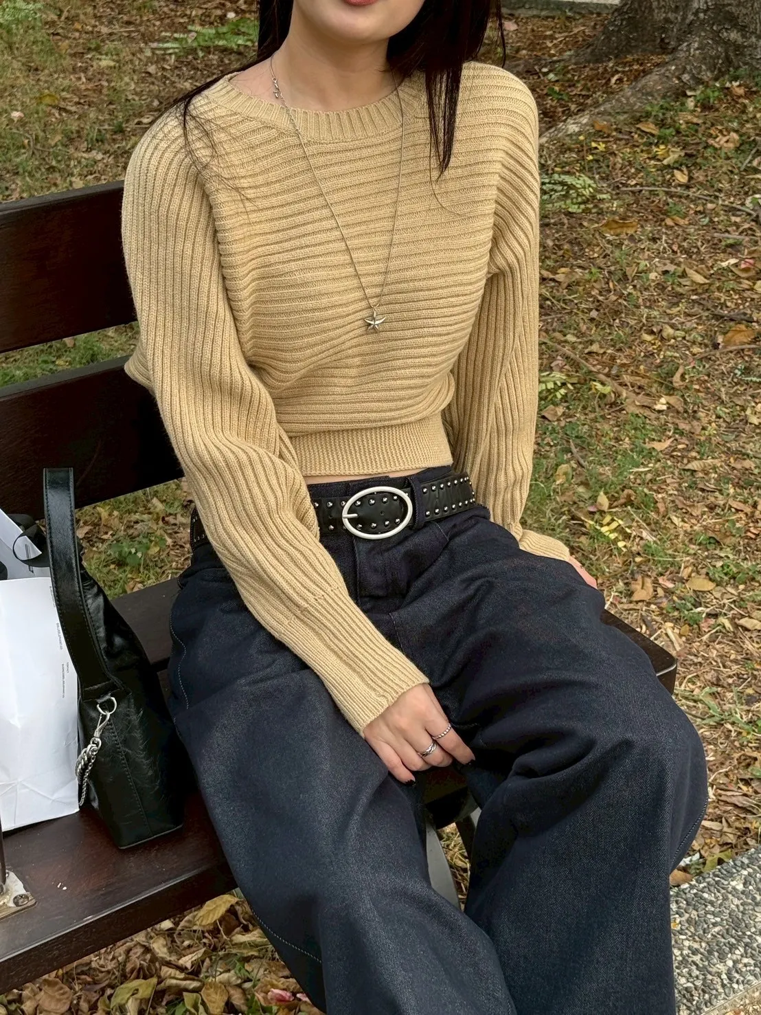 圓領橫條坑紋下縮短版針織毛衣