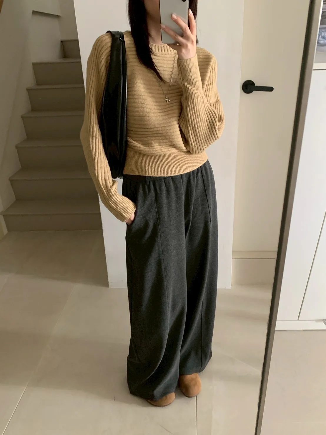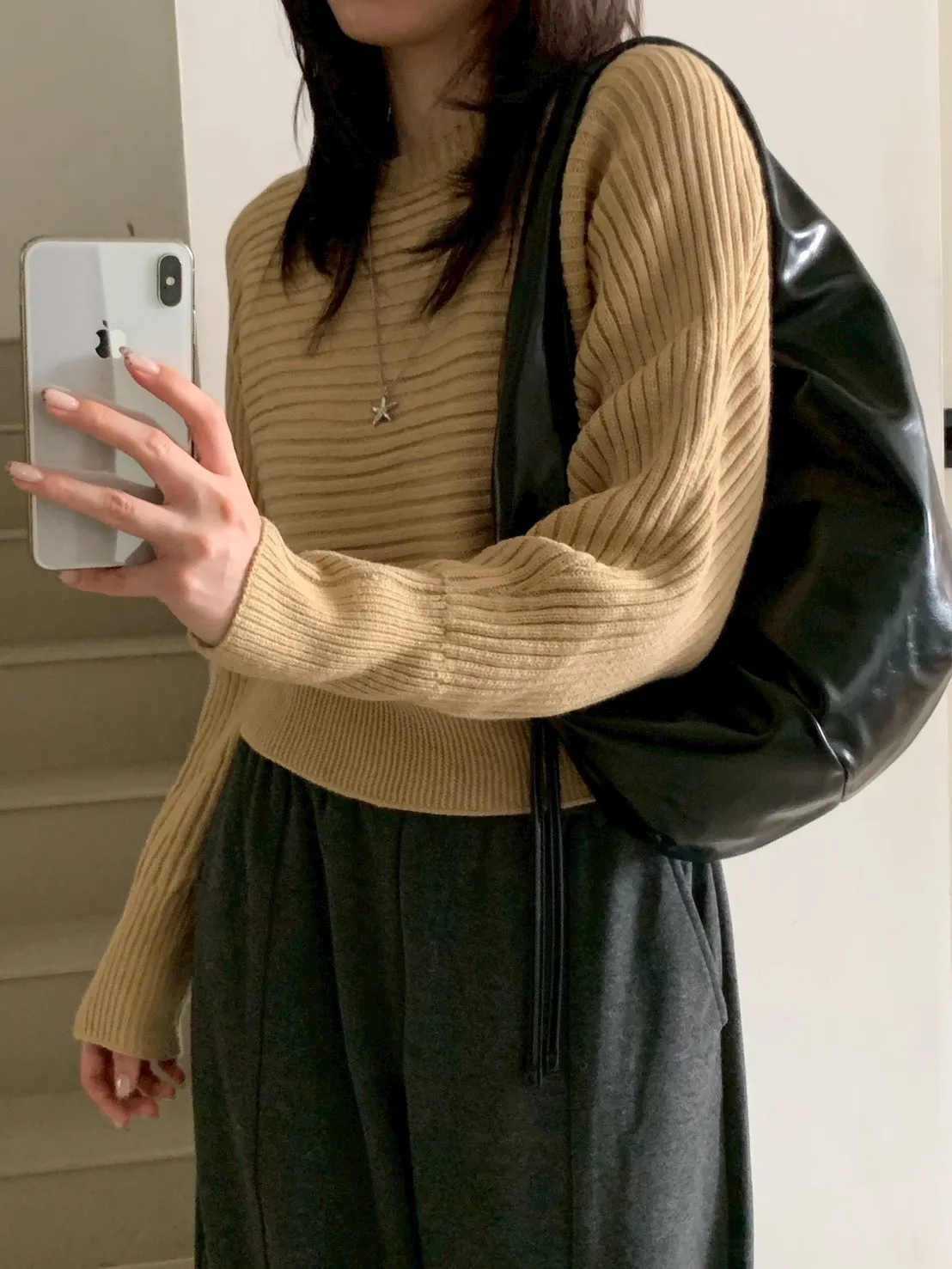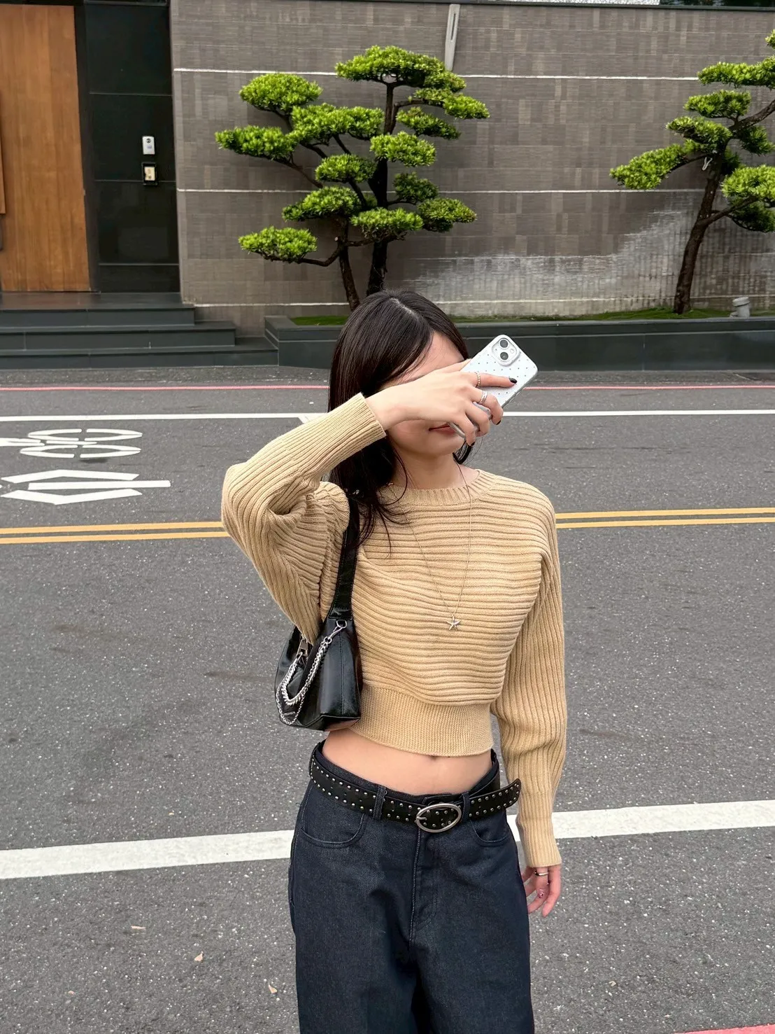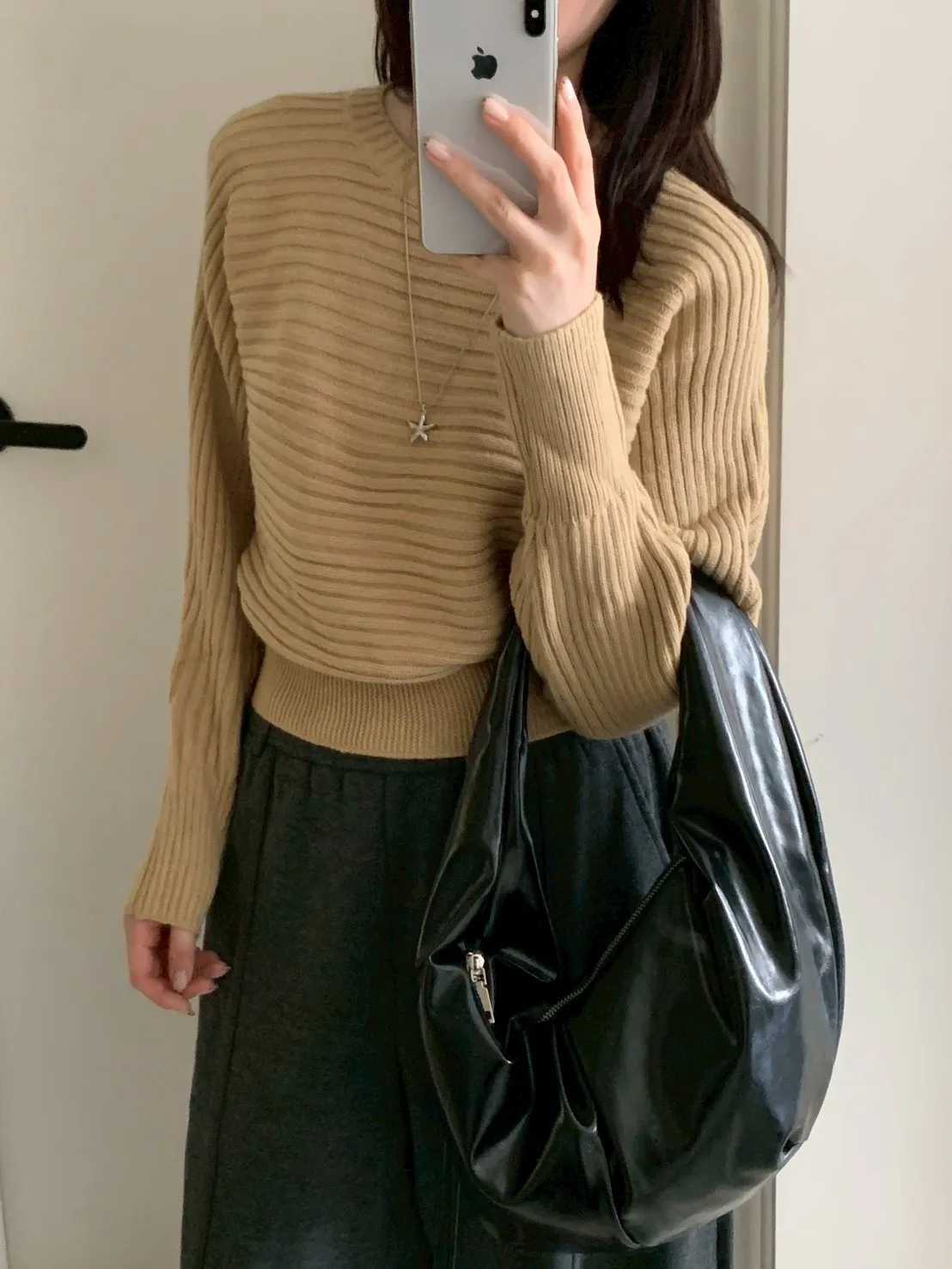 圓領橫條坑紋下縮短版針織毛衣