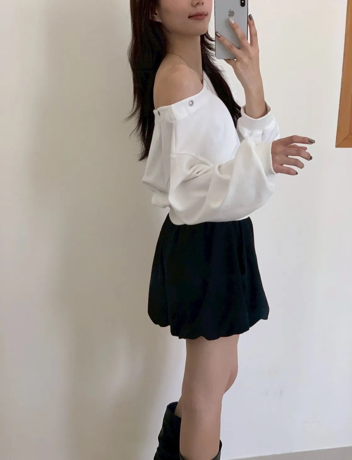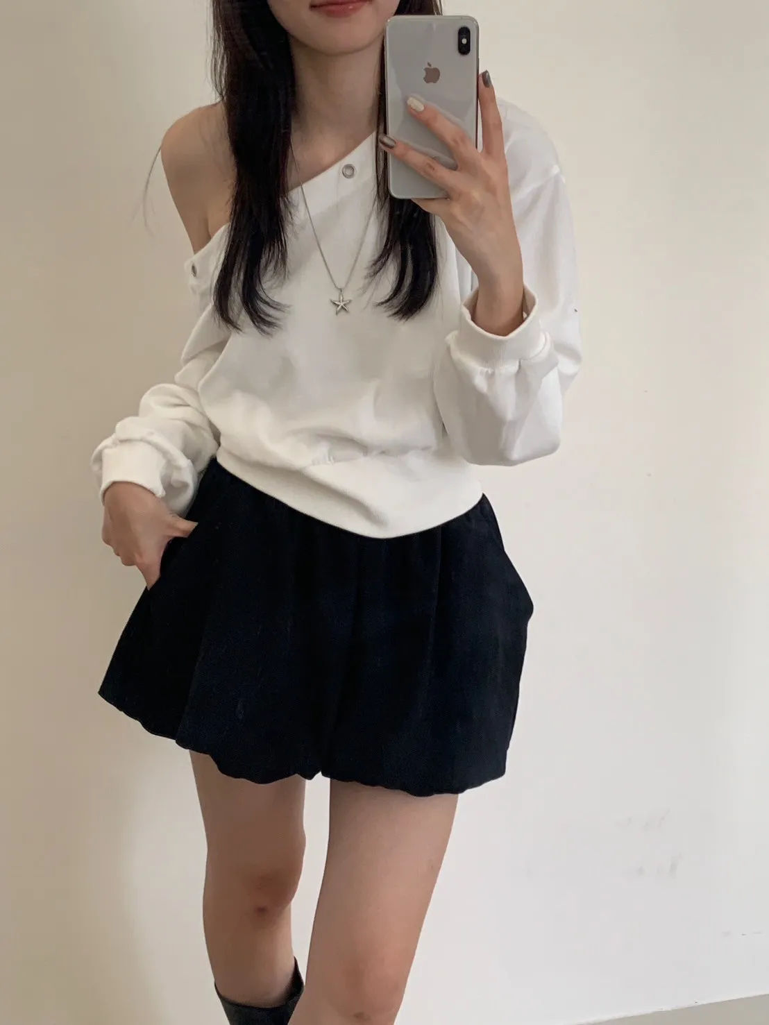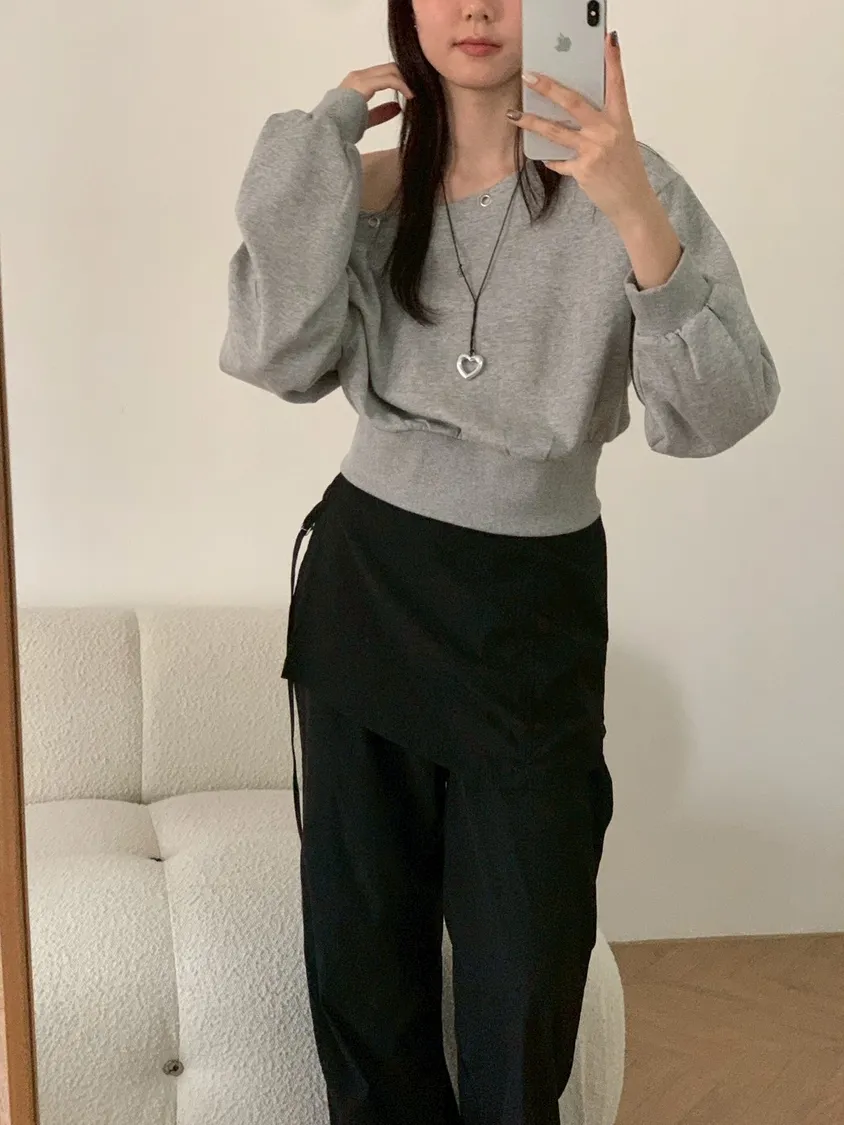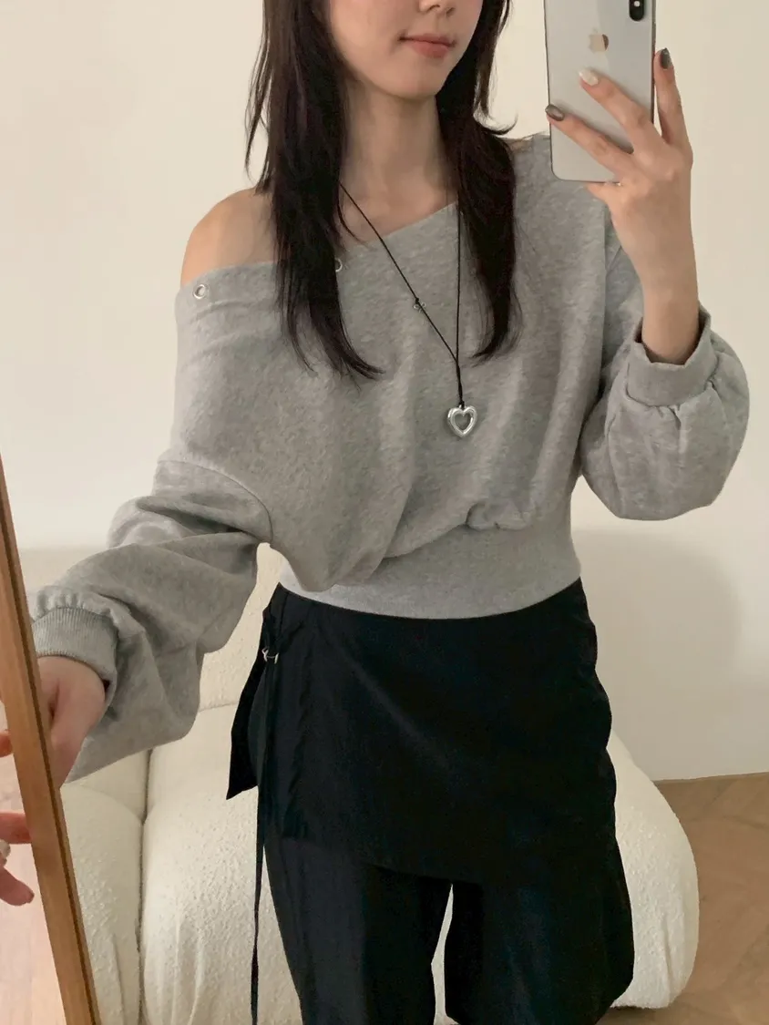 秋日顏值斜肩鉚釘短版棉T