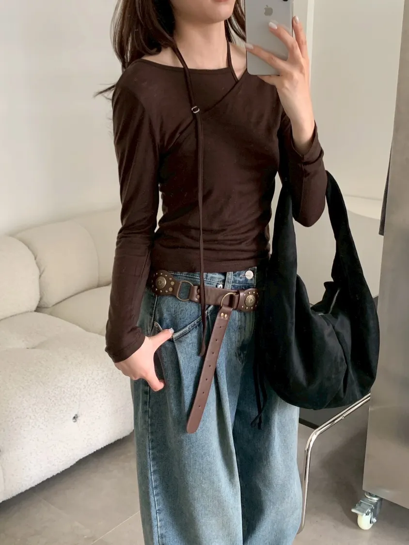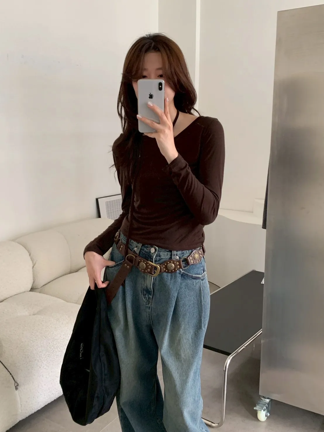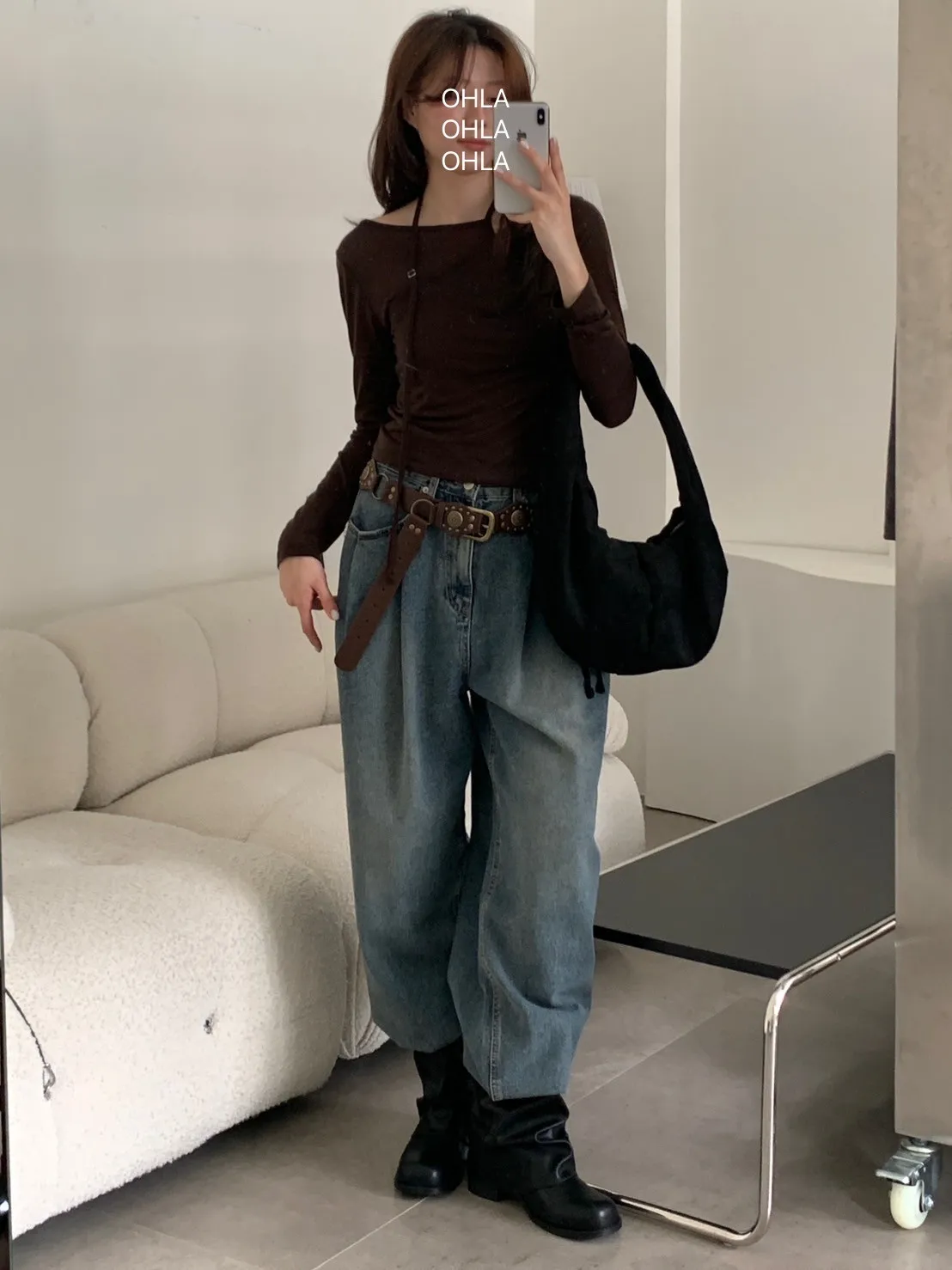 復古牛仔褲 附格紋絲巾掛包腰帶