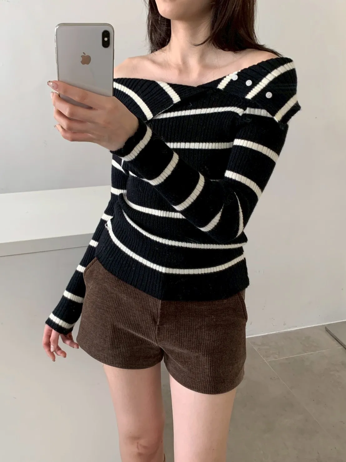 秋日薄霧斜肩橫條內刷毛上衣