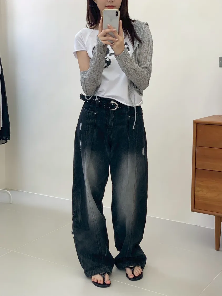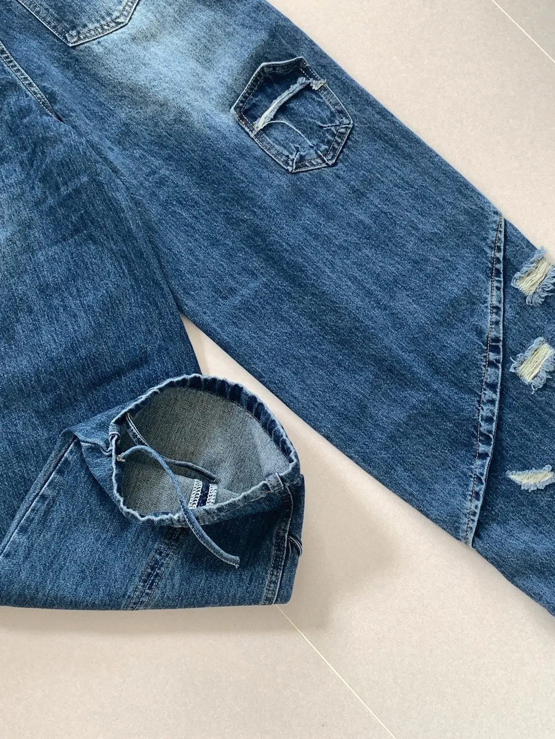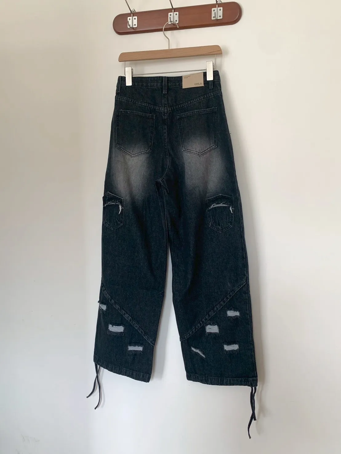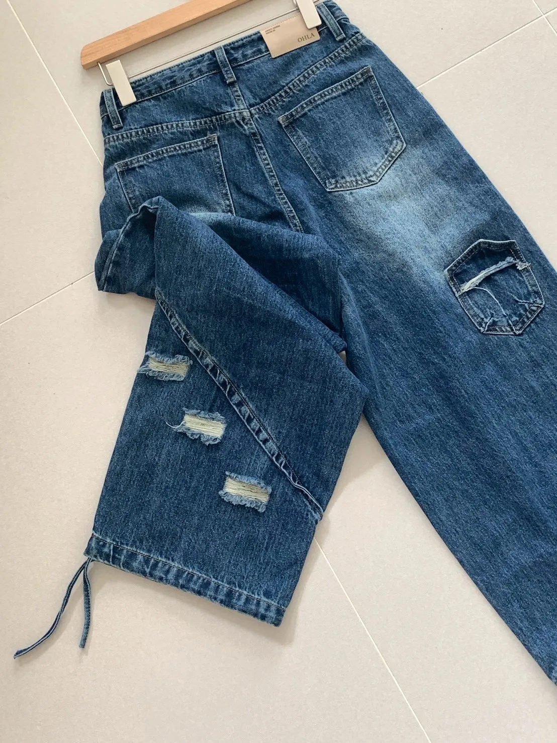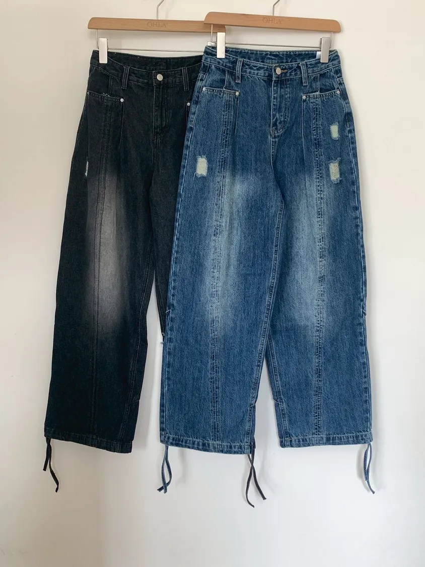 後腿小口袋鬚破褲管抽繩牛仔寬褲10912
