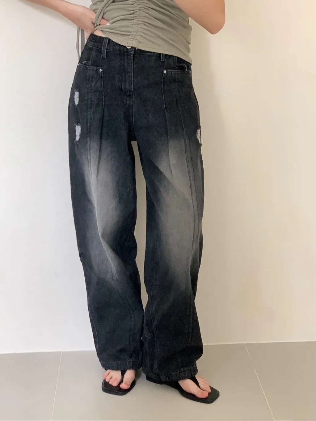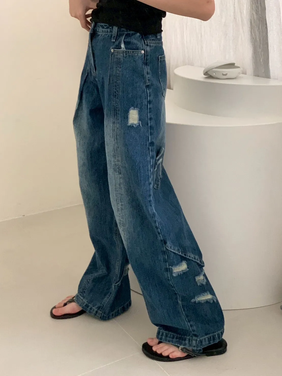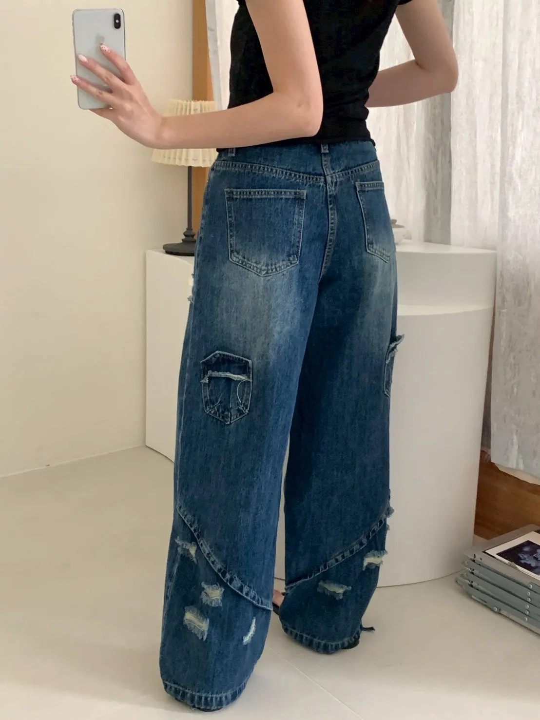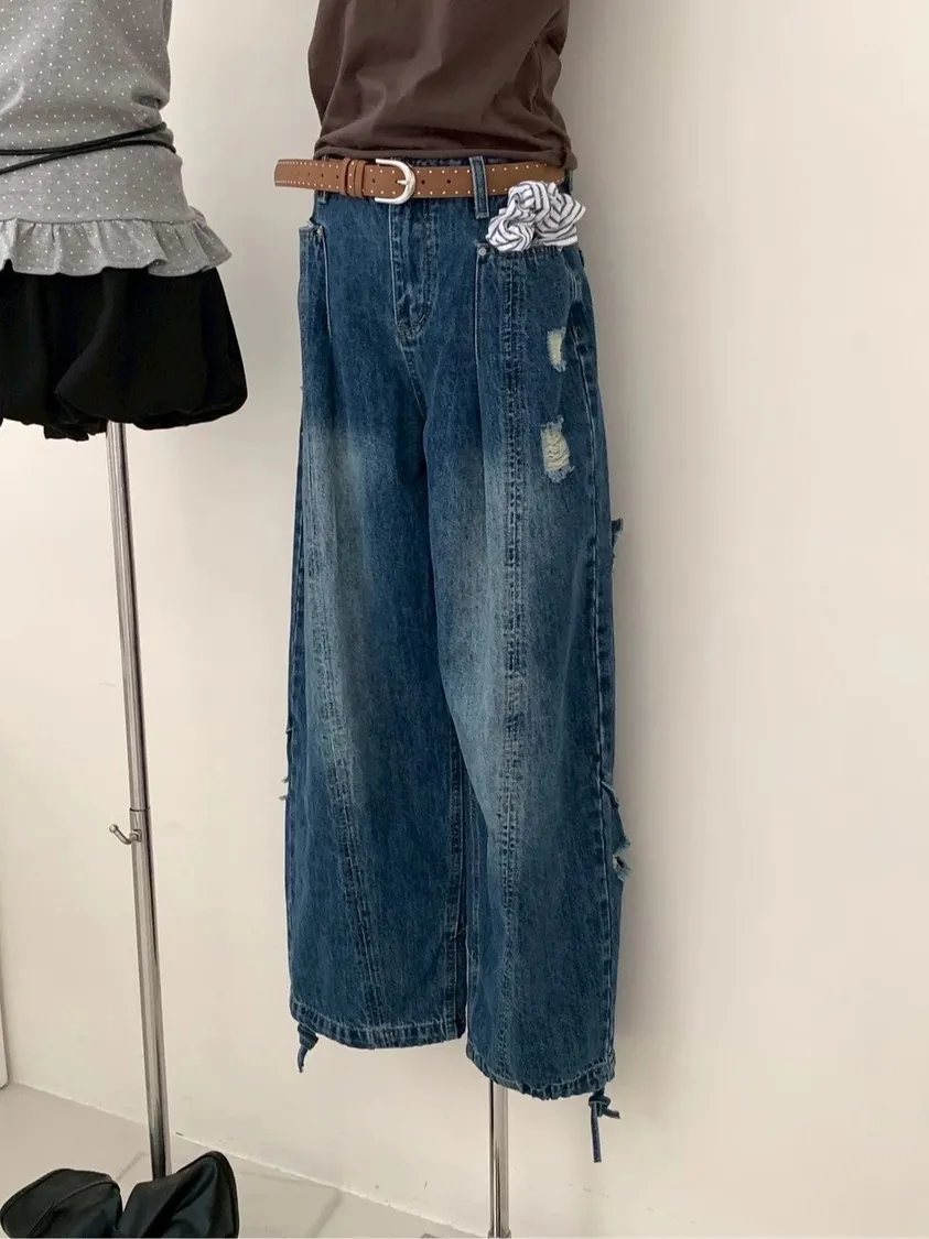 後腿小口袋鬚破褲管抽繩牛仔寬褲10912