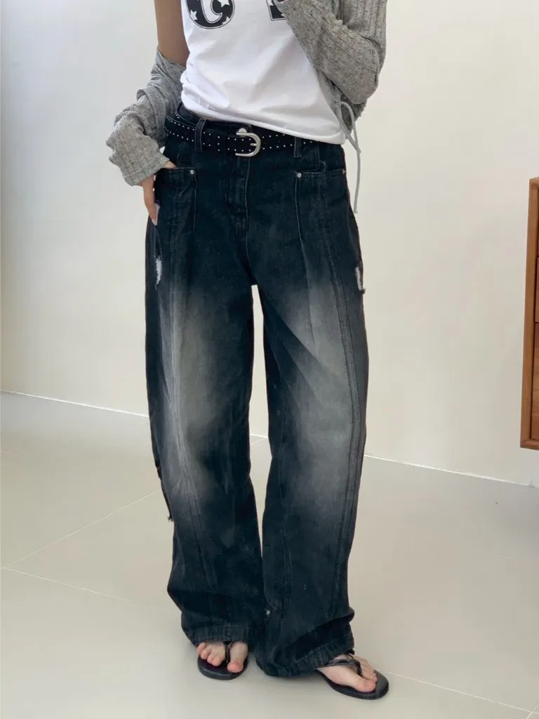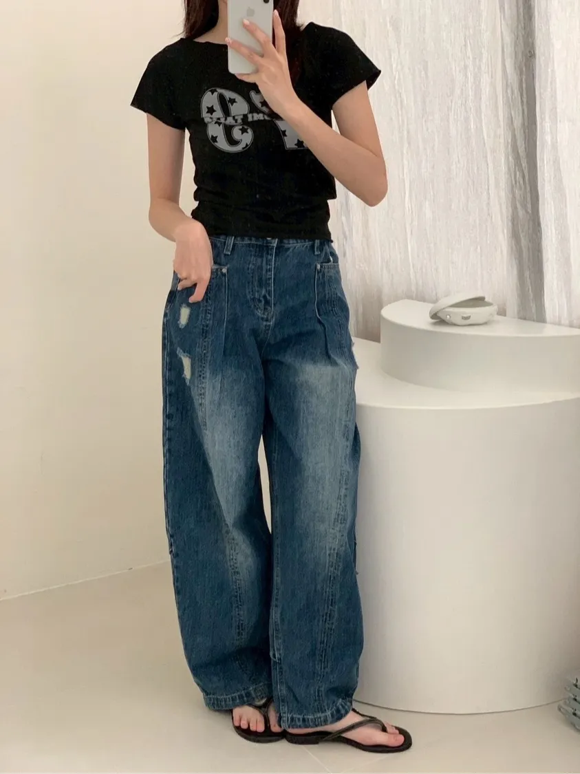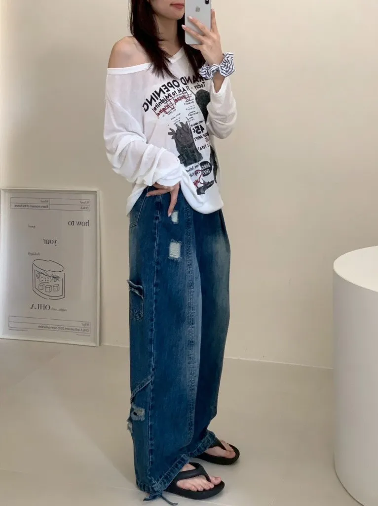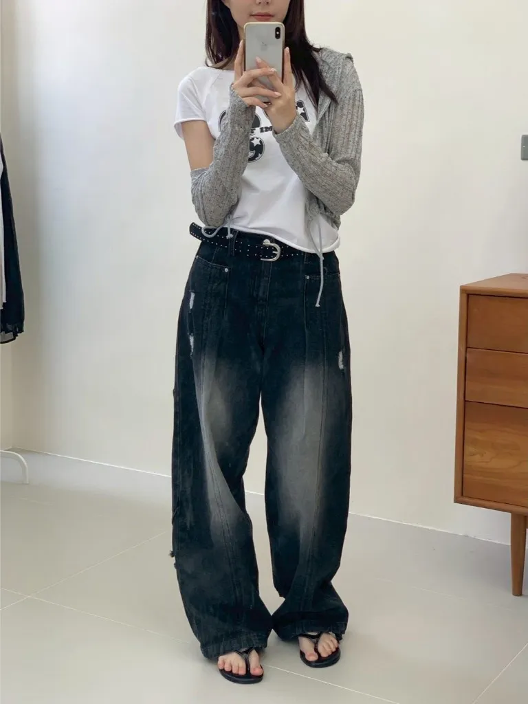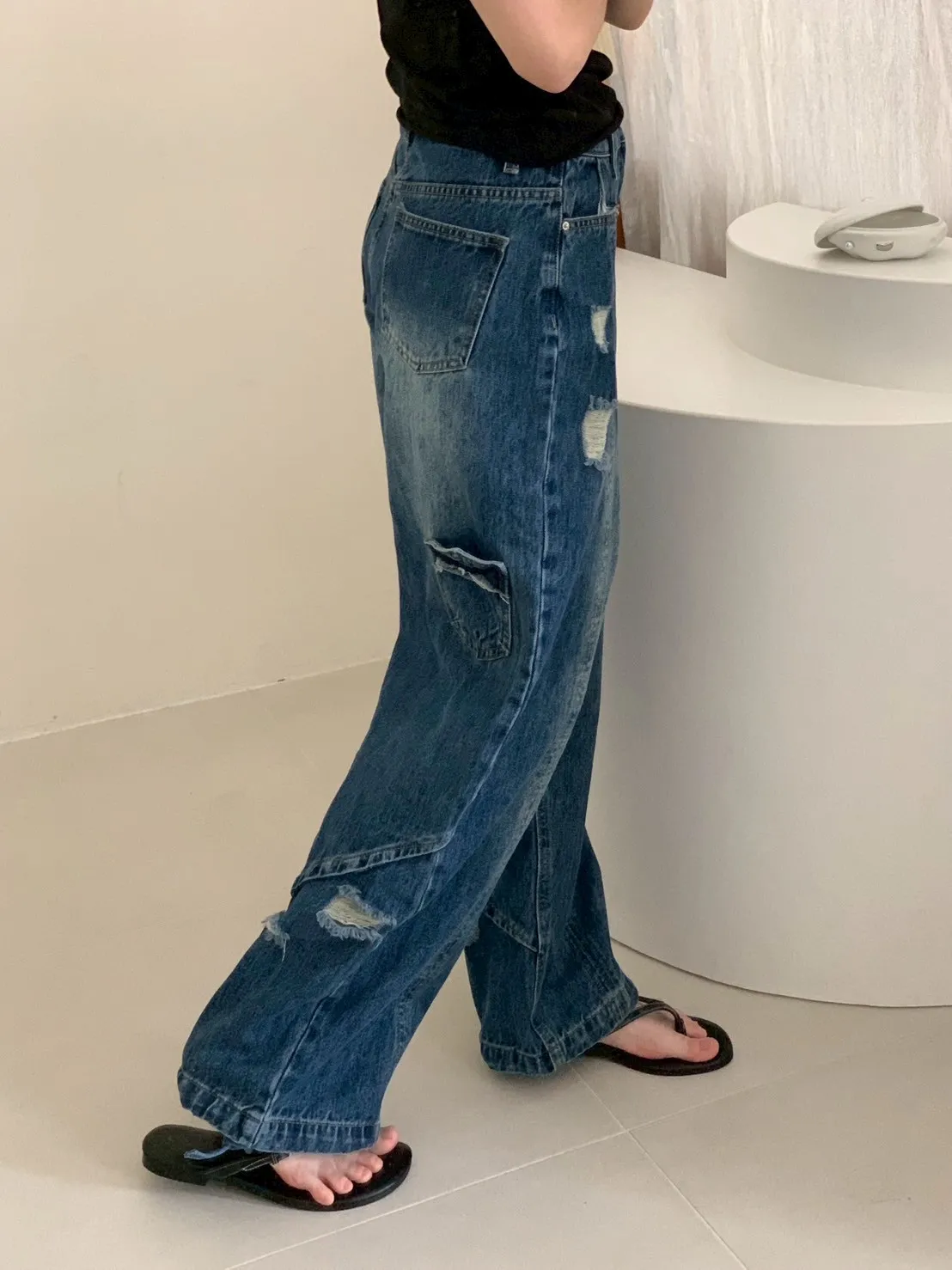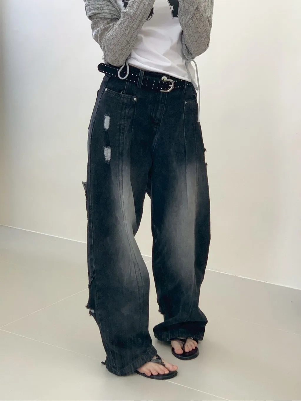 後腿小口袋鬚破褲管抽繩牛仔寬褲10912