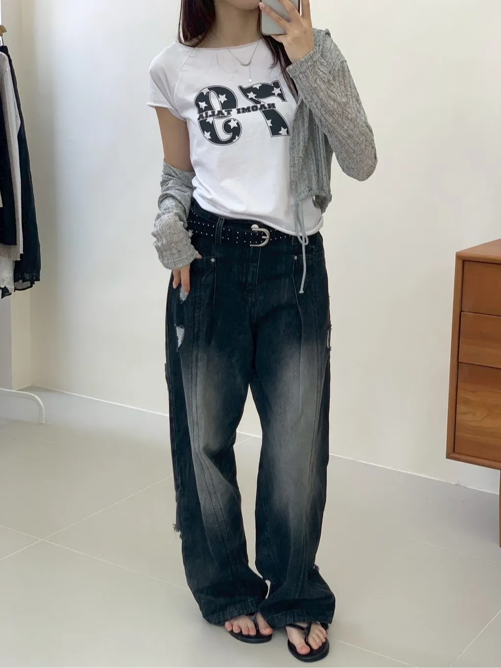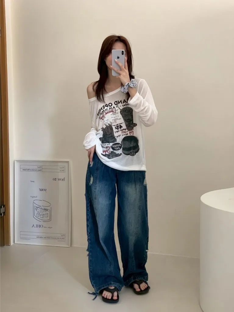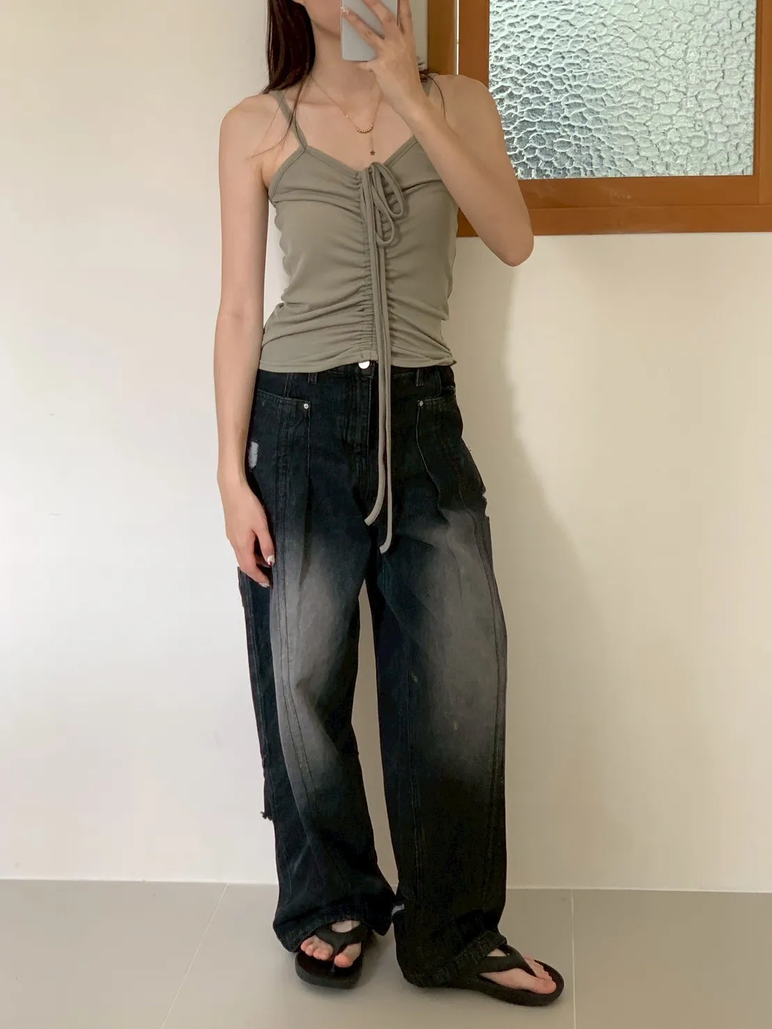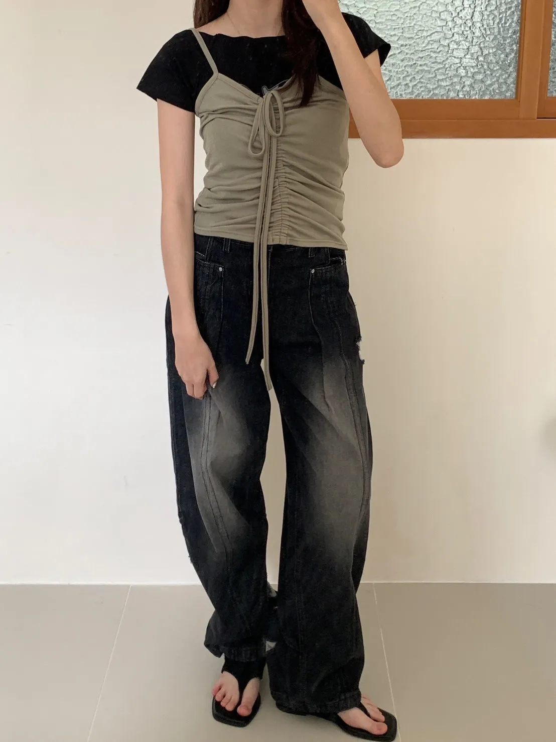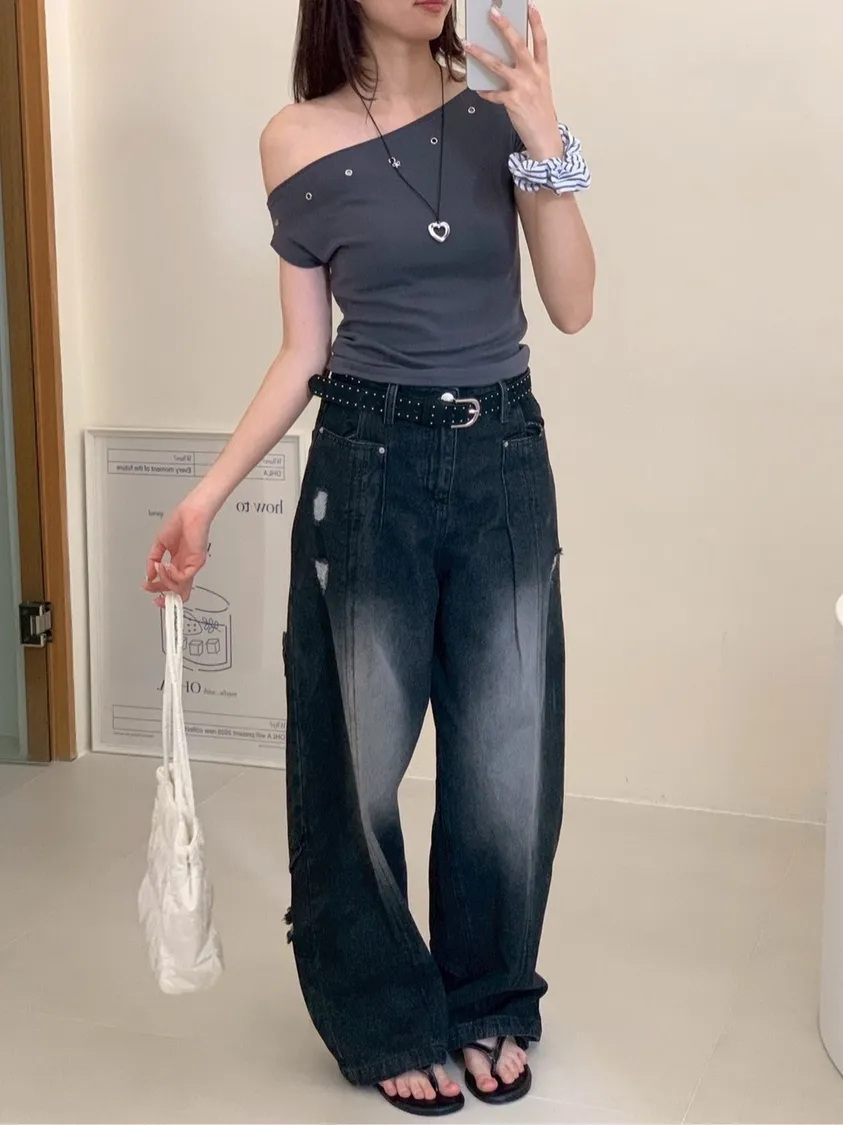 後腿小口袋鬚破褲管抽繩牛仔寬褲10912