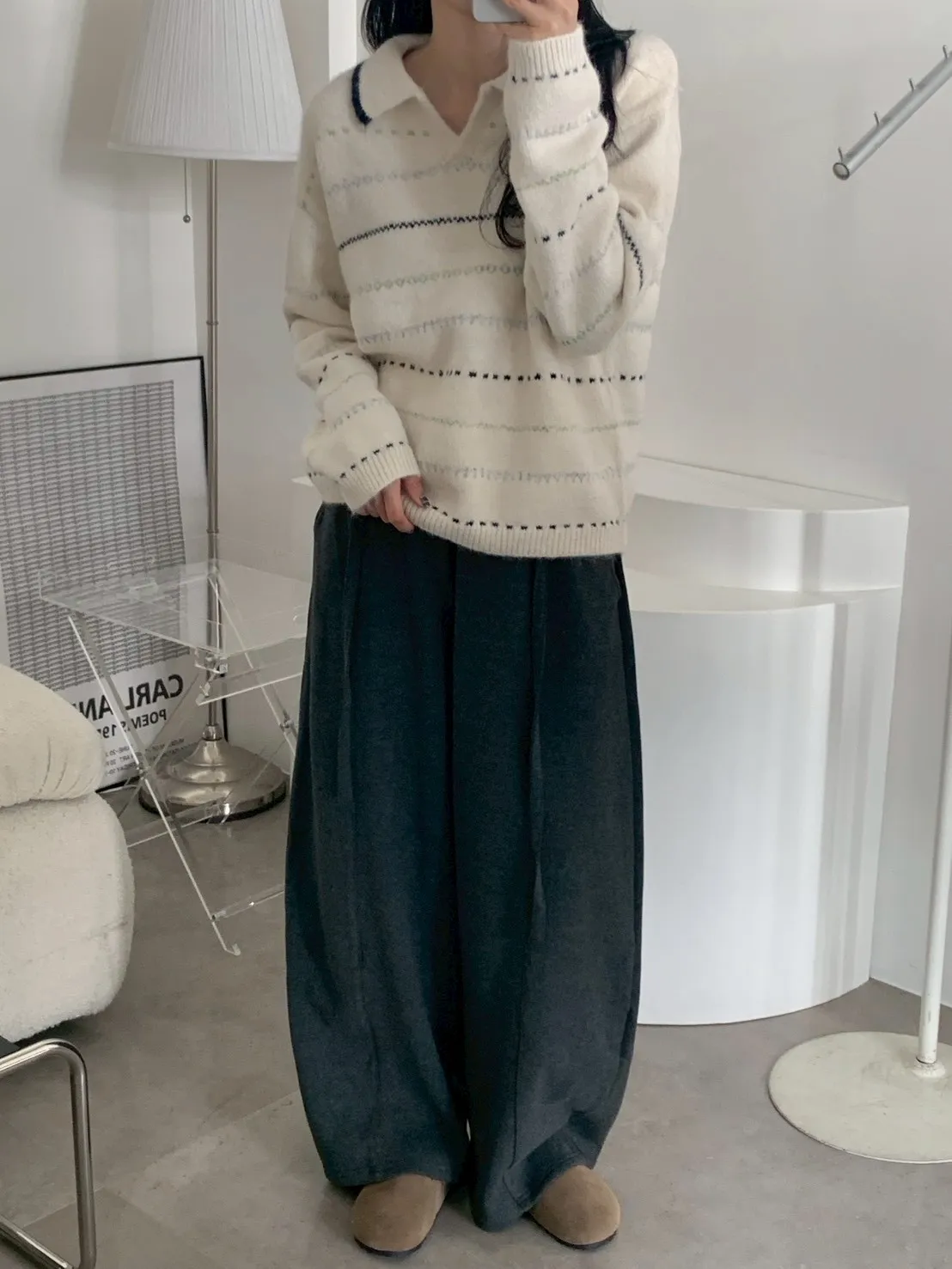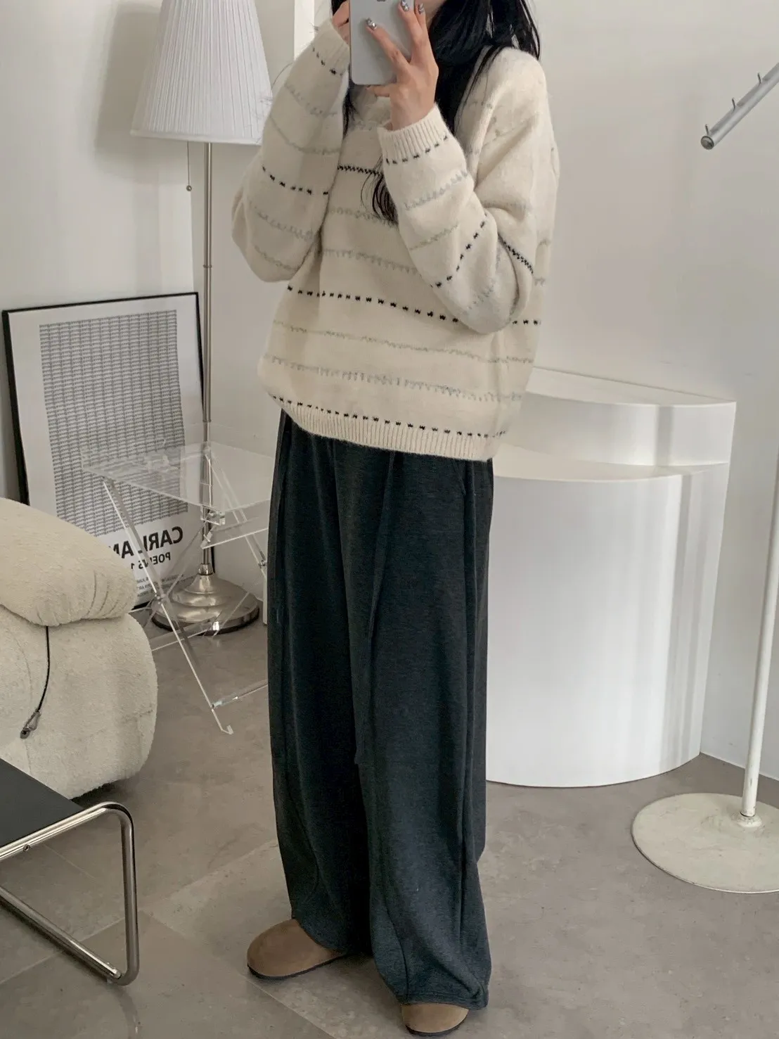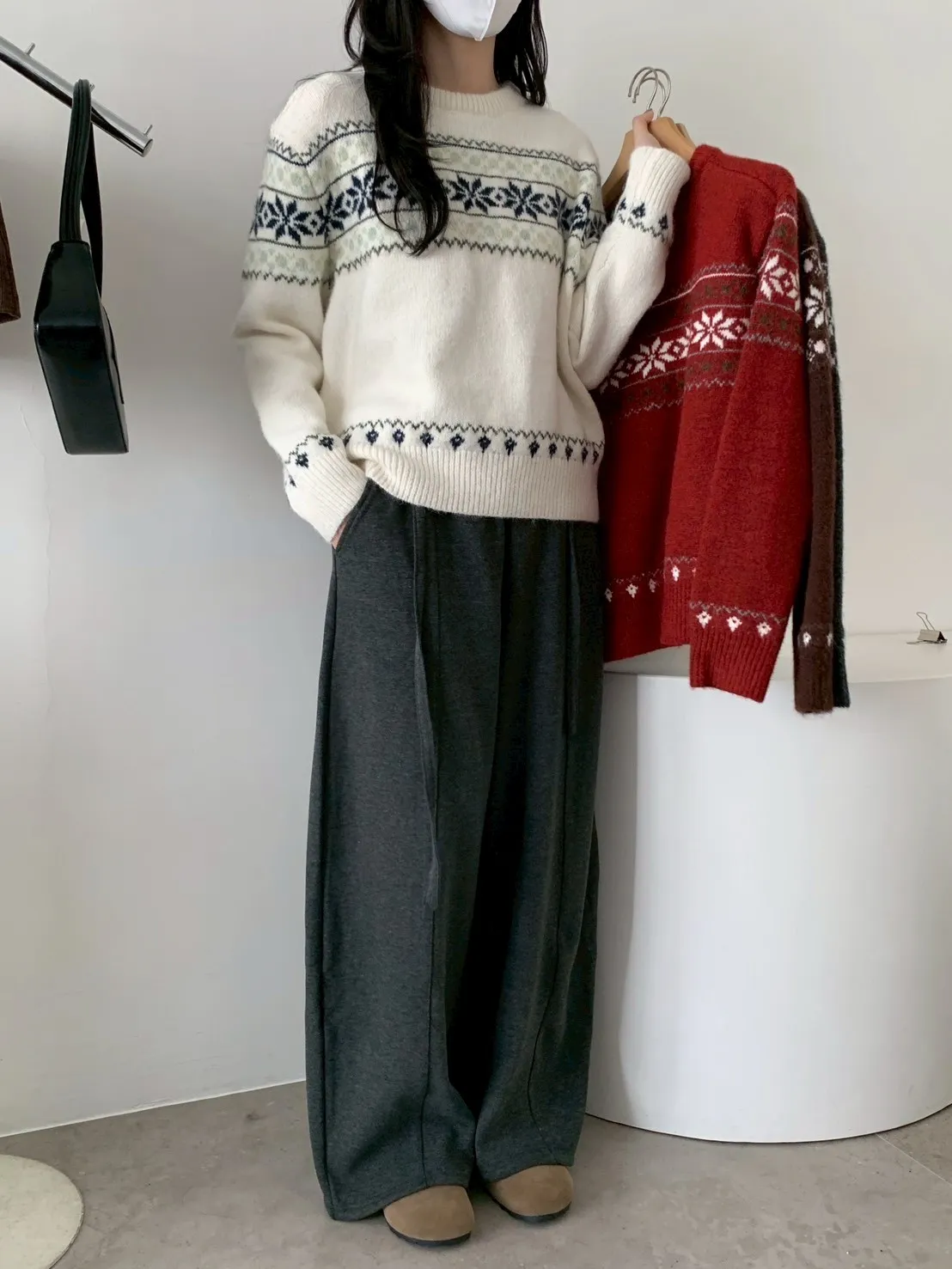 長毛斜肩針織+細圍巾