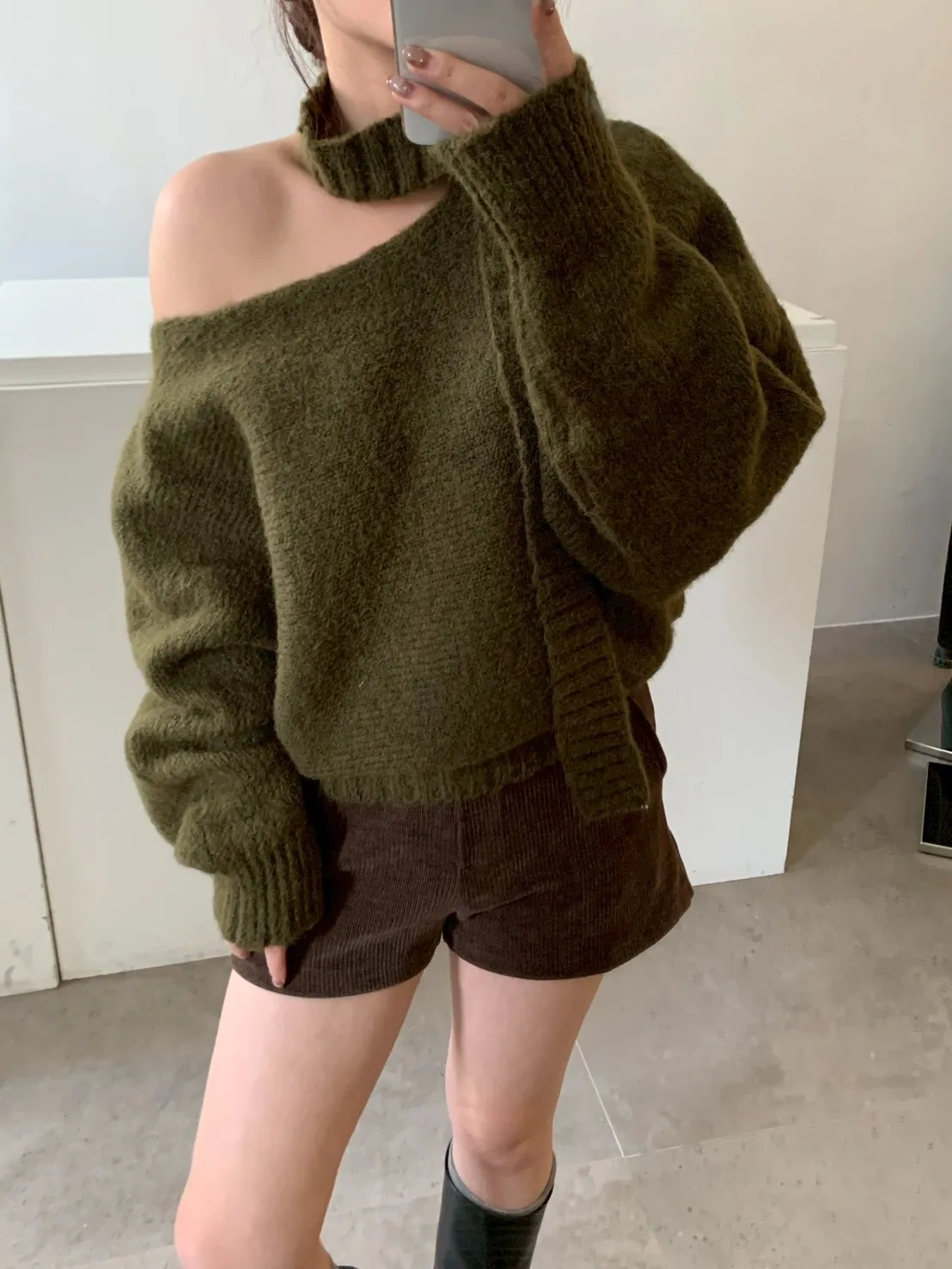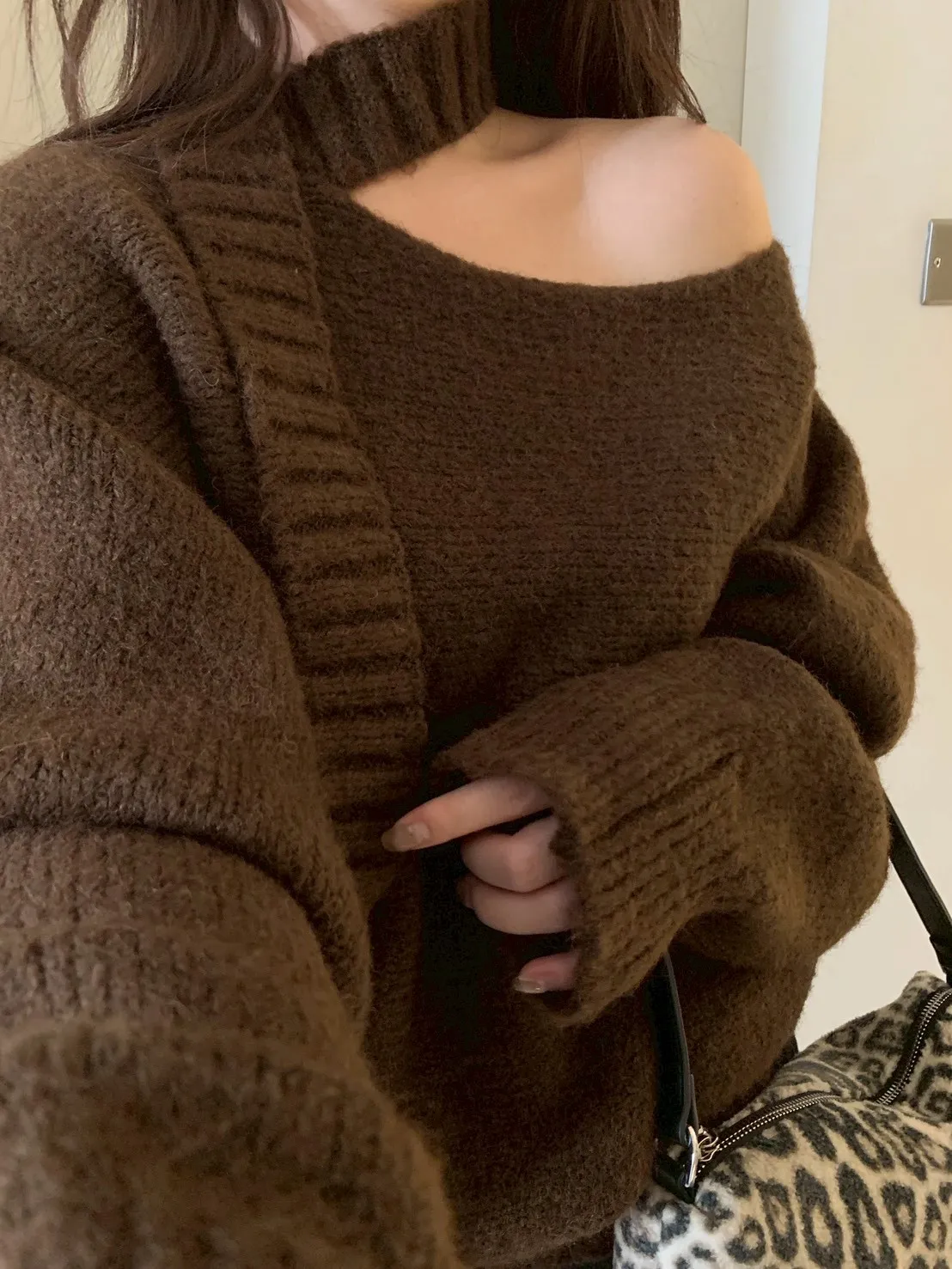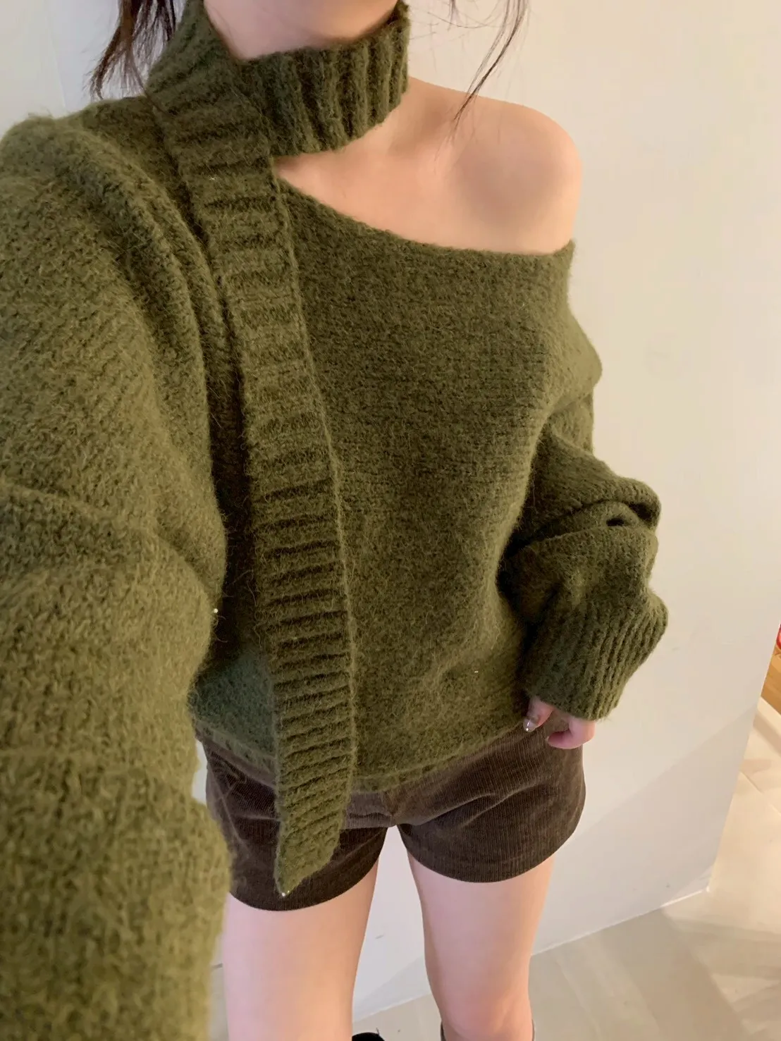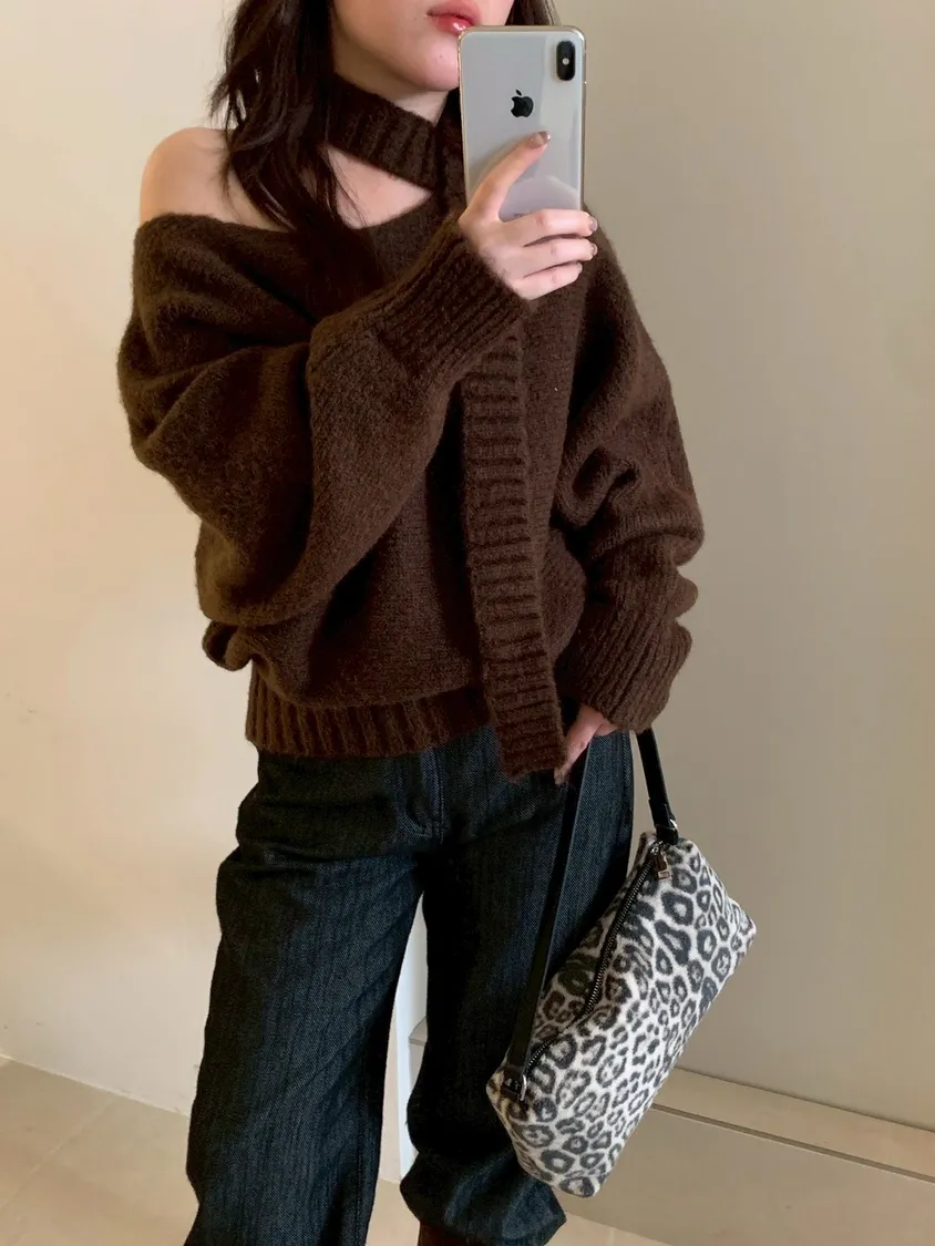寬帶繞脖斜肩針織衫