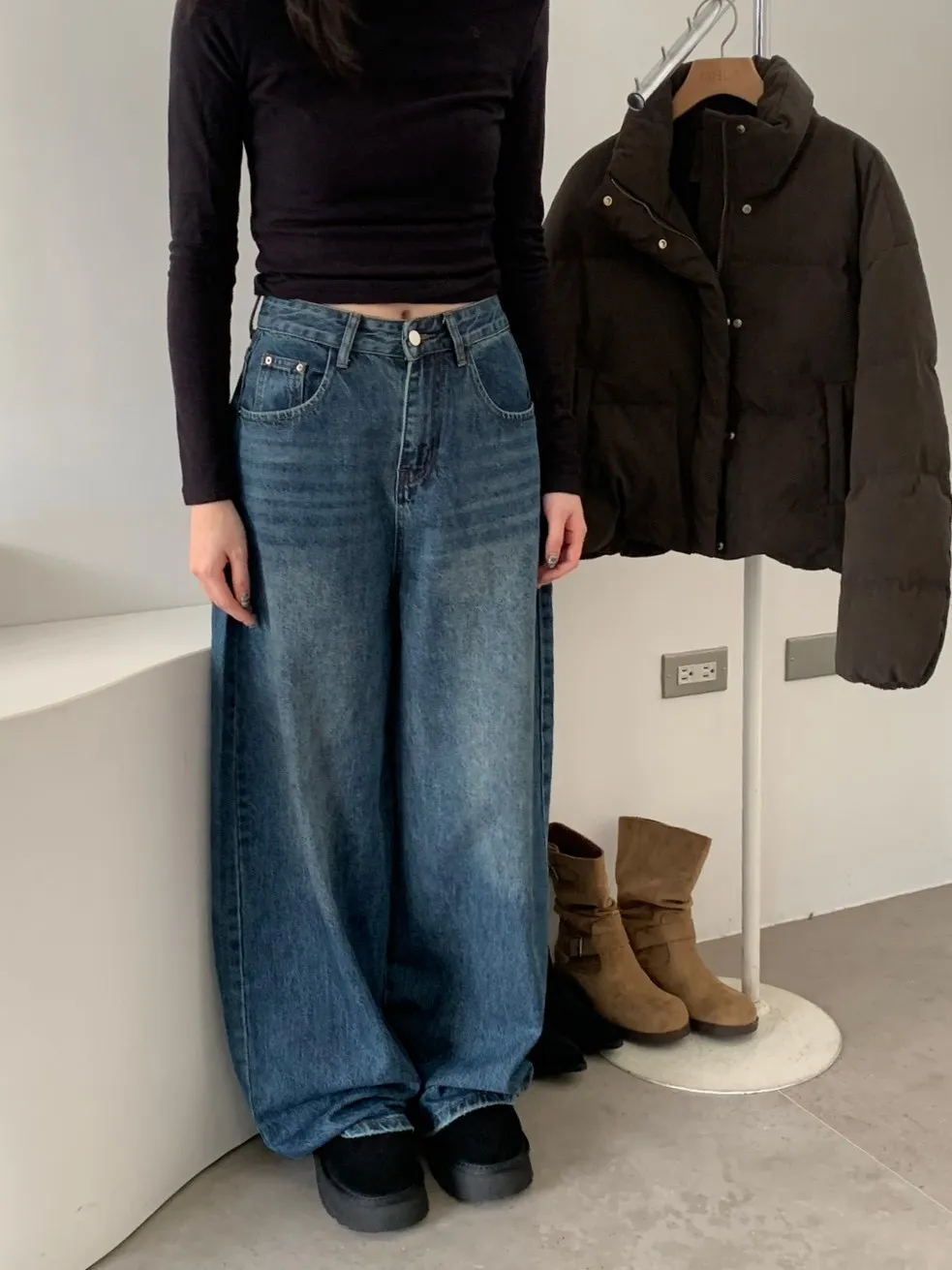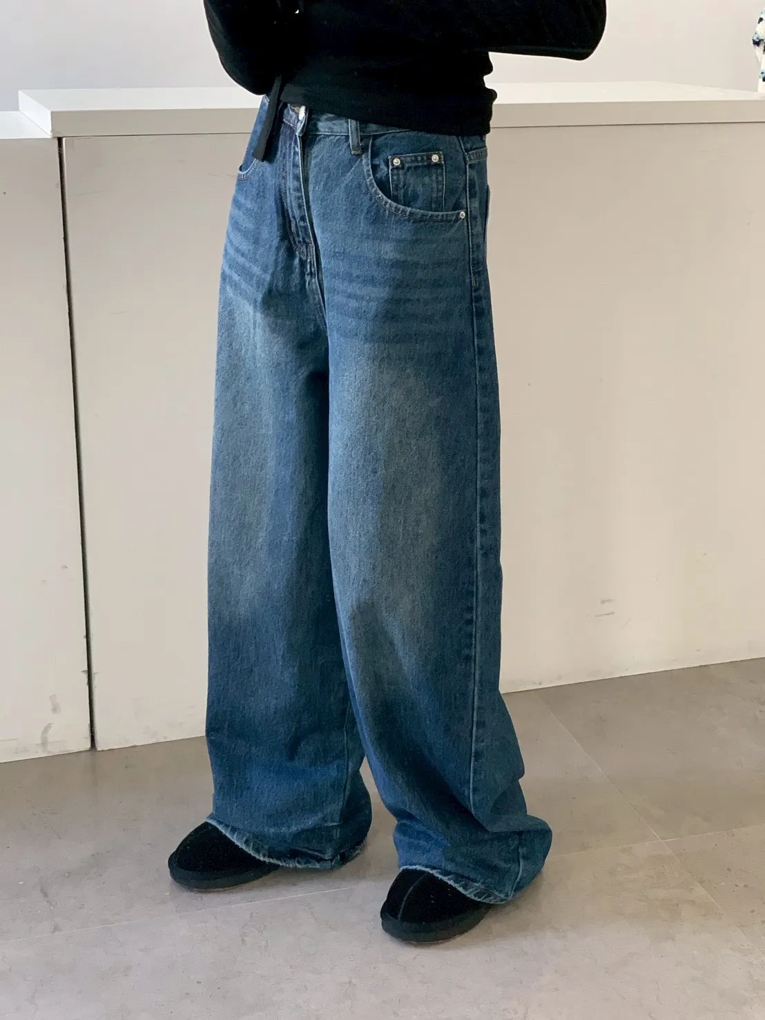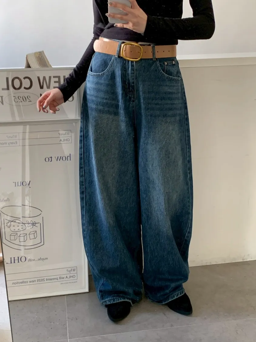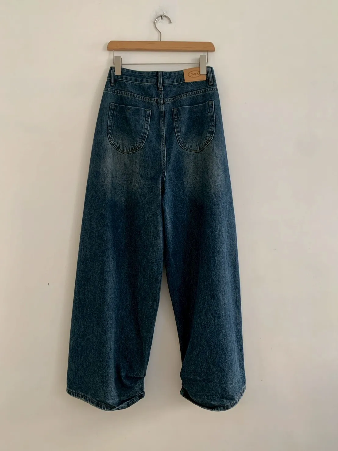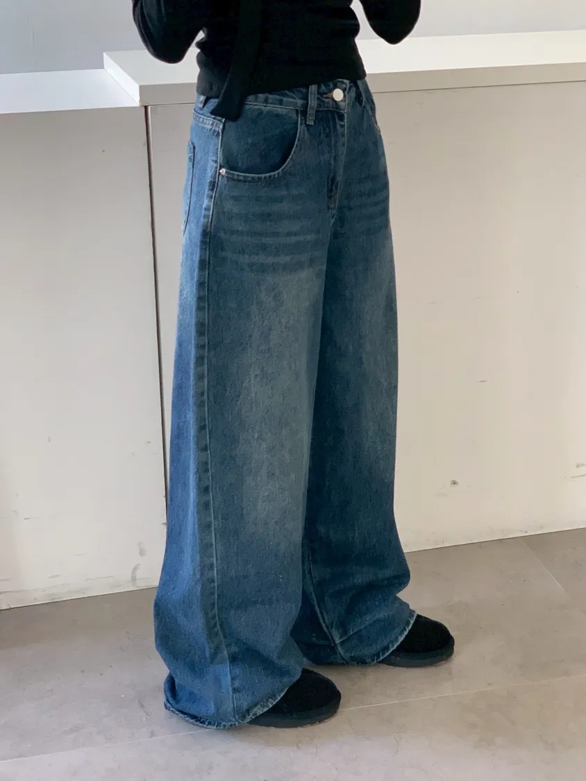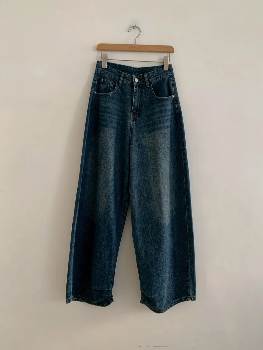 下褲管雙層抓皺牛仔寬褲