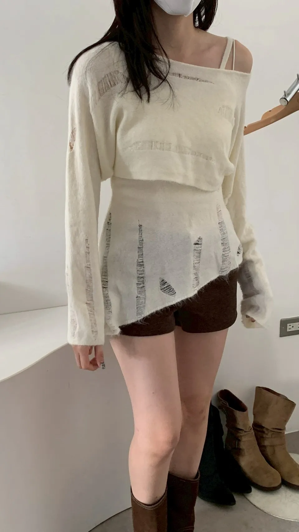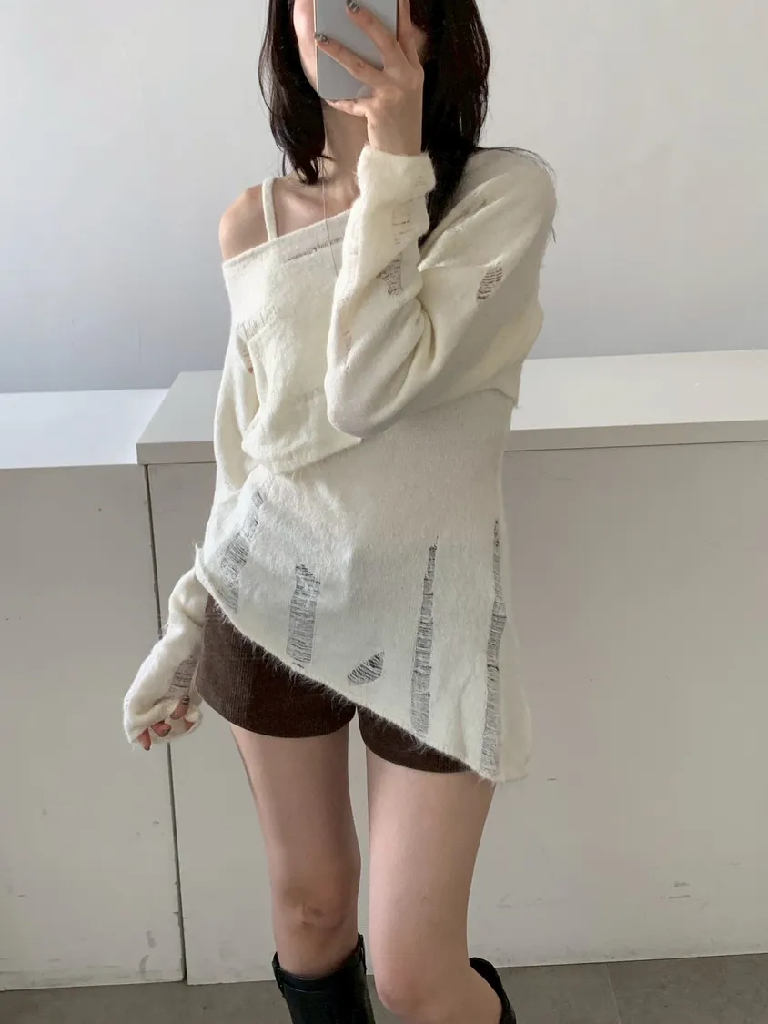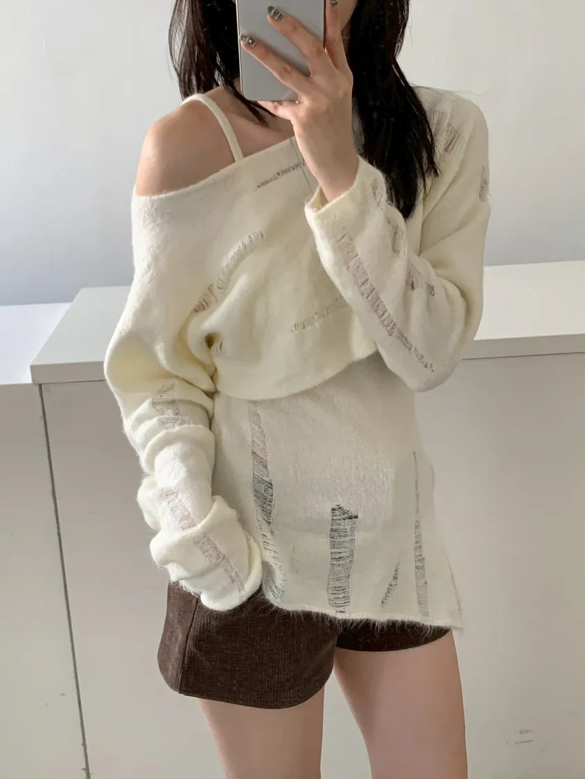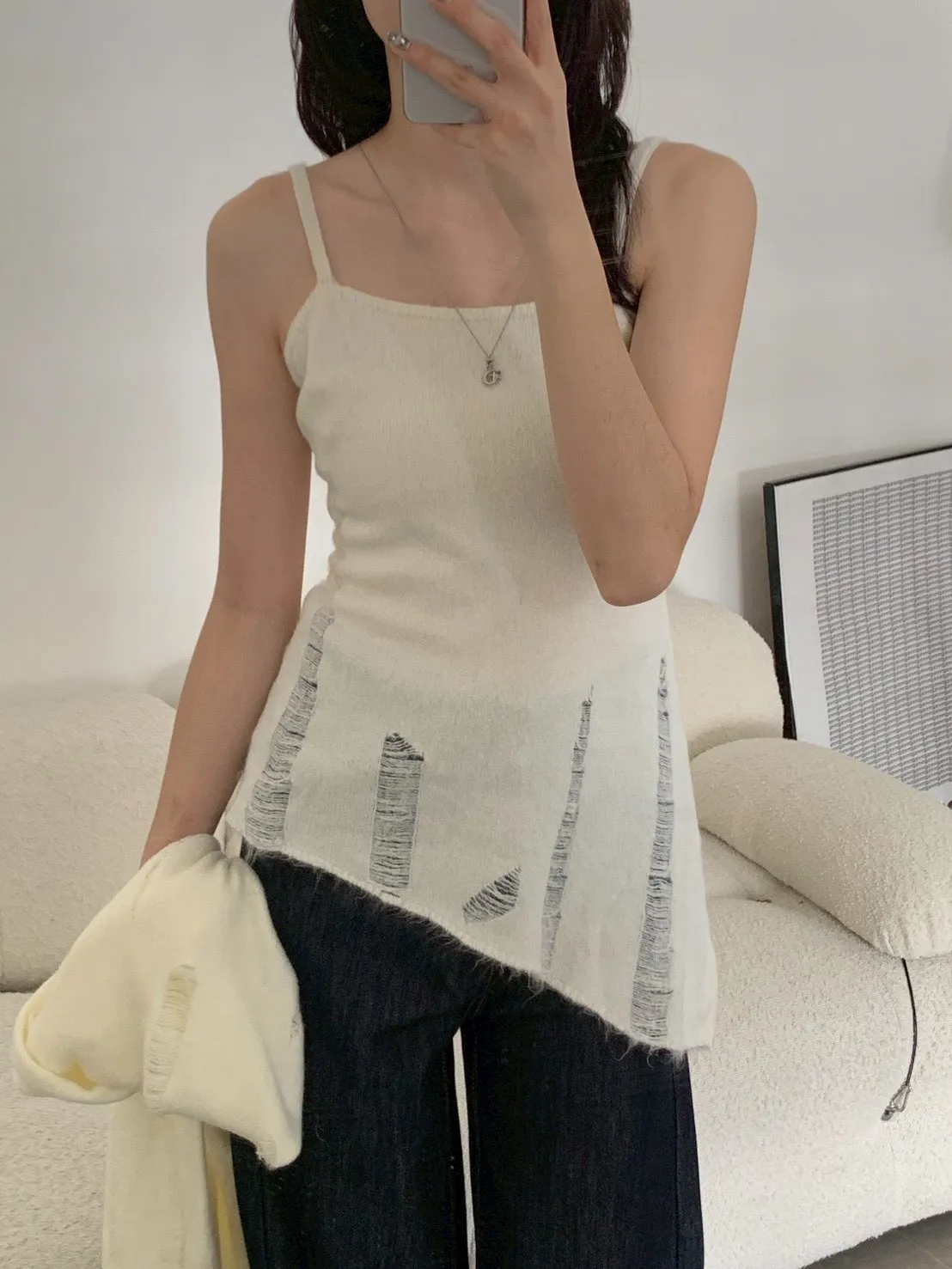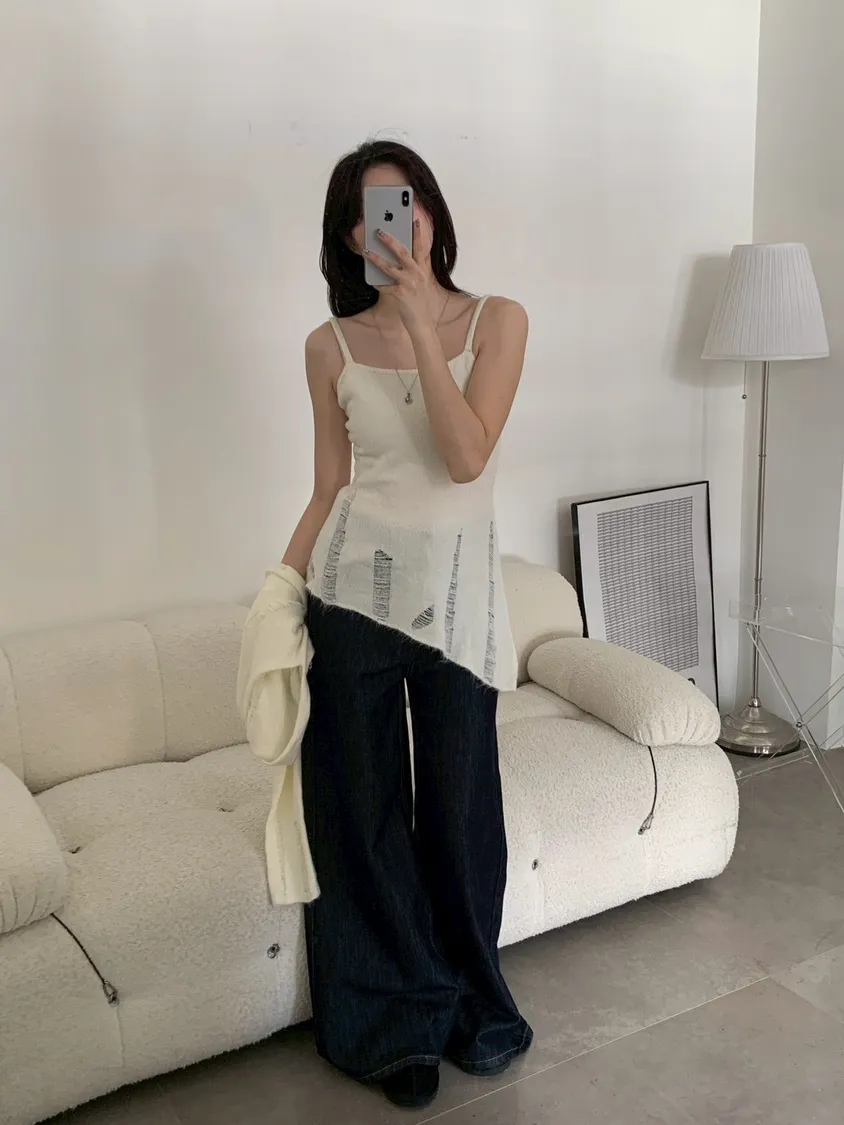 SET 鬚破短版針織+斜下擺背心