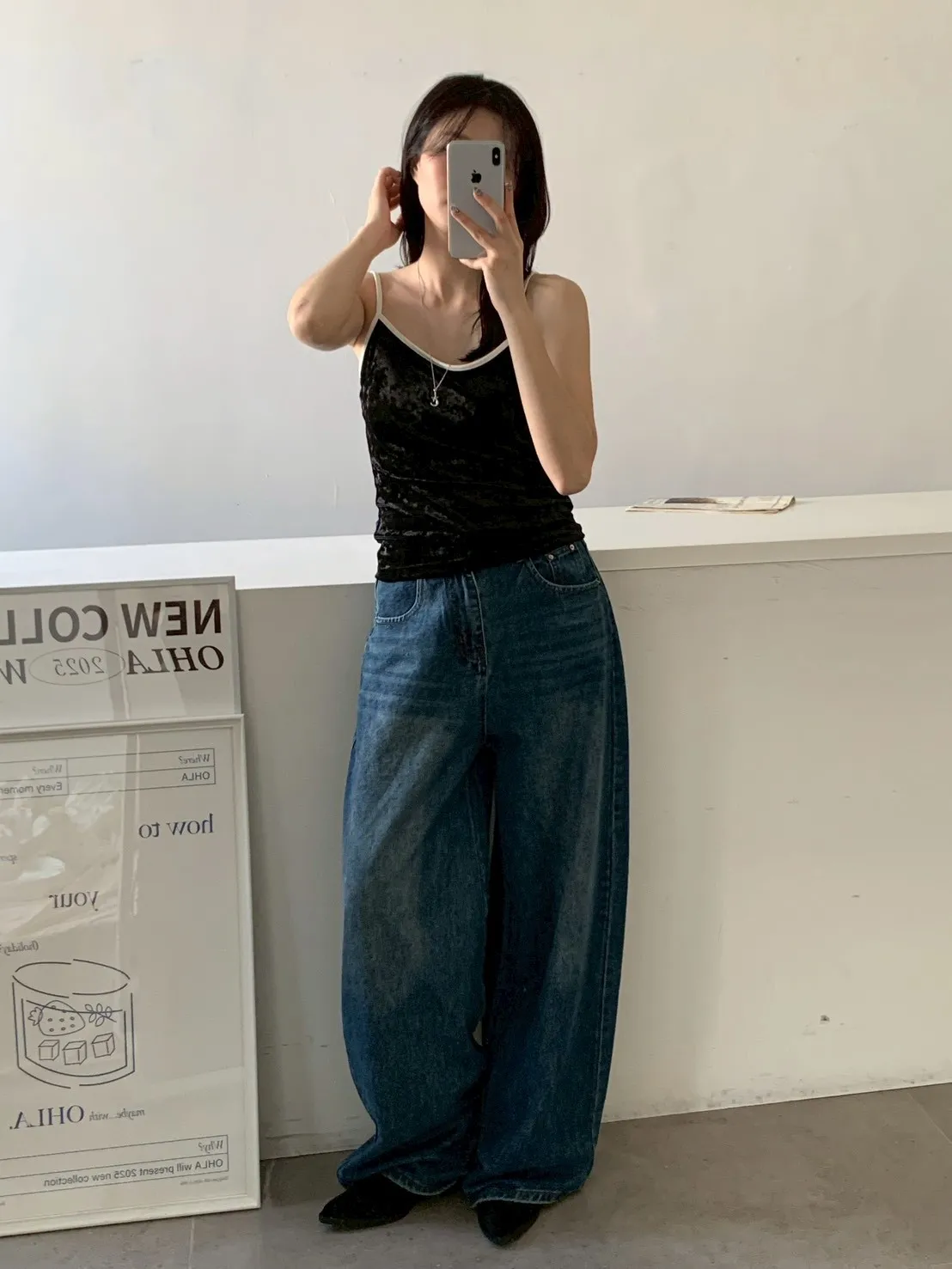 下褲管雙層抓皺牛仔寬褲