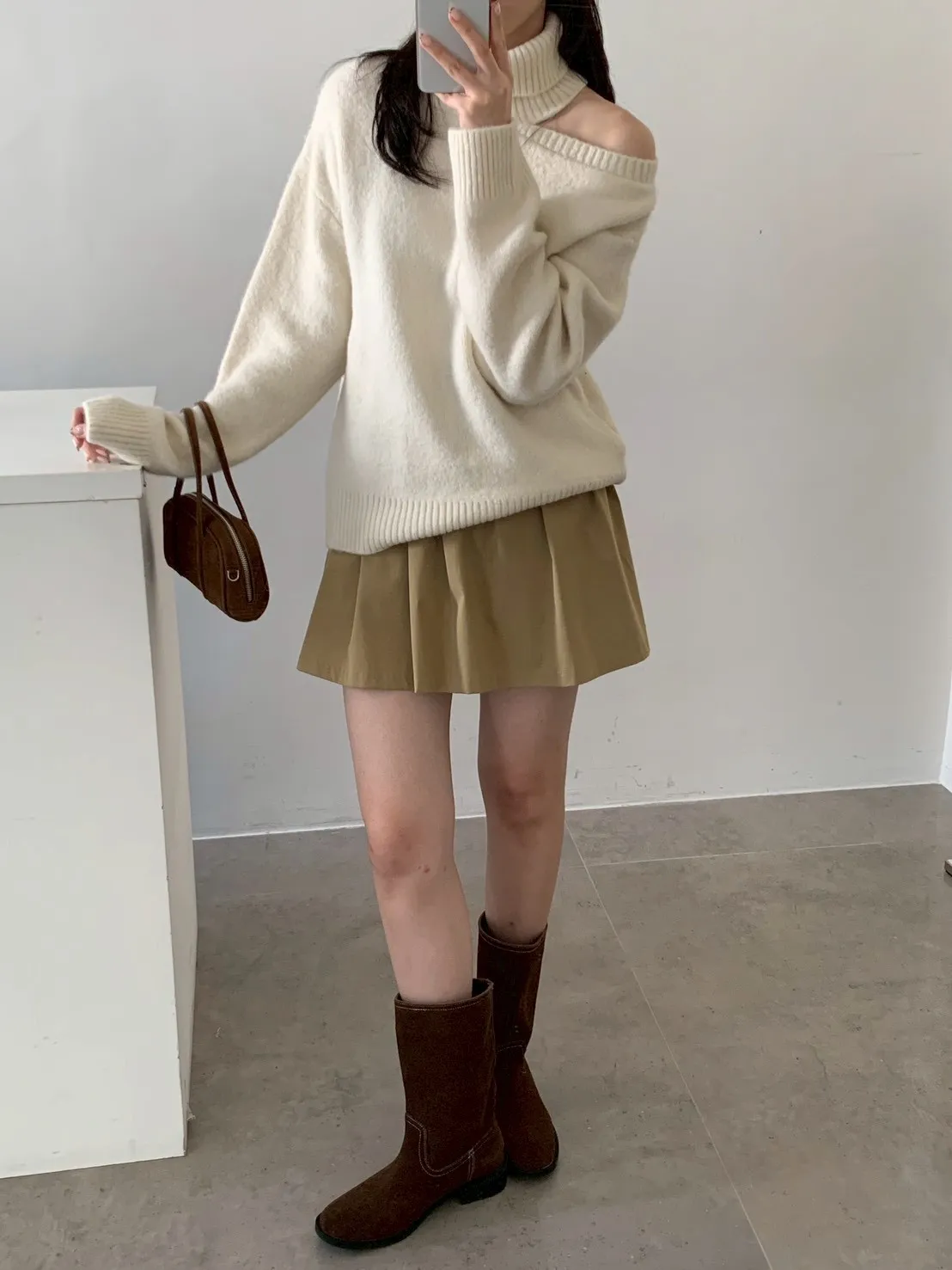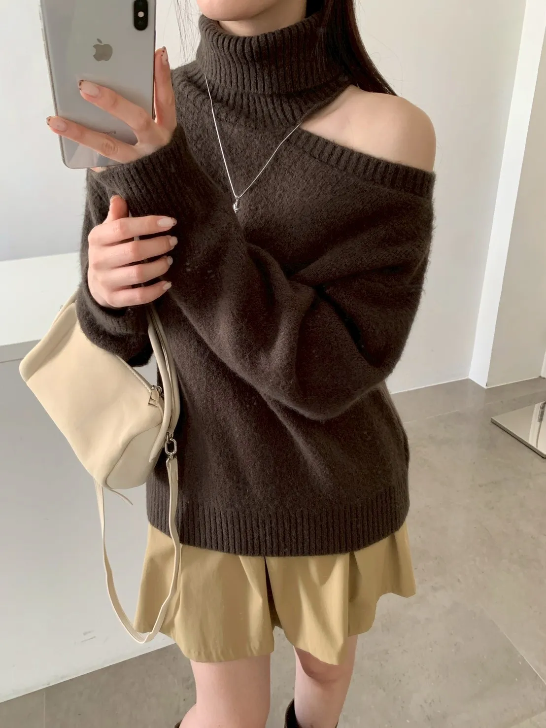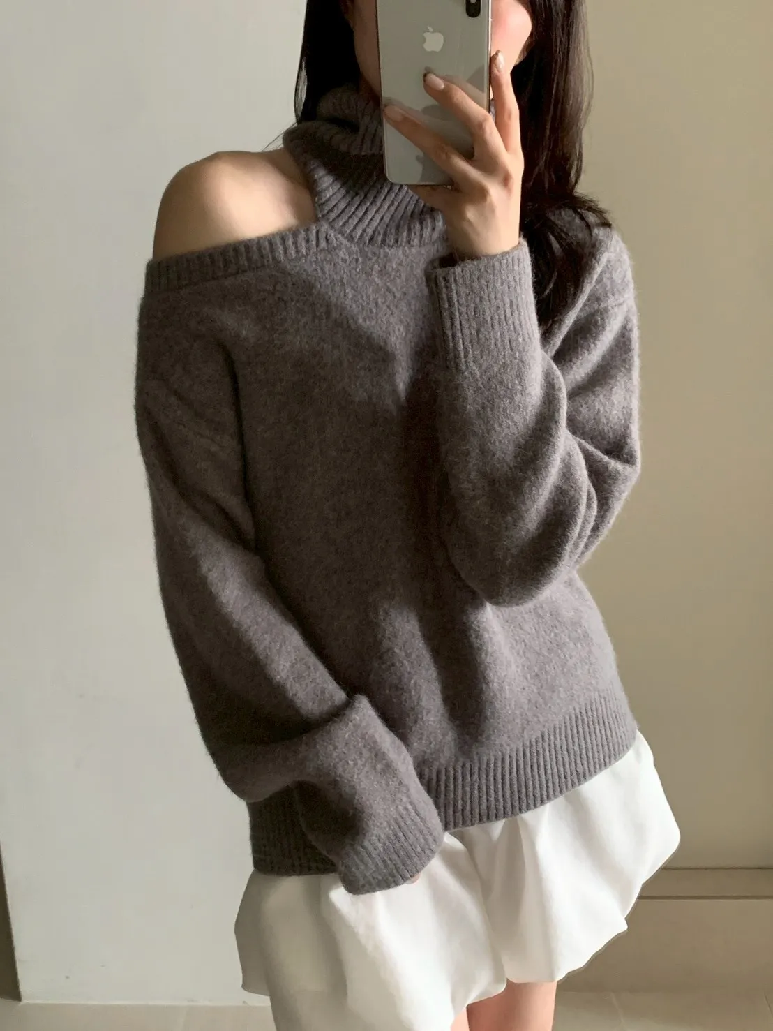 高領露肩素色毛衣