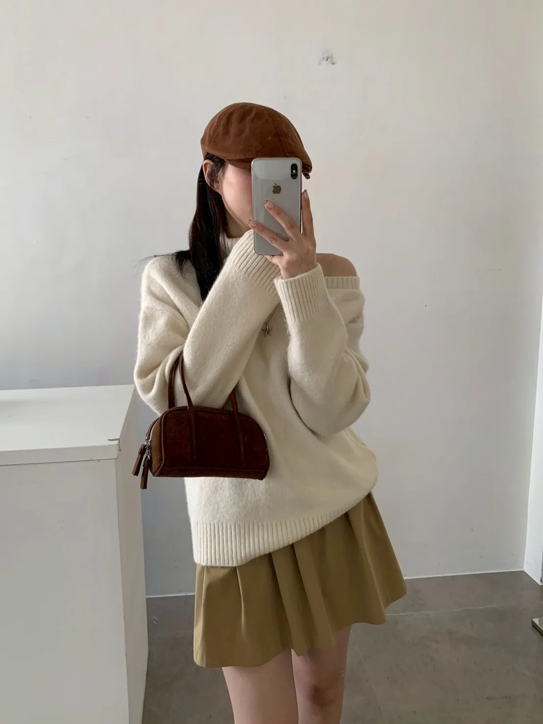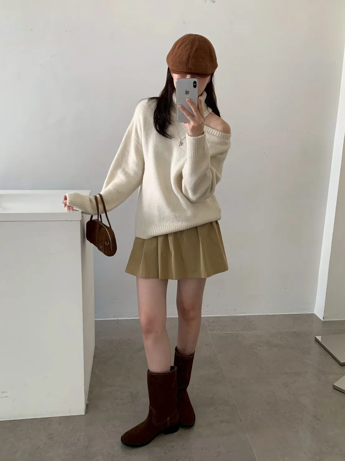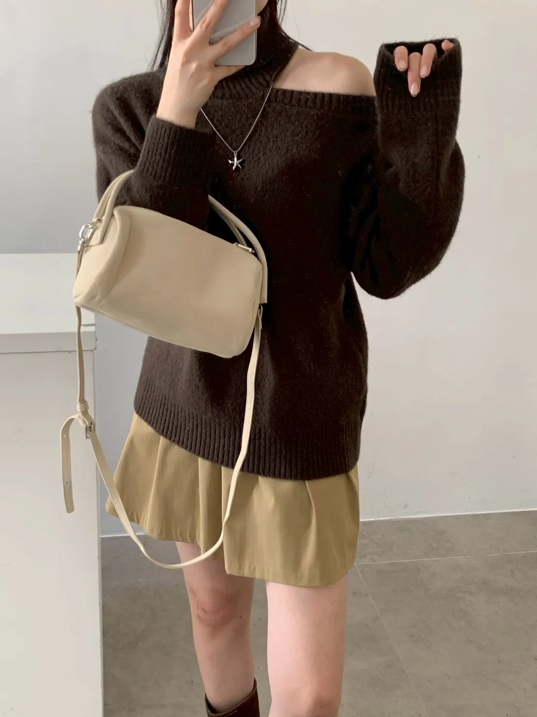 高領露肩素色毛衣