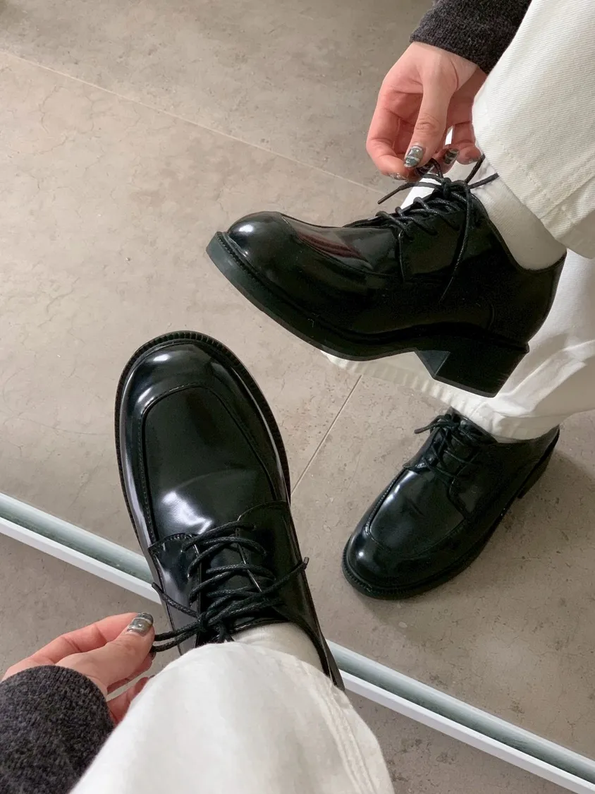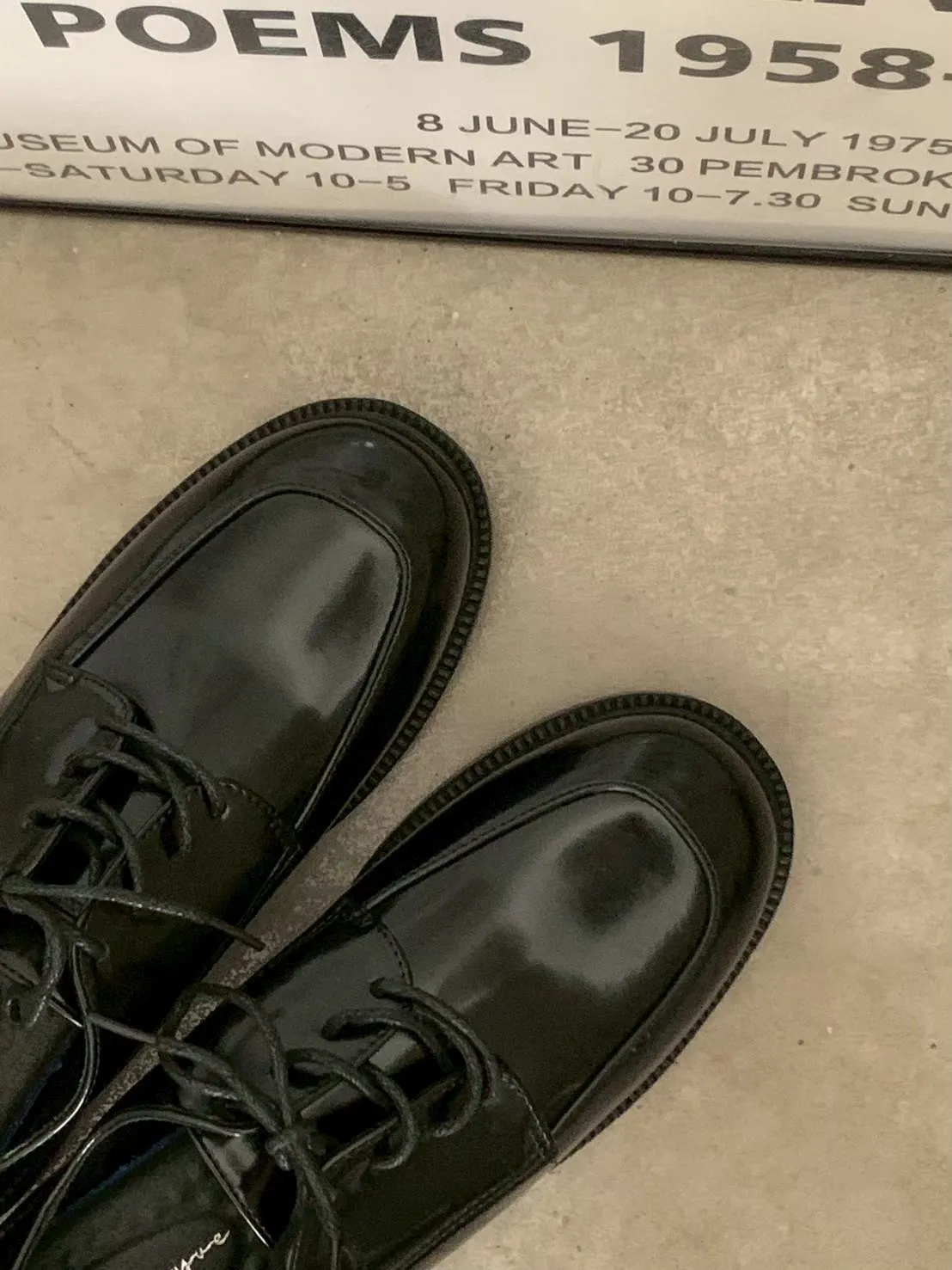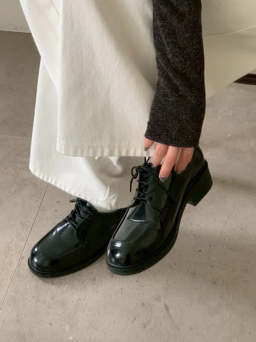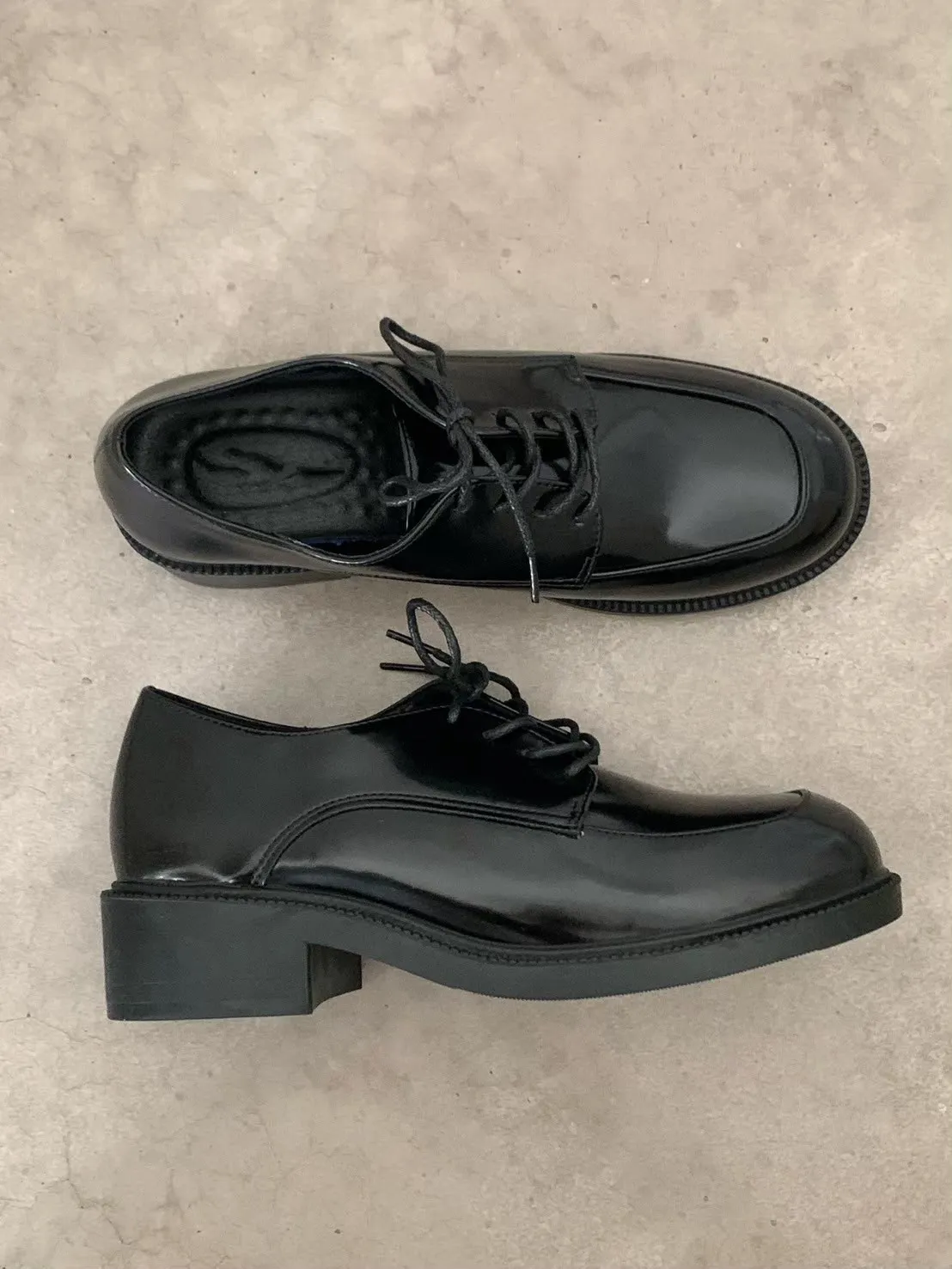 立體車線亮皮綁帶低跟皮鞋SY0538-1