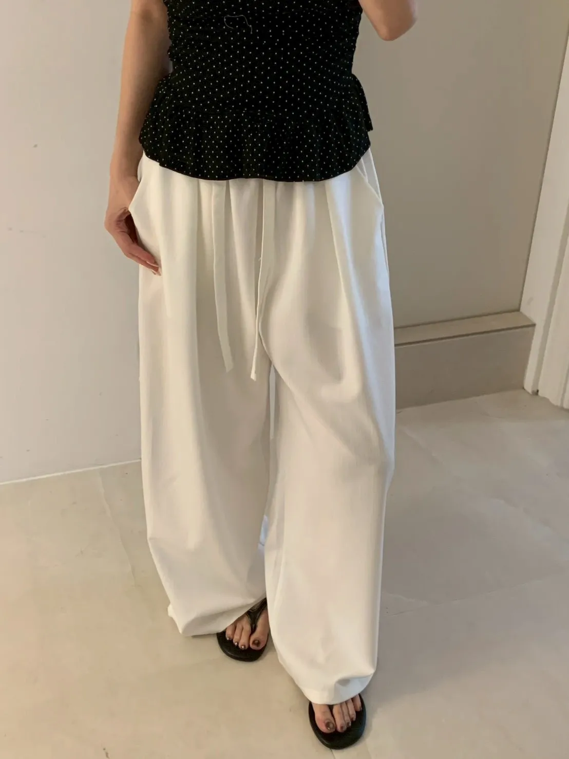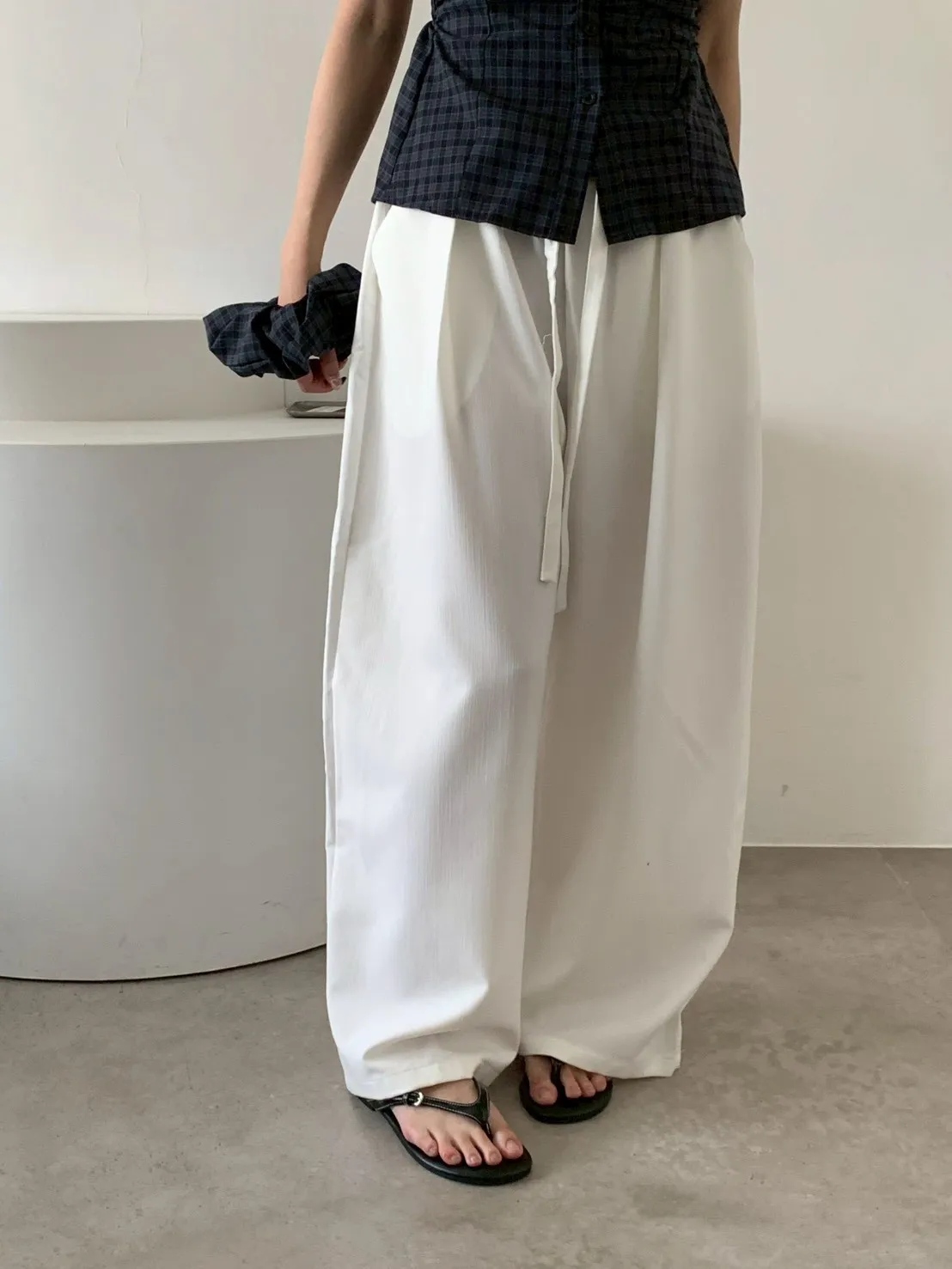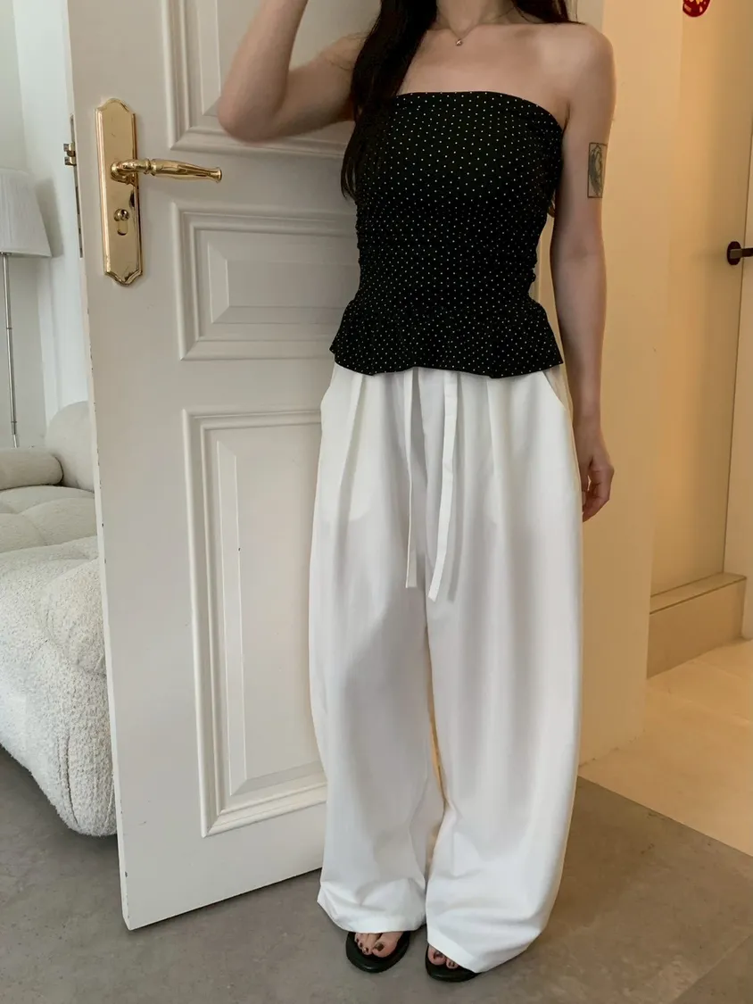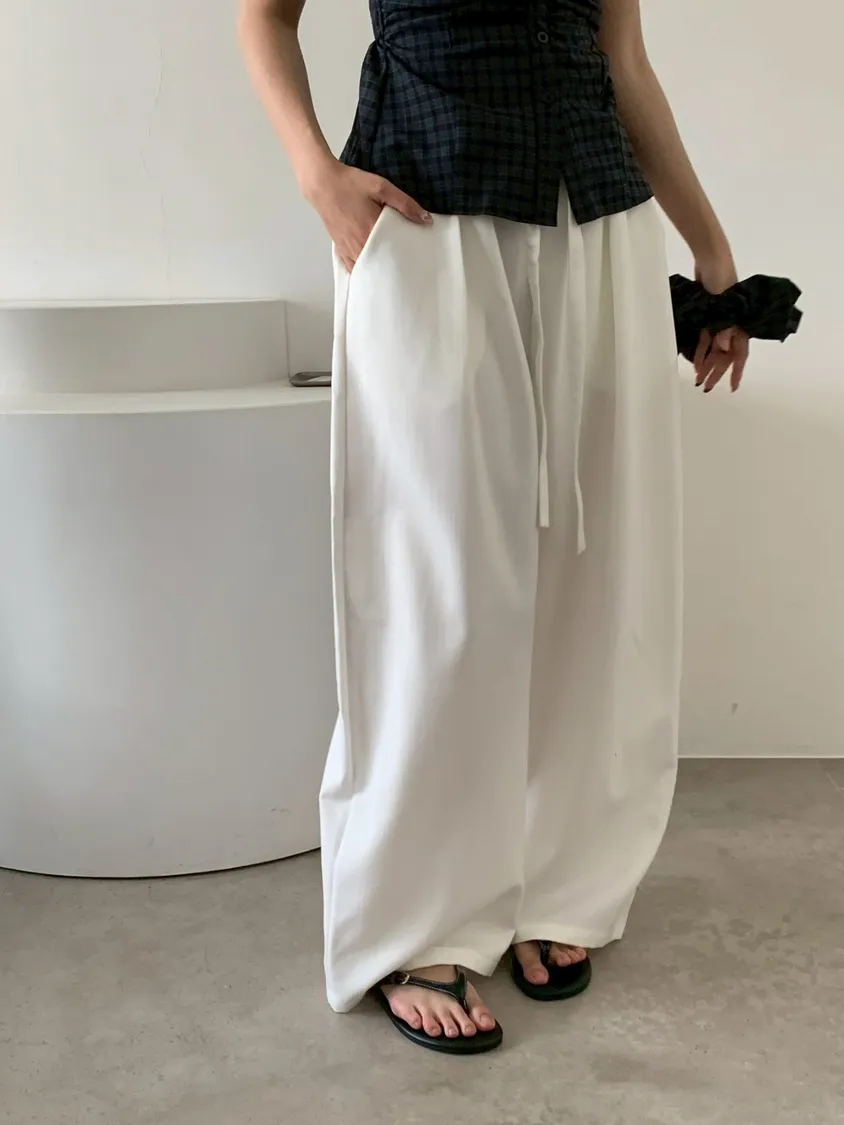 扁繩彈腰直紋打摺寬褲