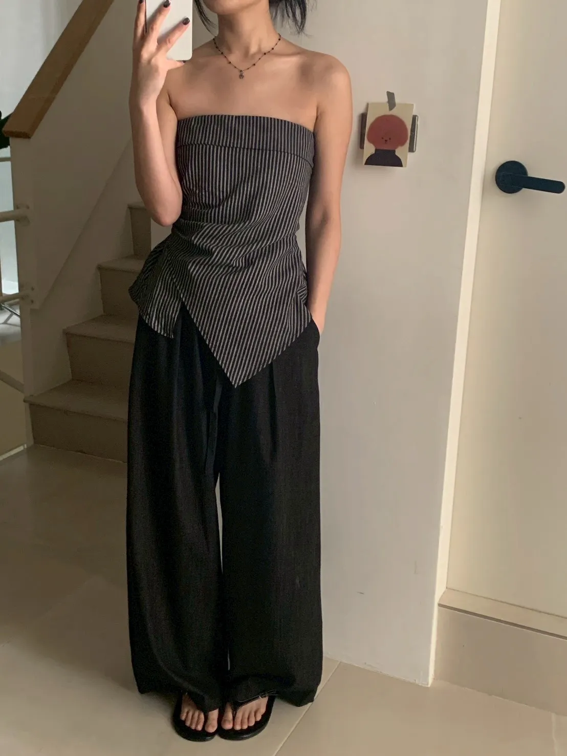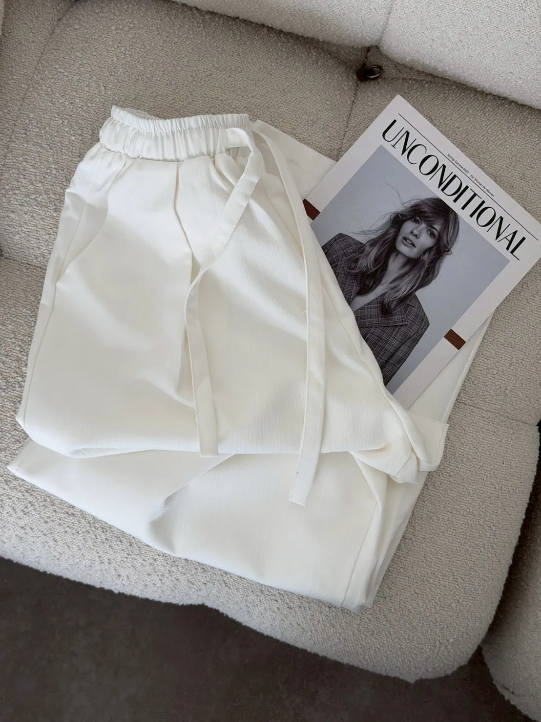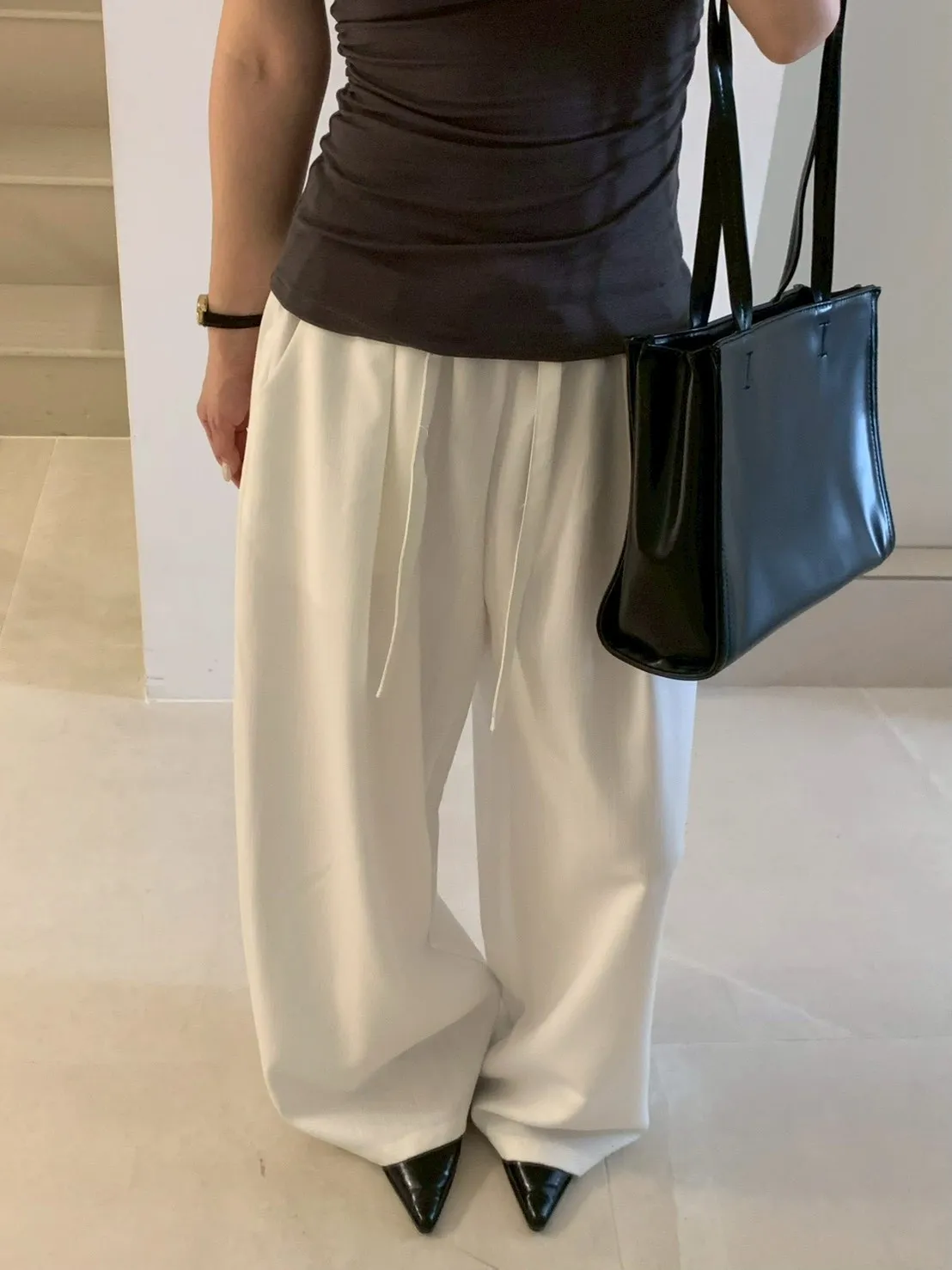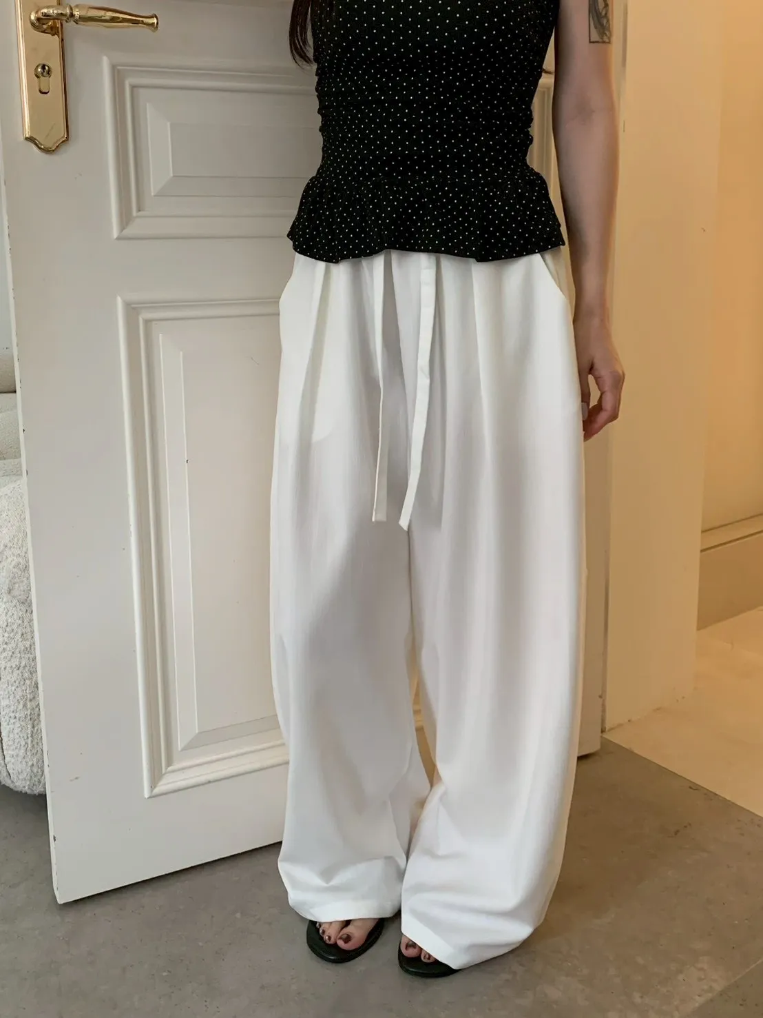 扁繩彈腰直紋打摺寬褲