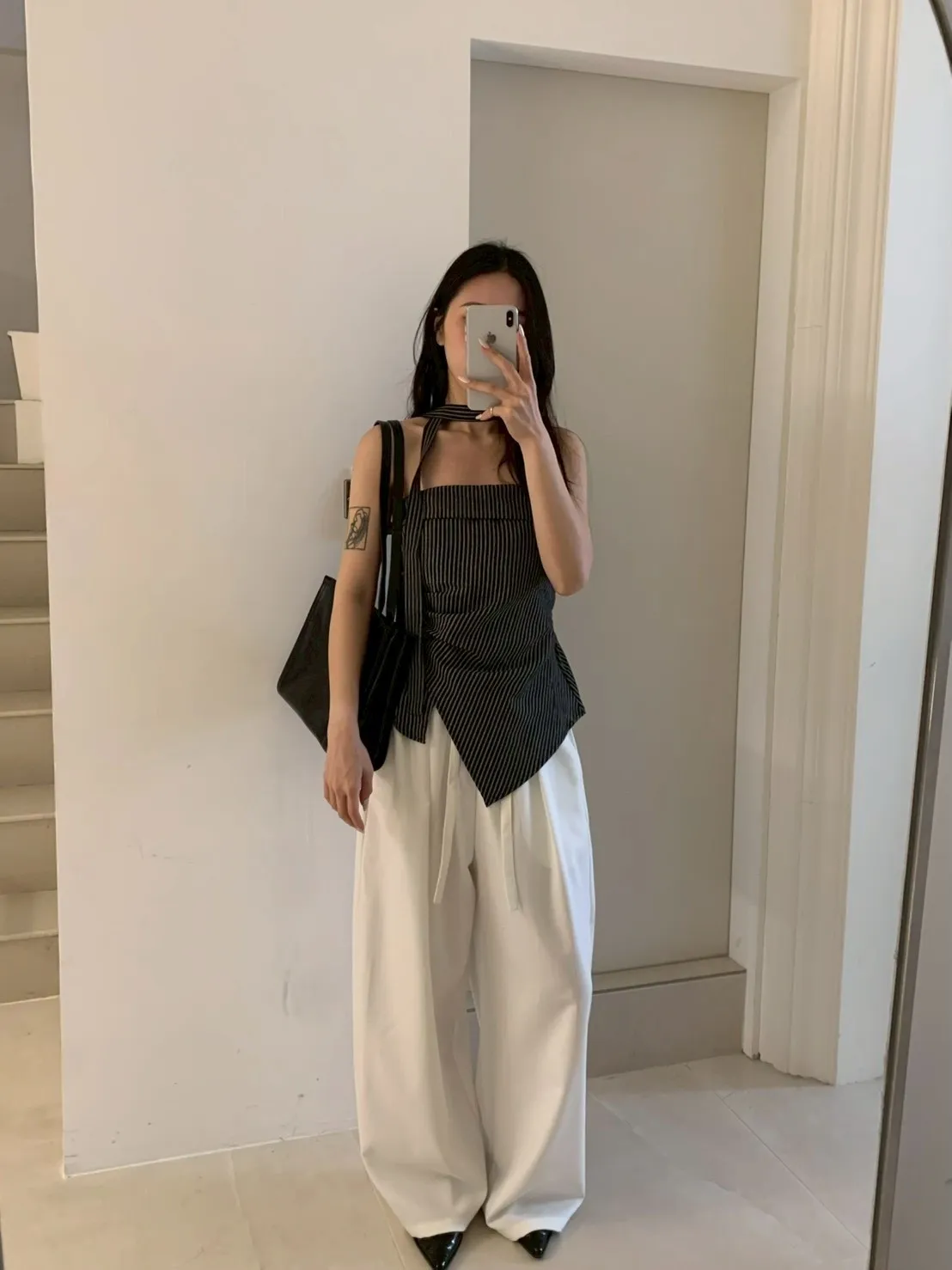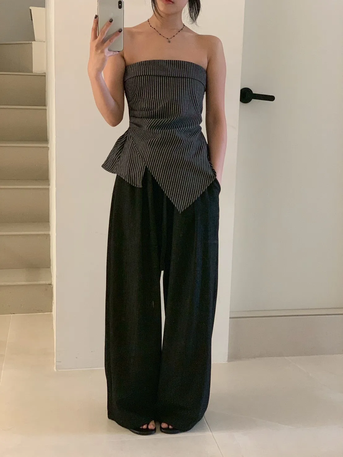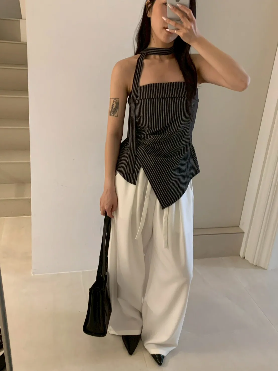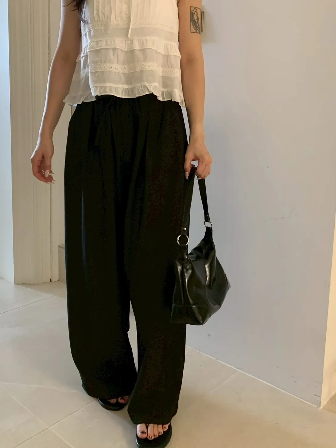 扁繩彈腰直紋打摺寬褲