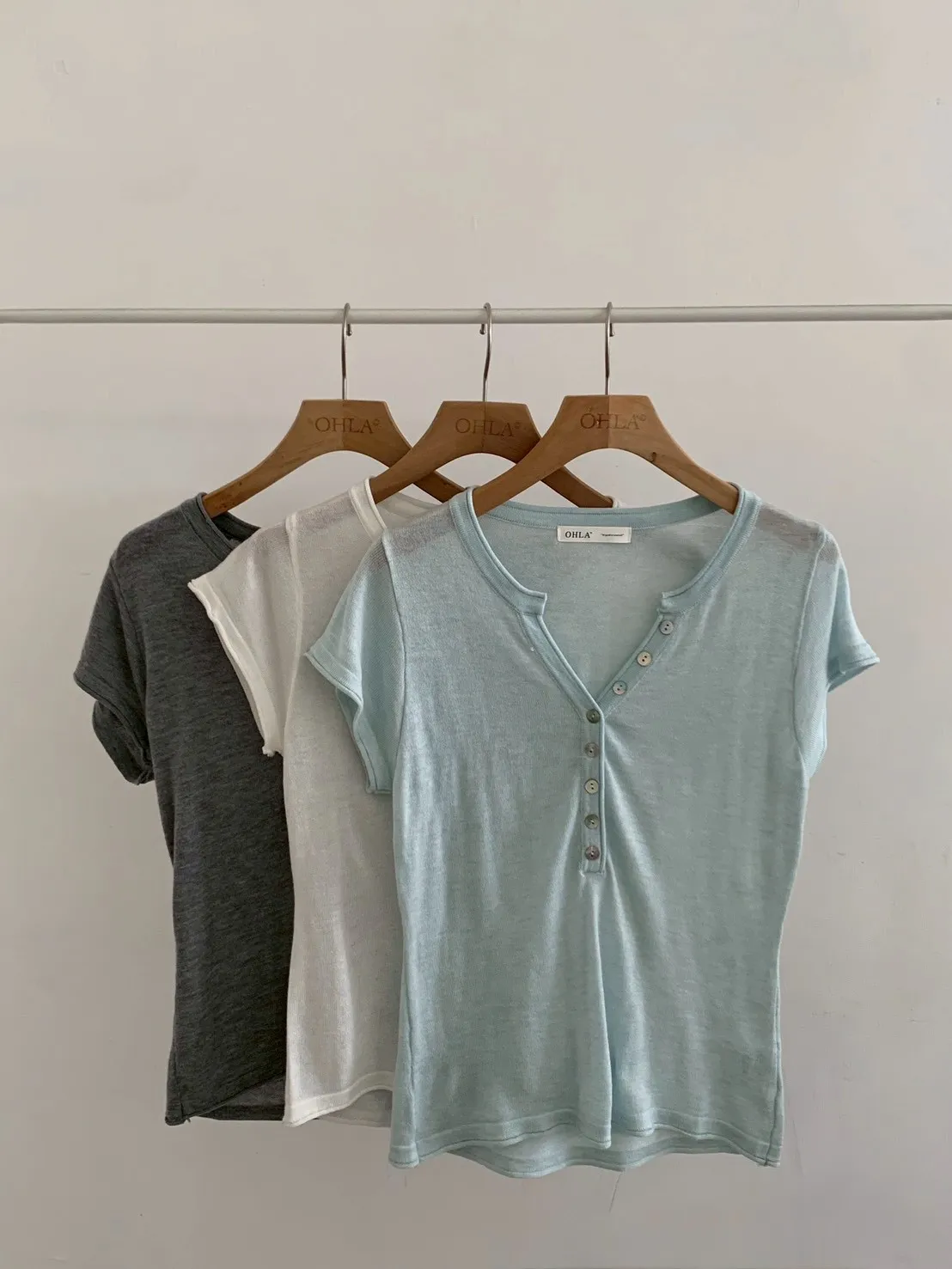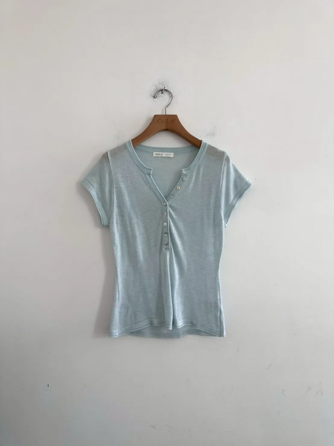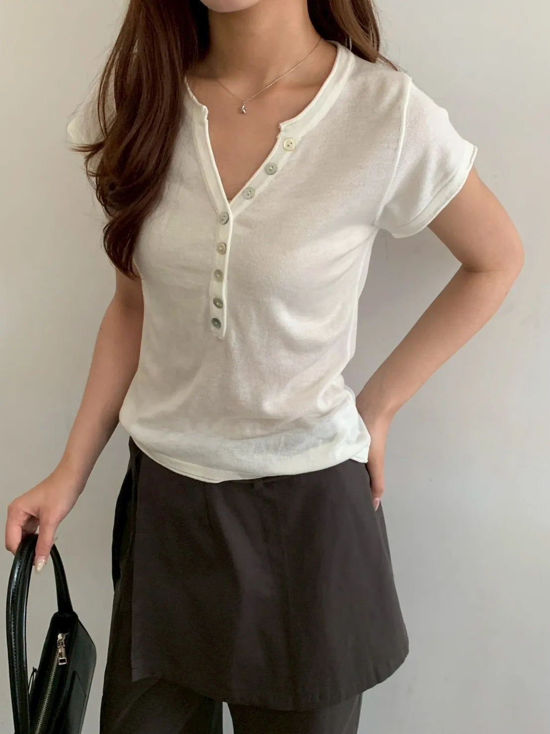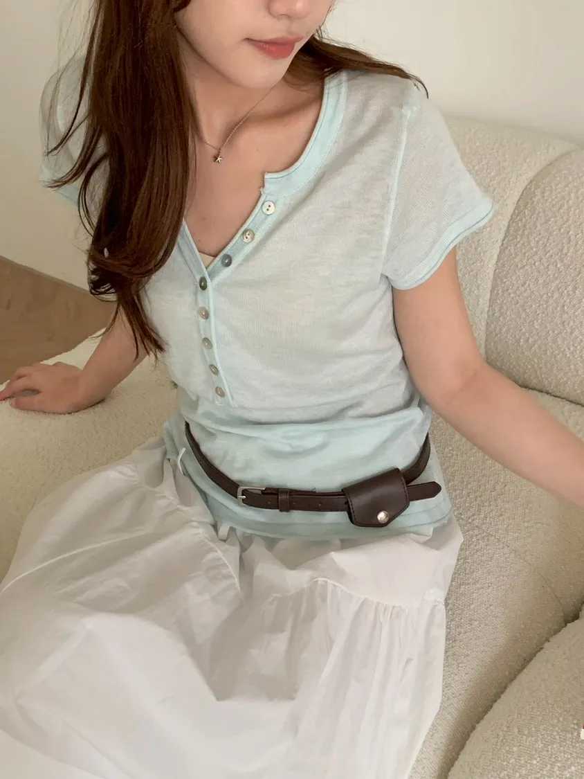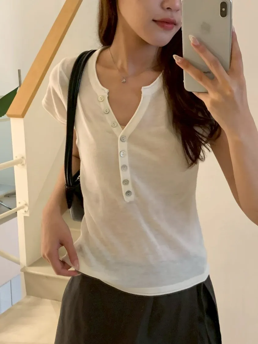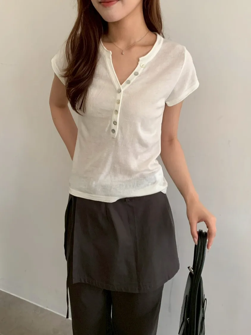 開V貝殼釦微透針織素T