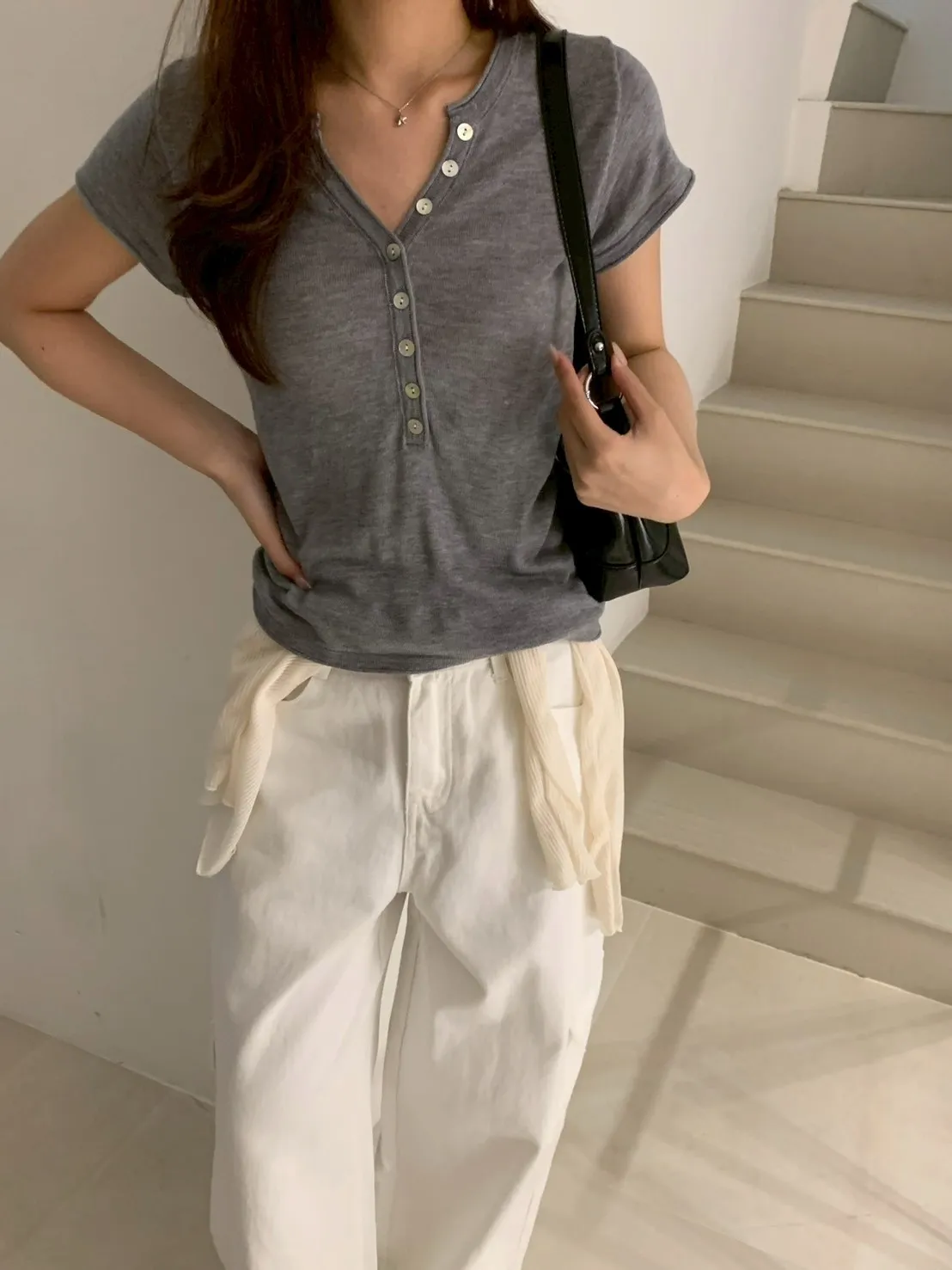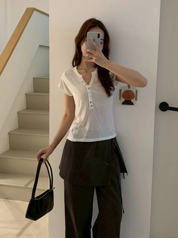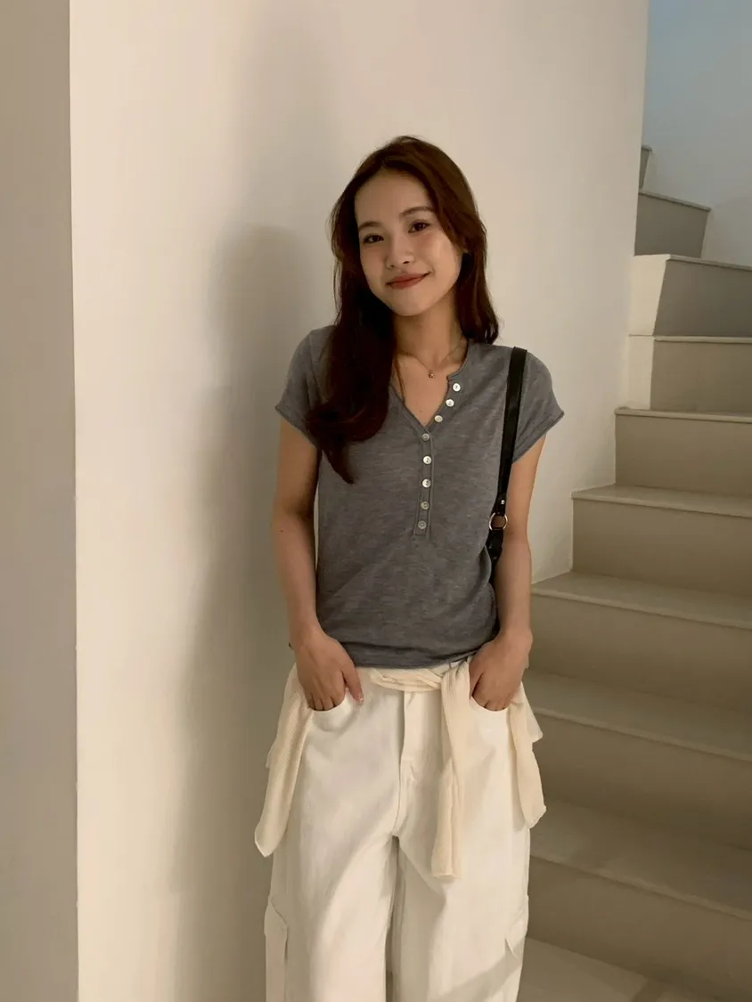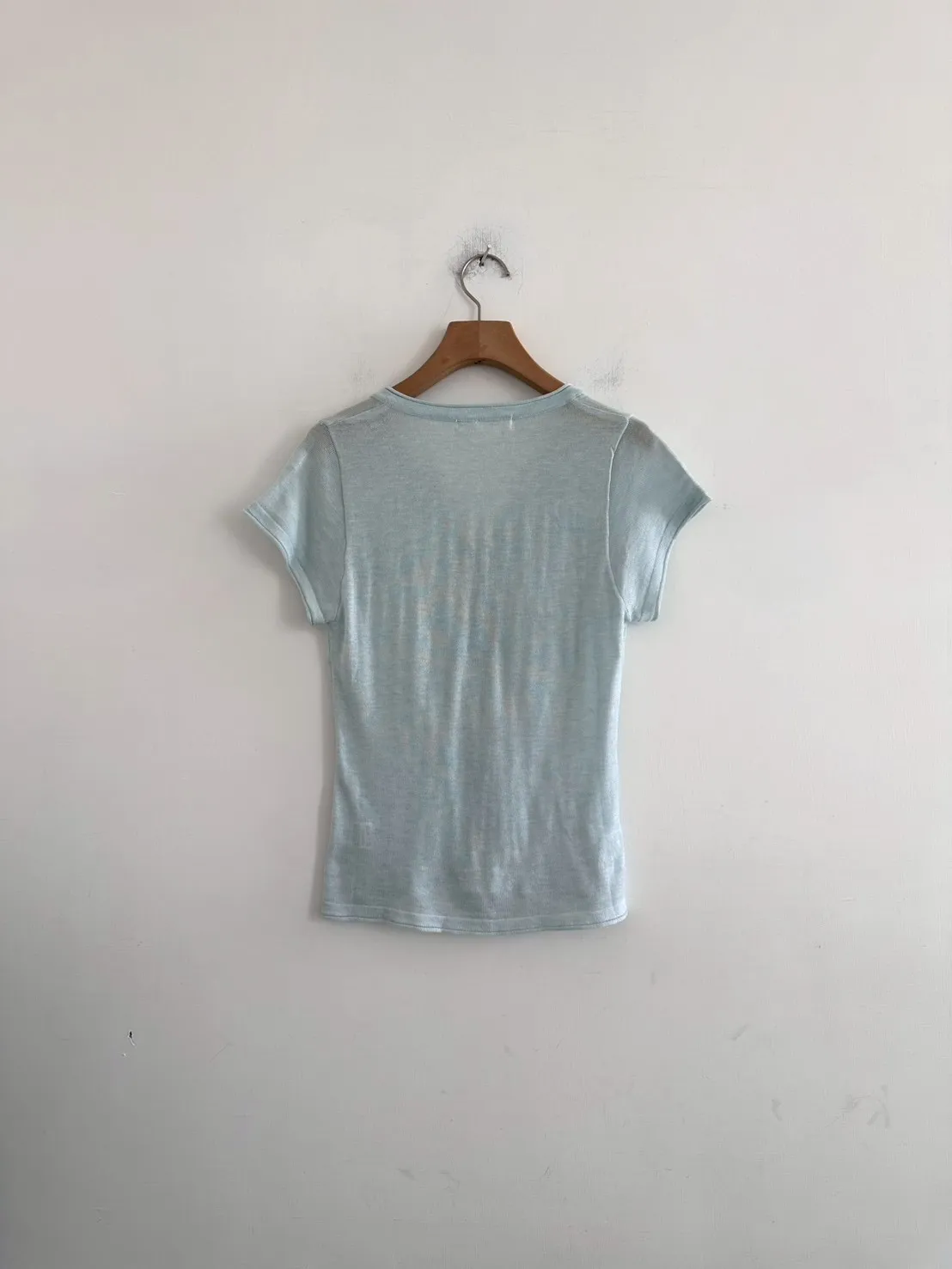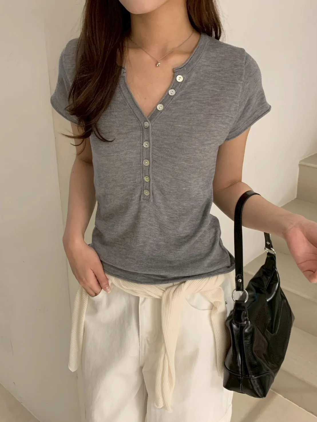 開V貝殼釦微透針織素T