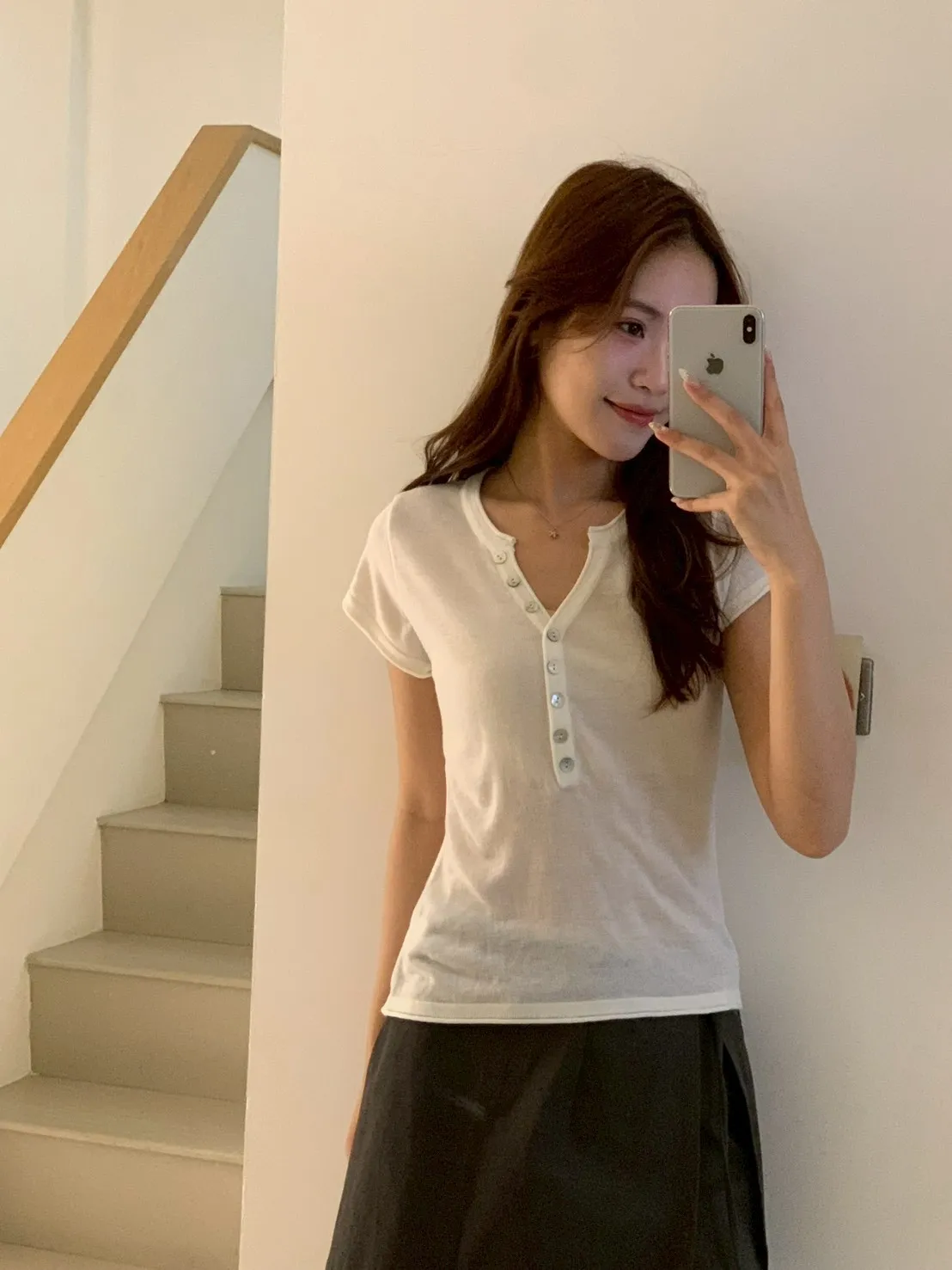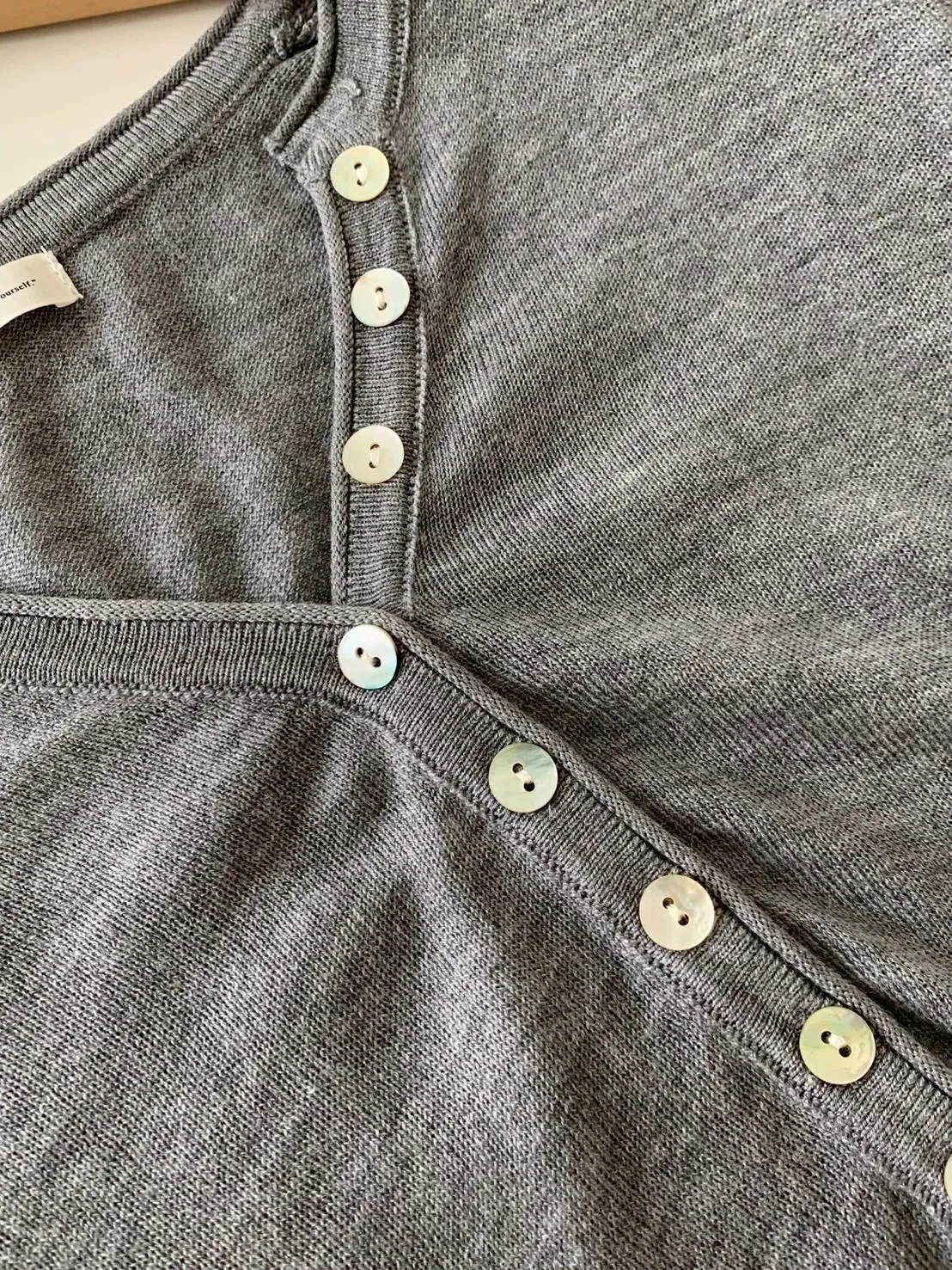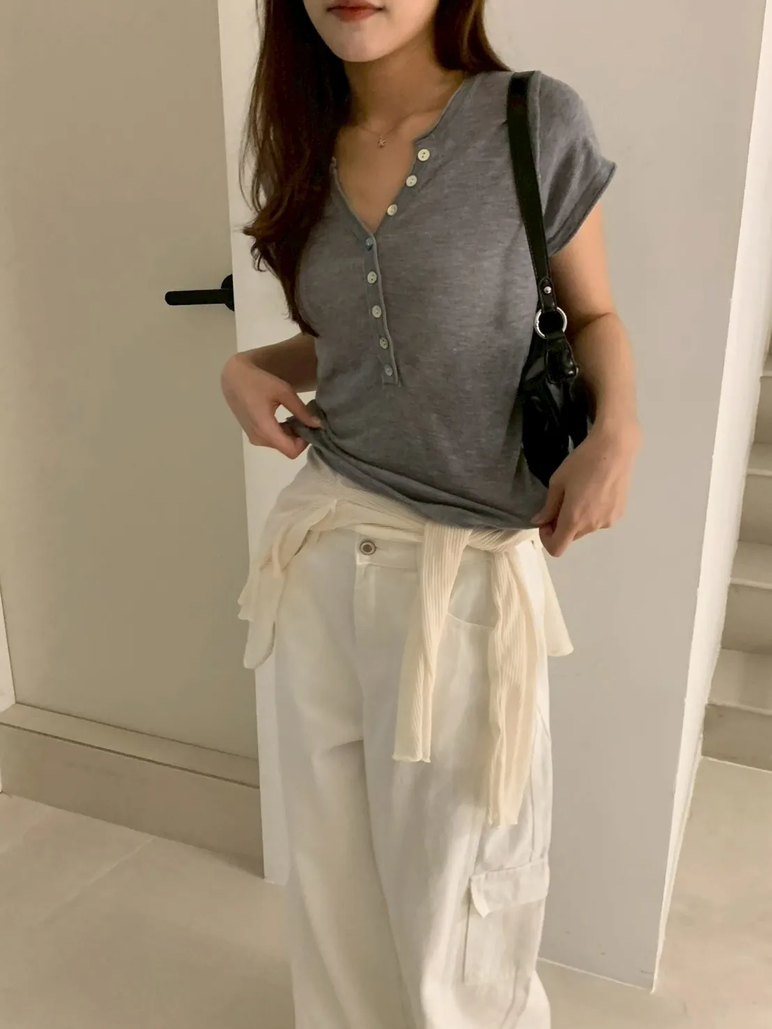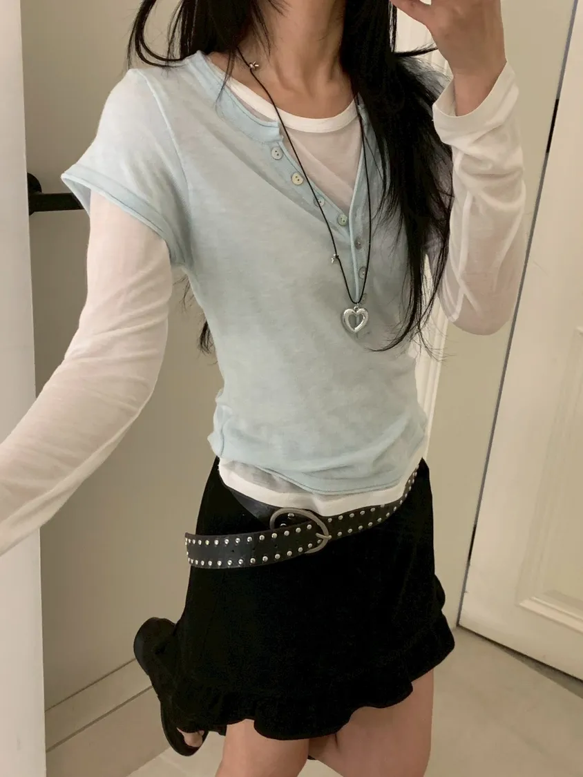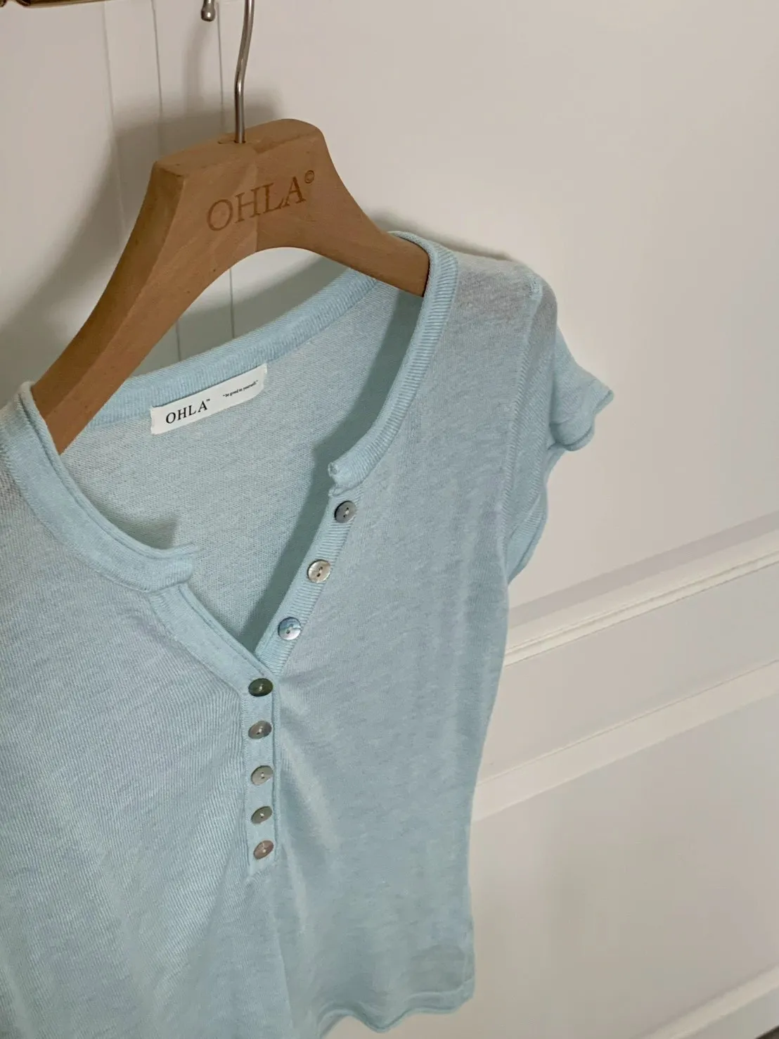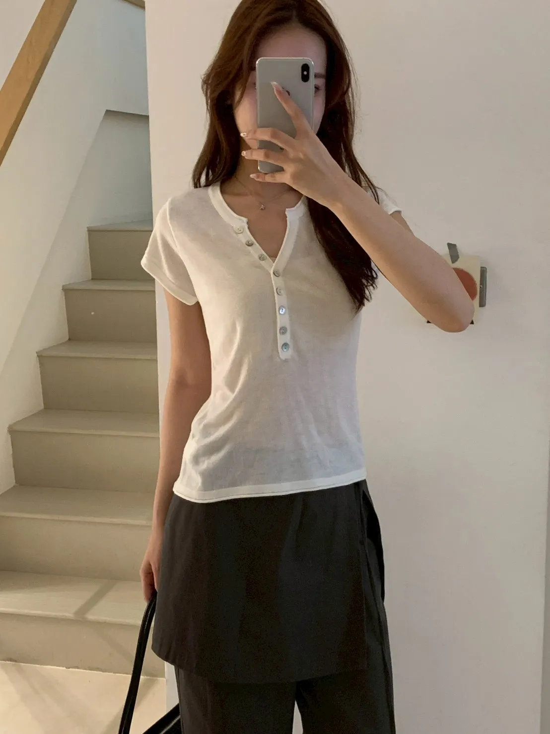 開V貝殼釦微透針織素T