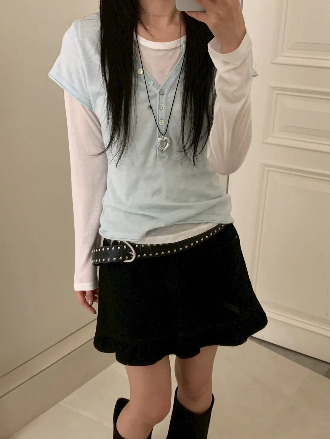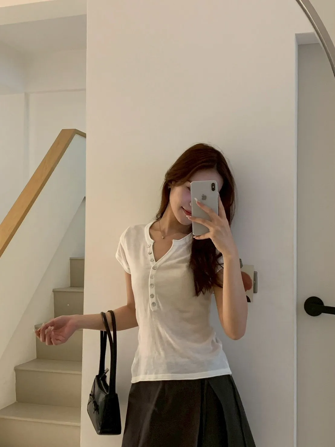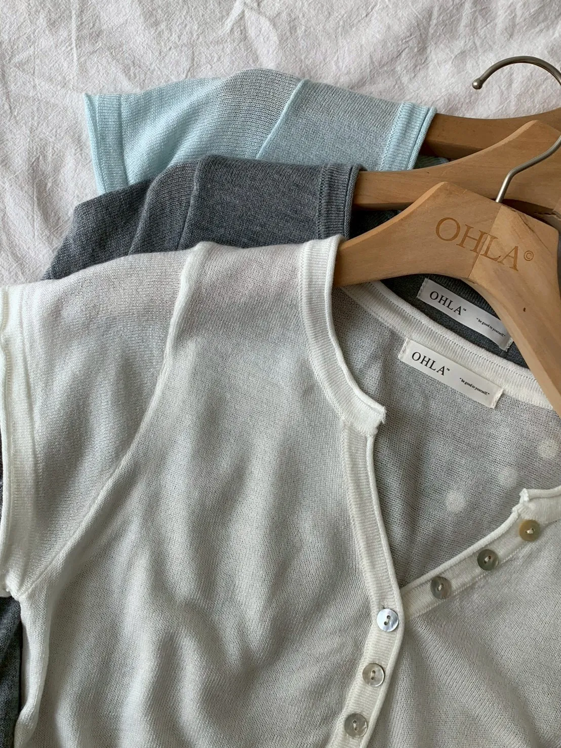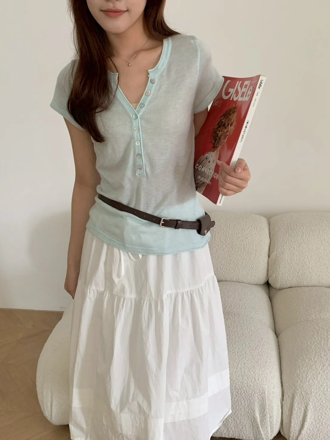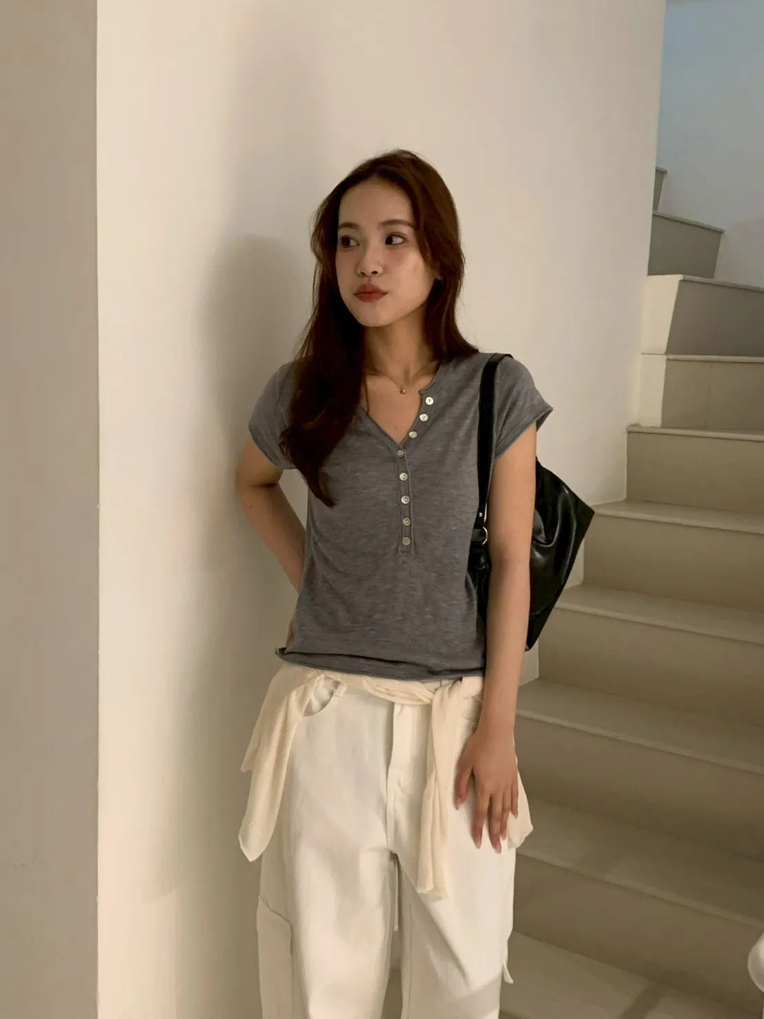 開V貝殼釦微透針織素T