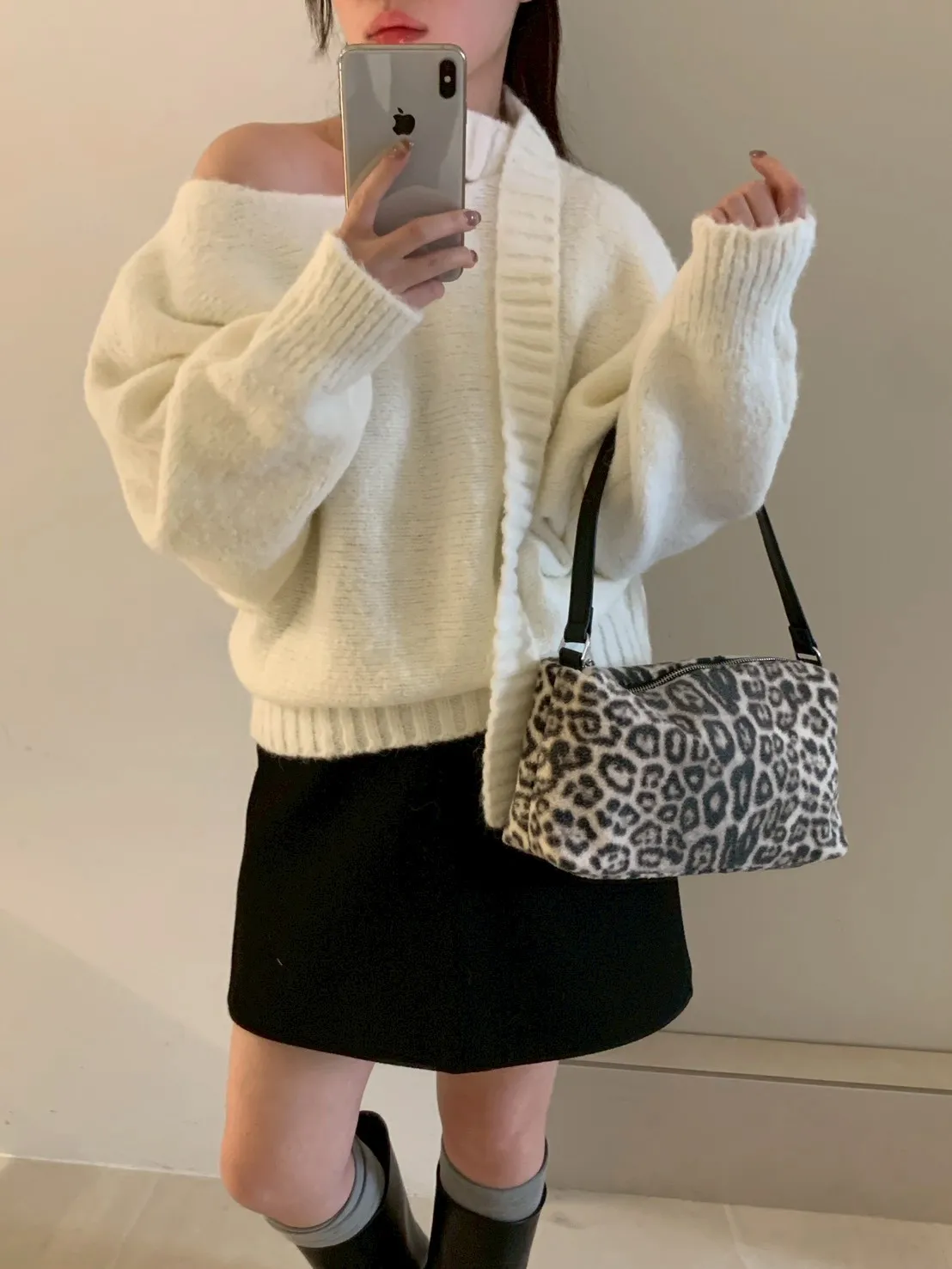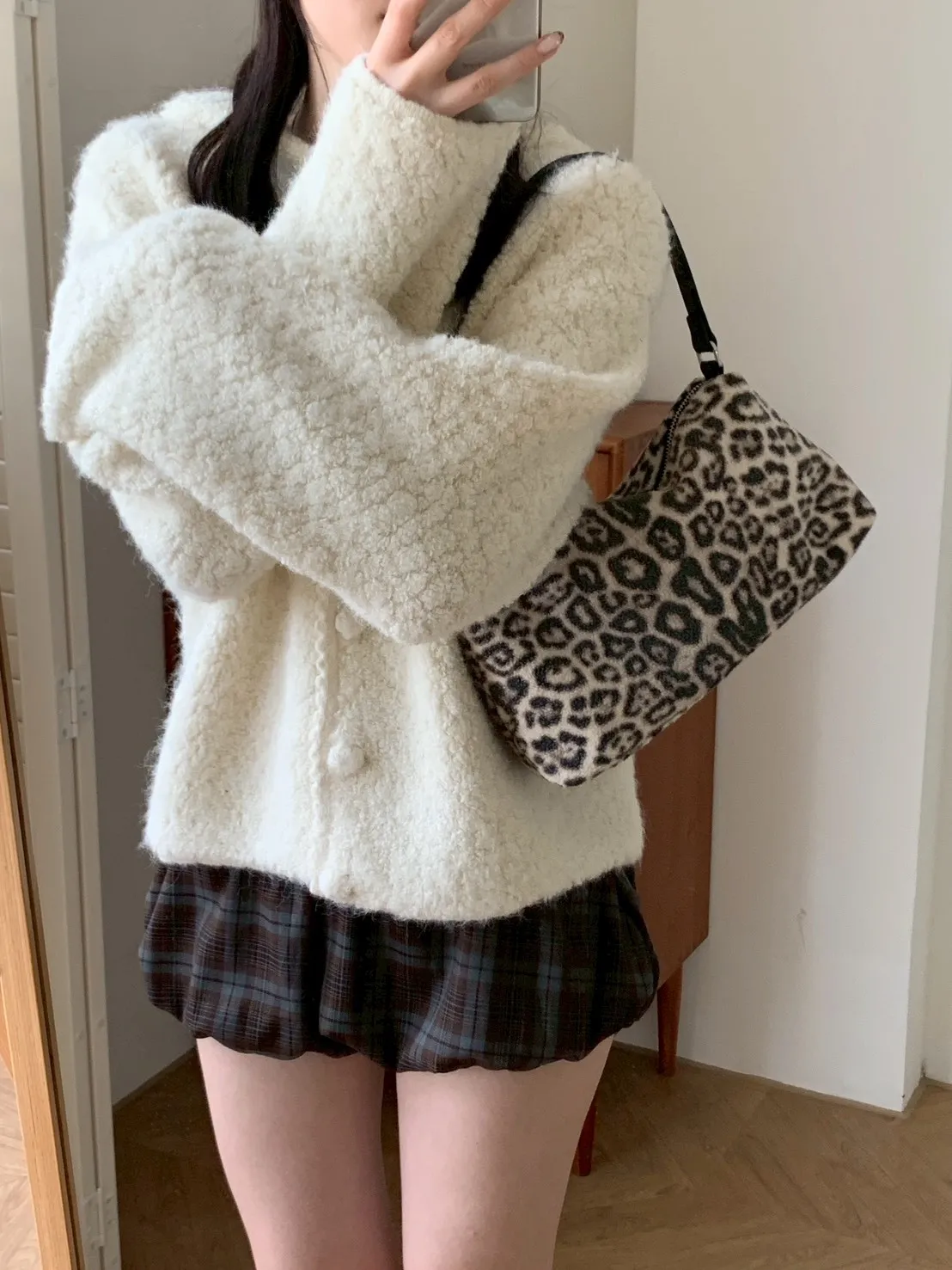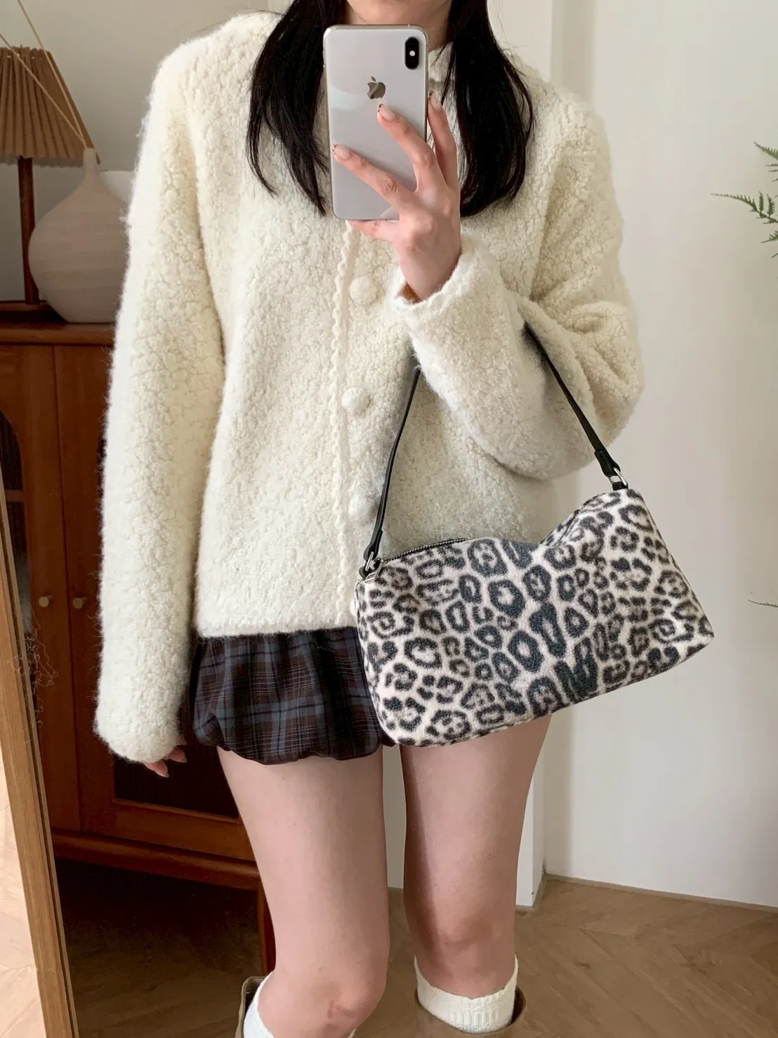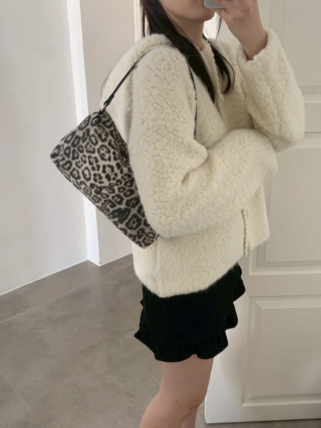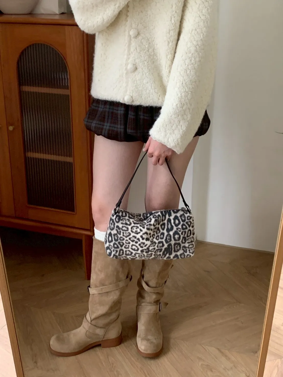 豹紋羊羔毛拉鍊長方腋下包